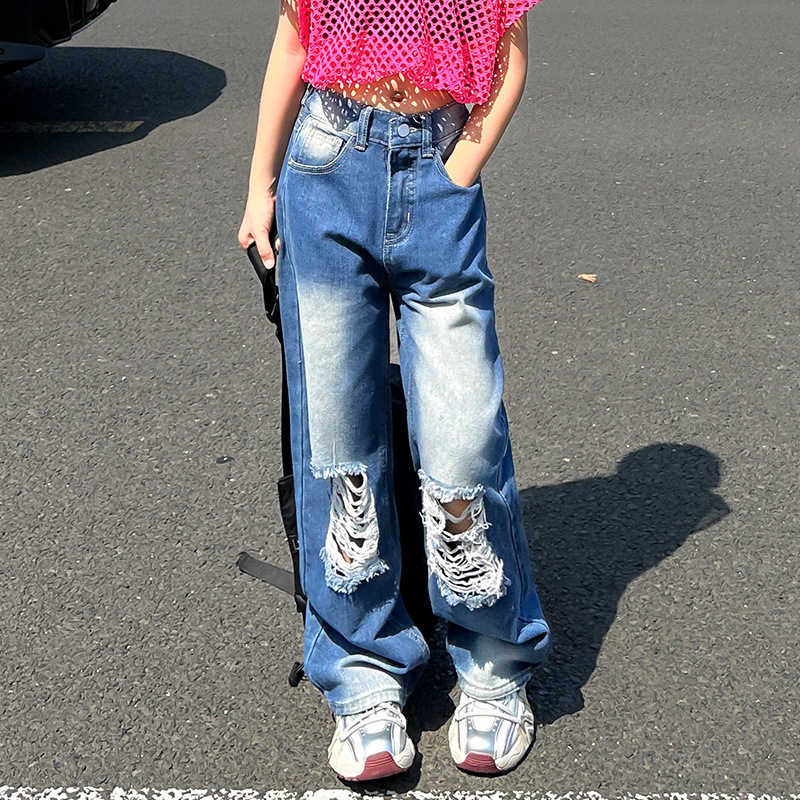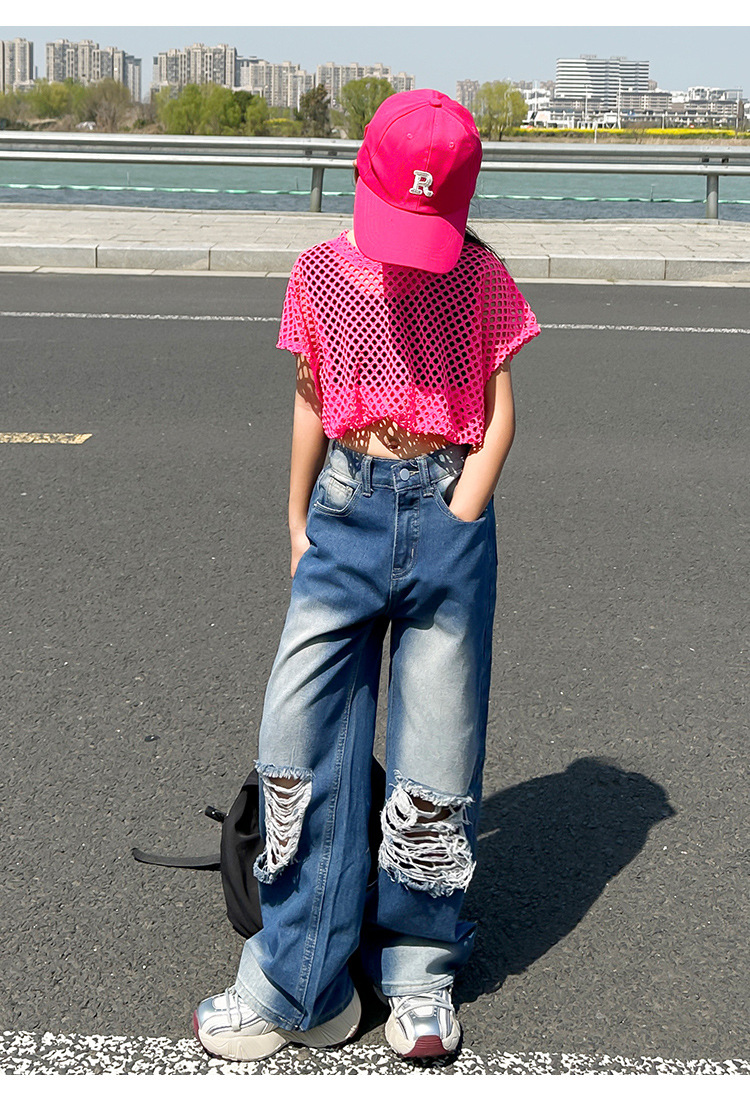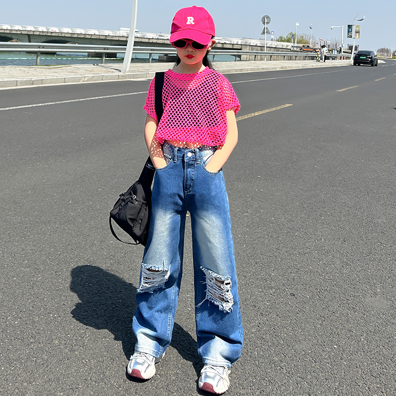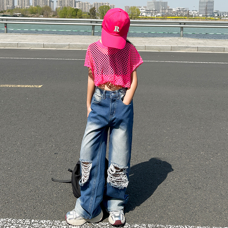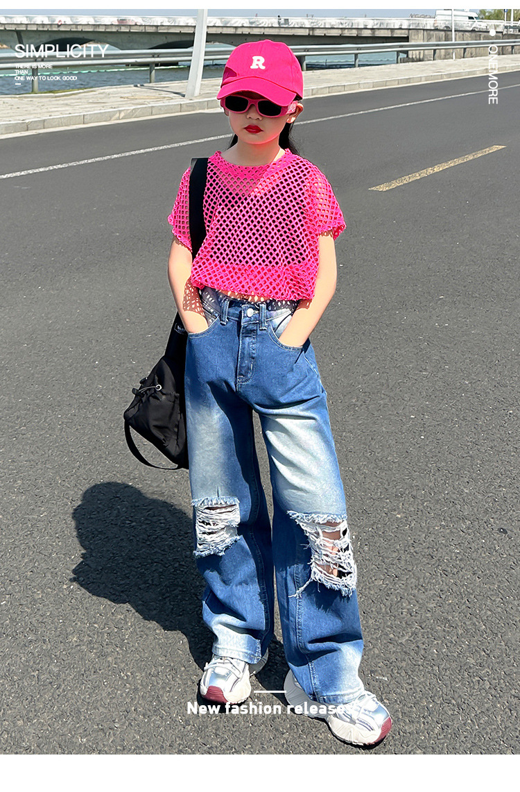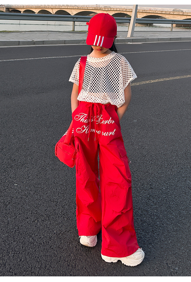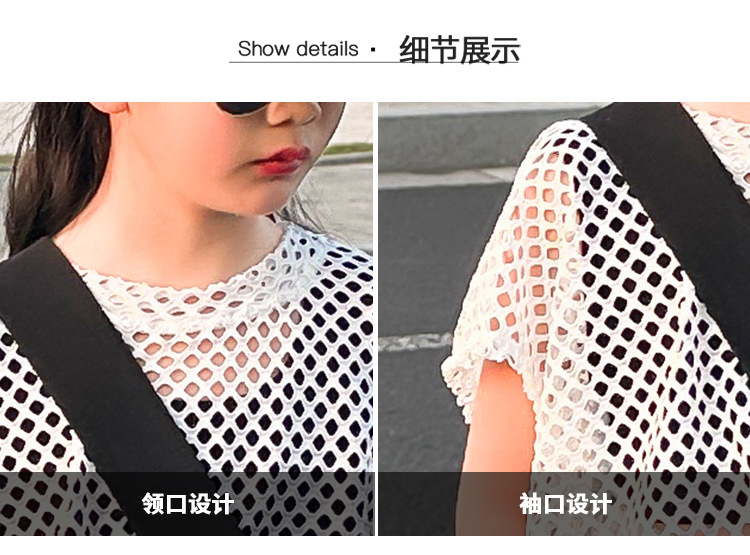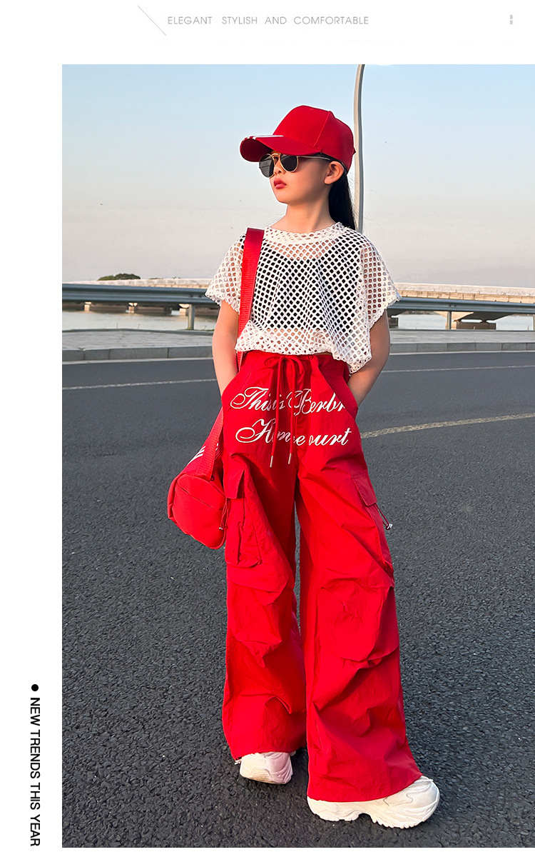걸스 세트 2025 여름 미들 및 빅 키즈를위한 새로운 유행 작업복 메쉬 티셔츠 느슨한 세련된 스트리트 댄스 두 조각
