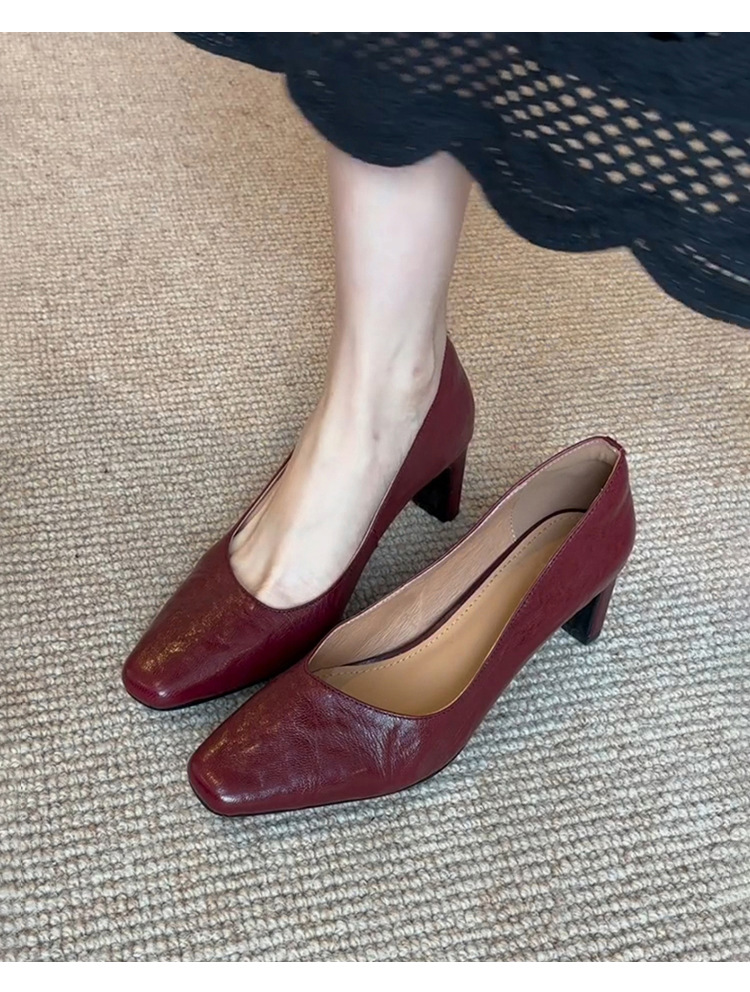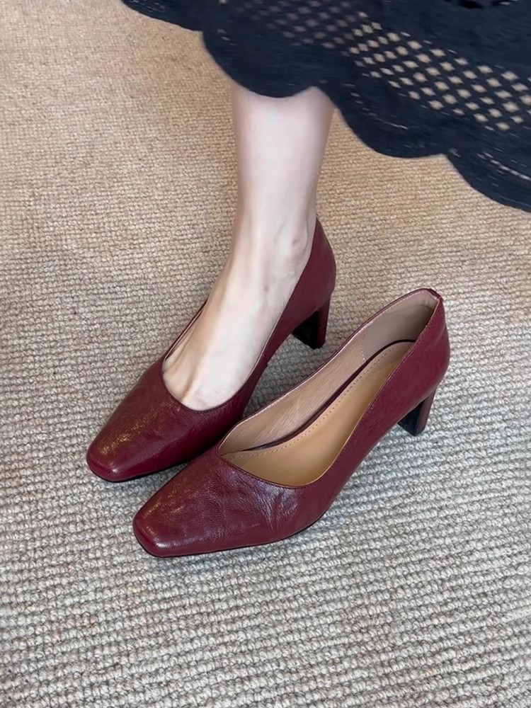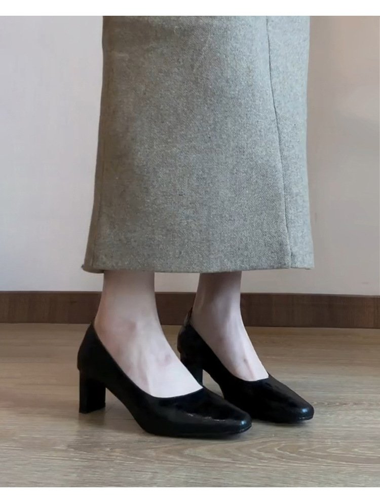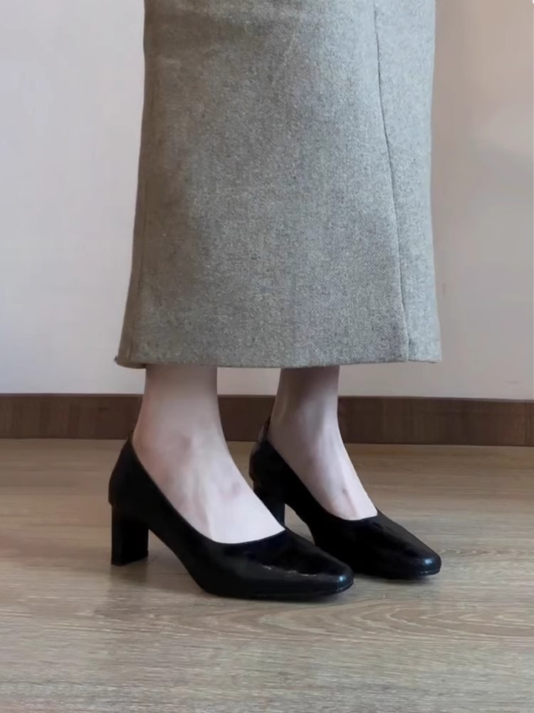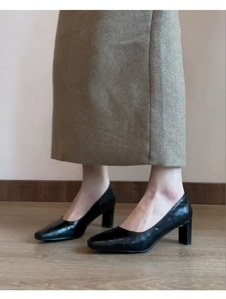 신상 주름 레트로 스타일 여성용 하이힐, 스퀘어토, 굽이 두꺼운, 앞트임, 출퇴근용, 슬립온, 가죽 신발스토어 가기