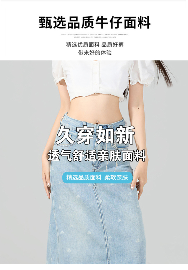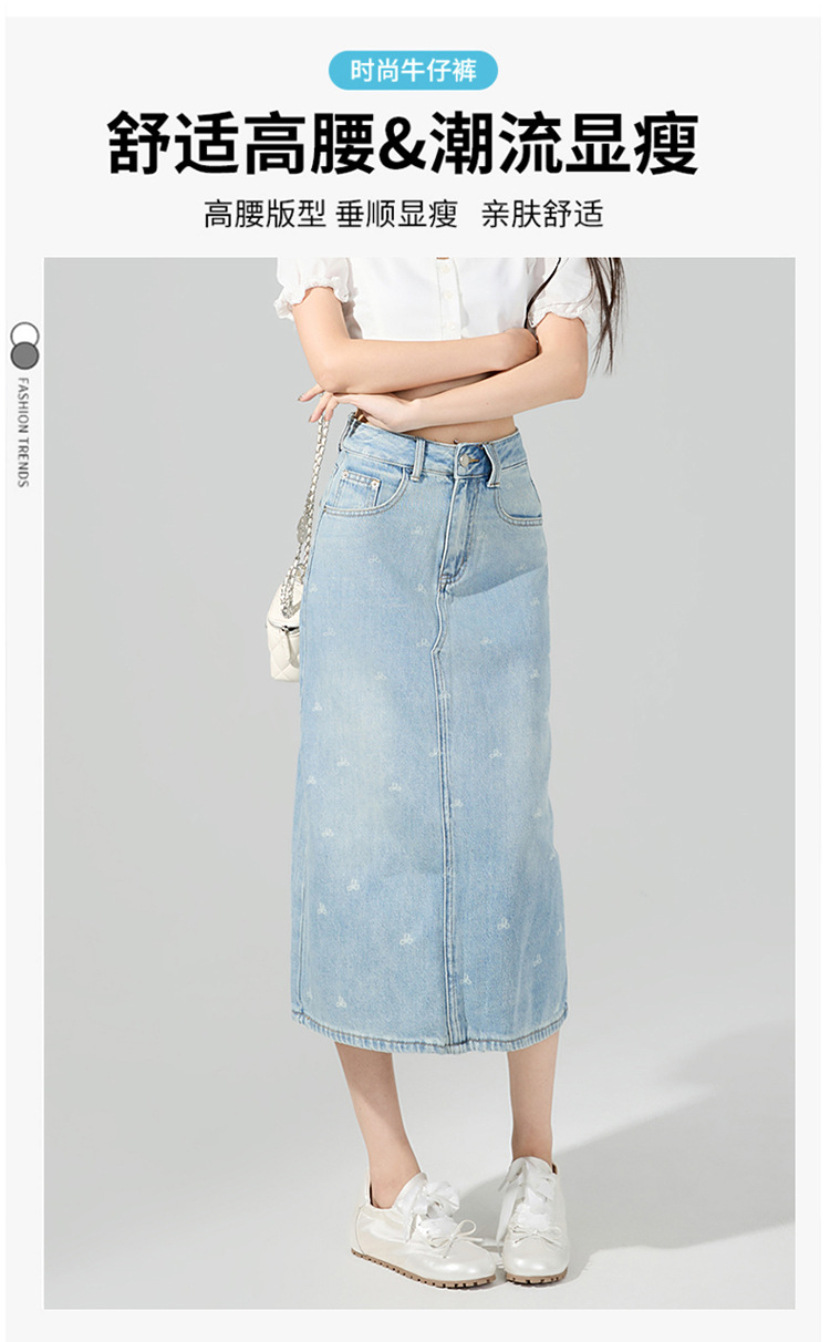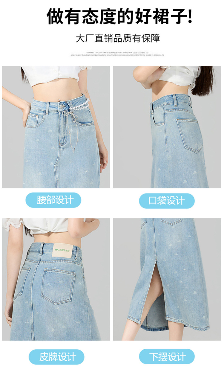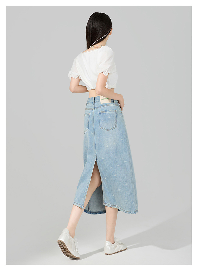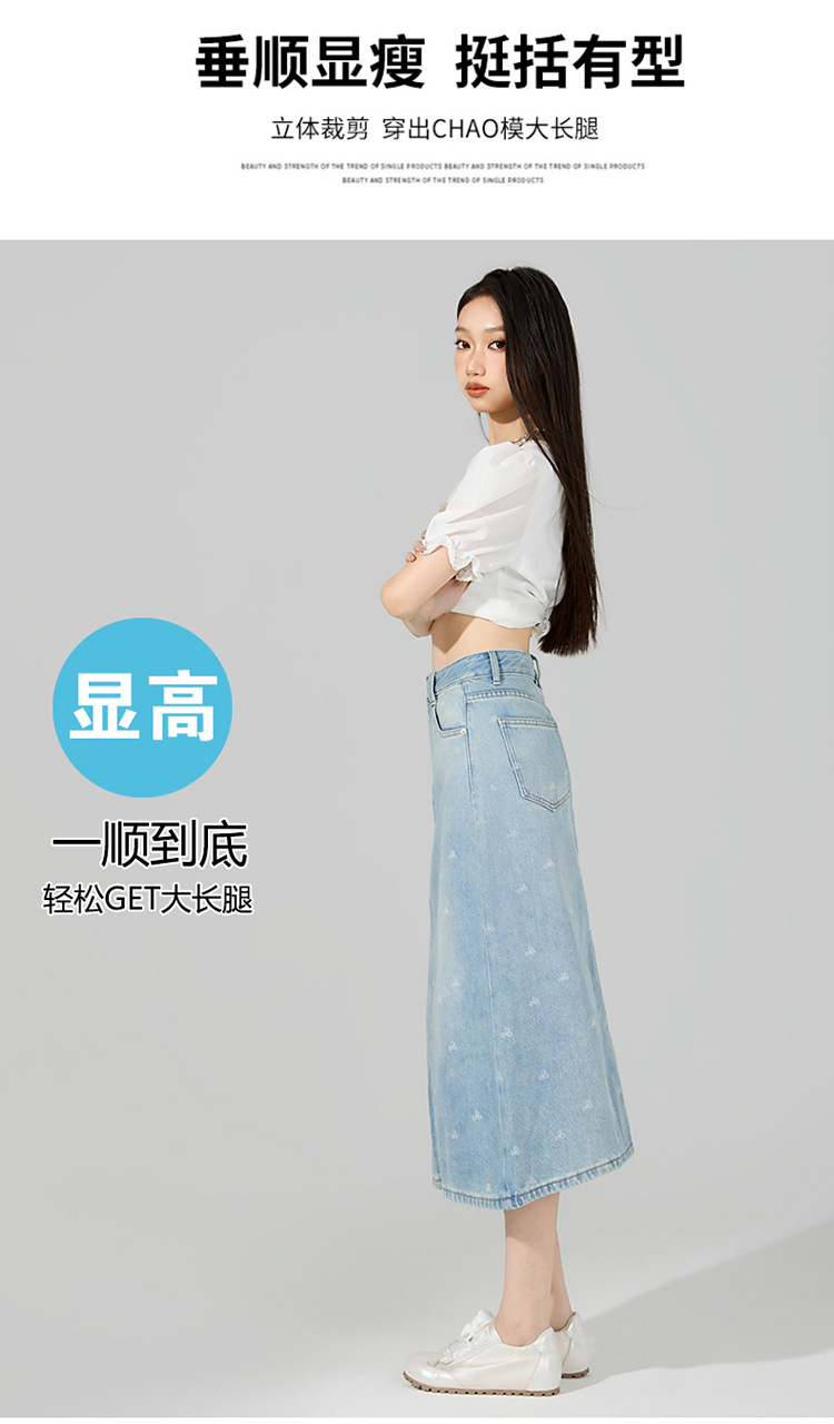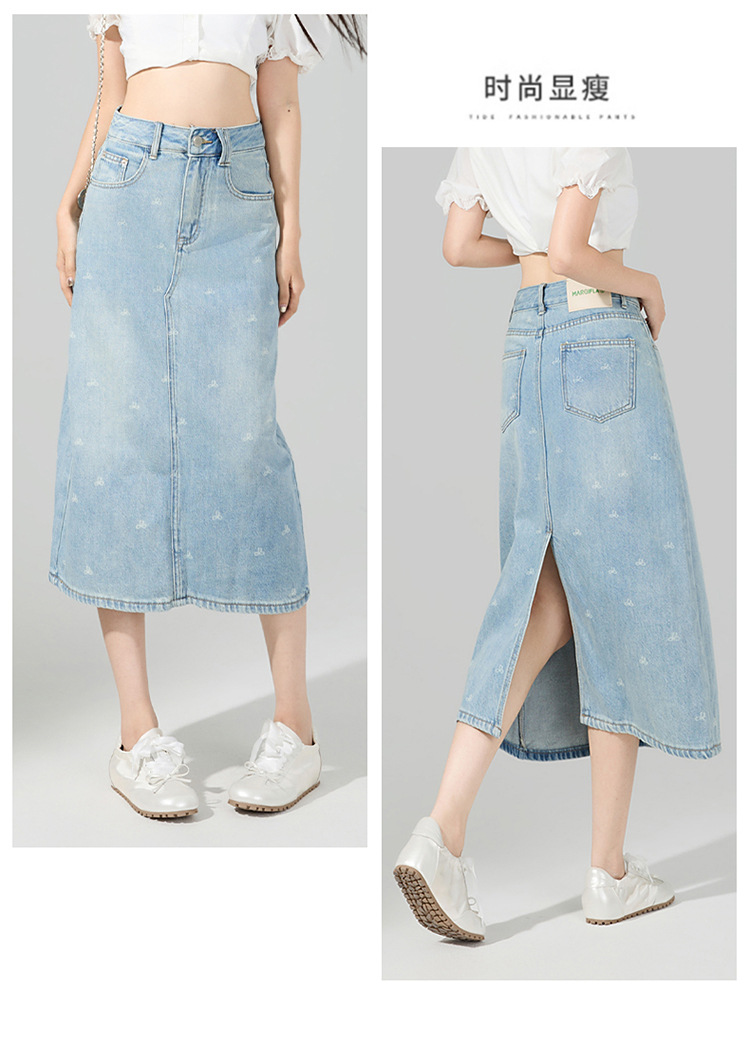 여성용 슬릿 데님 스커트 여름 얇은 대형 배형 바디 디자인 나비 프린트 a 라인 롱 스커트스토어 가기