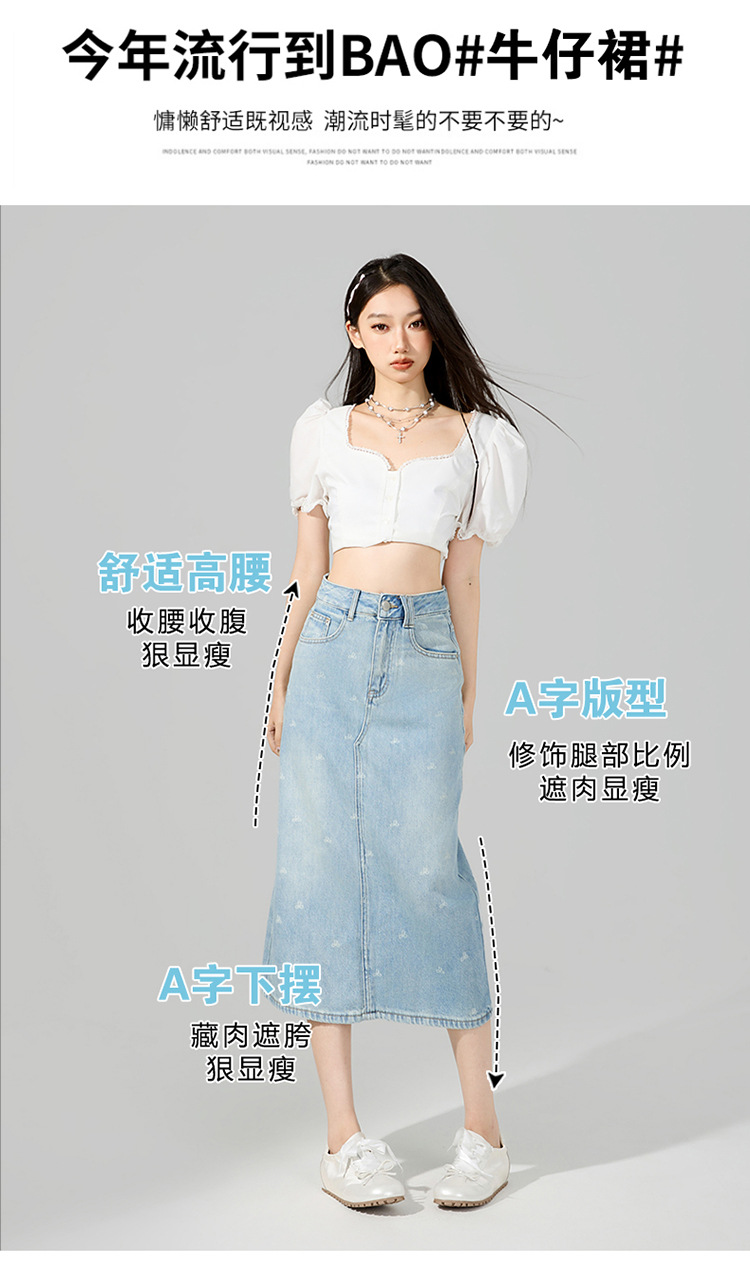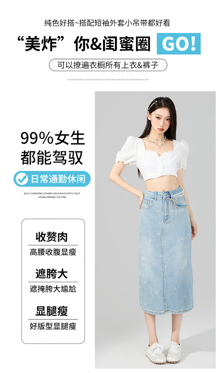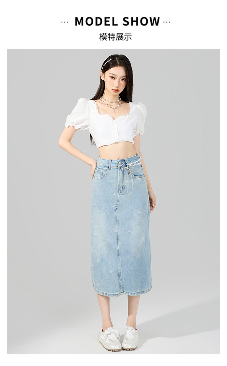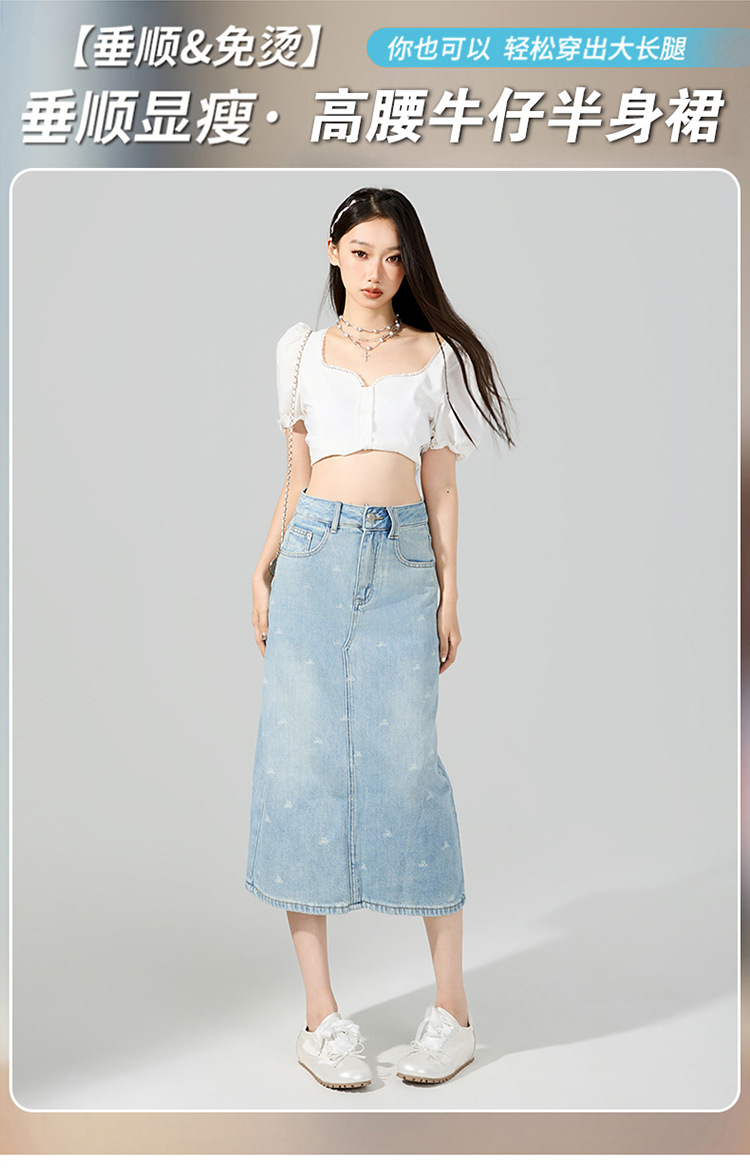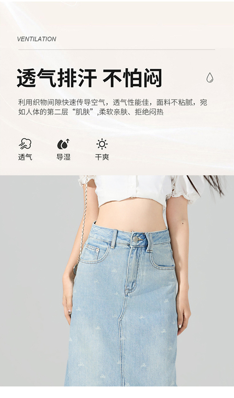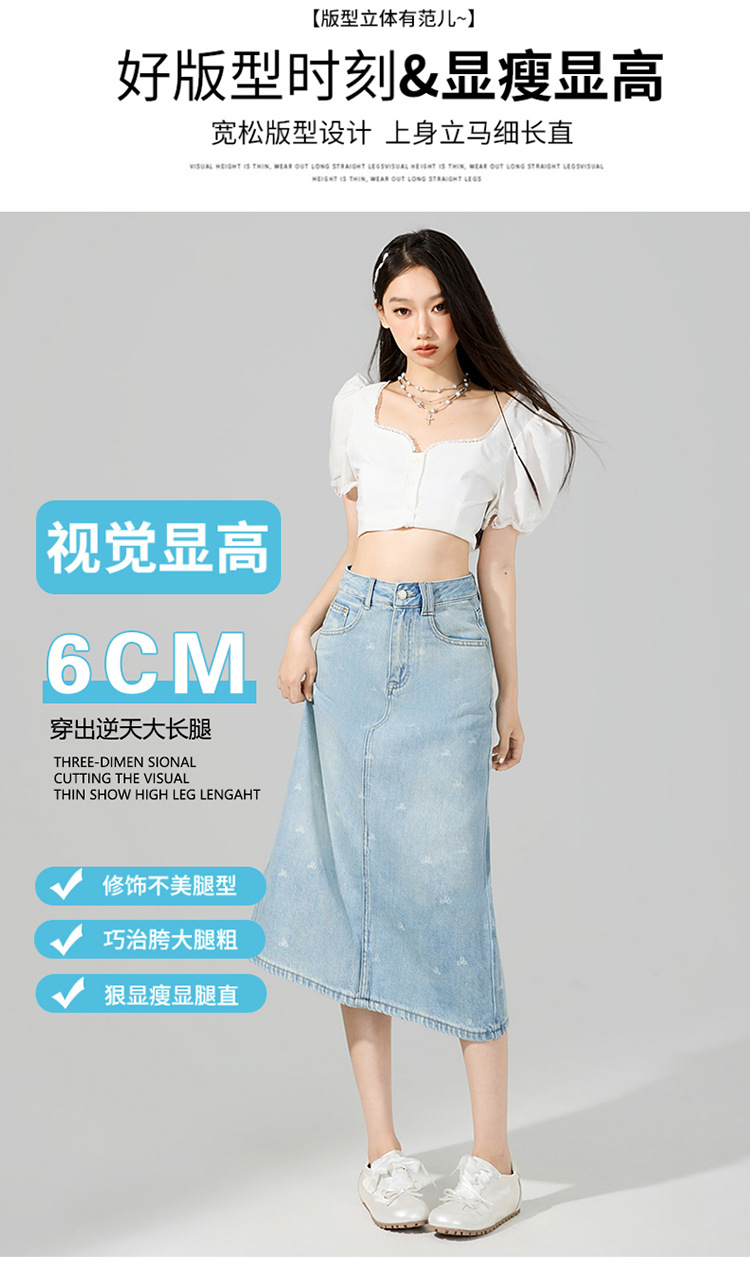 여성용 슬릿 데님 스커트 여름 얇은 대형 배형 바디 디자인 나비 프린트 a 라인 롱 스커트스토어 가기