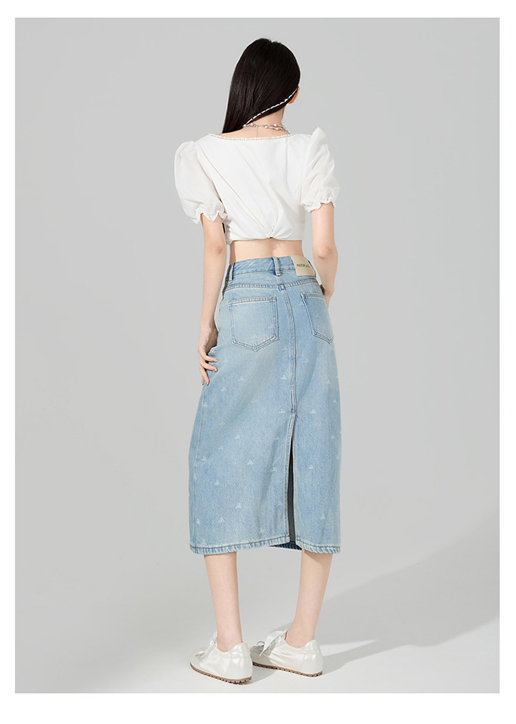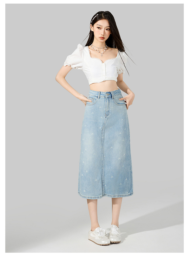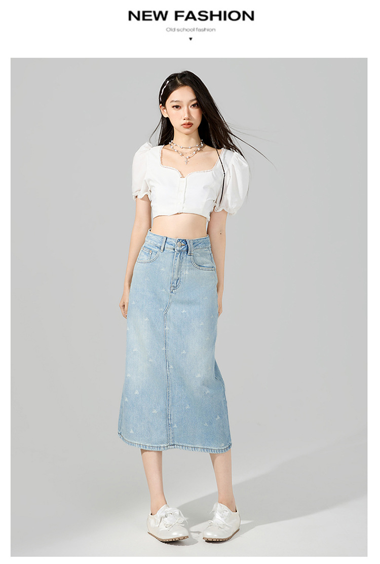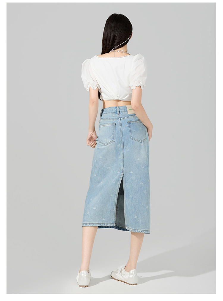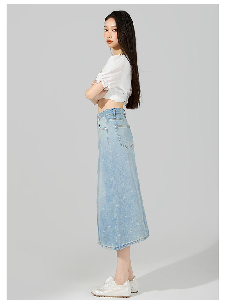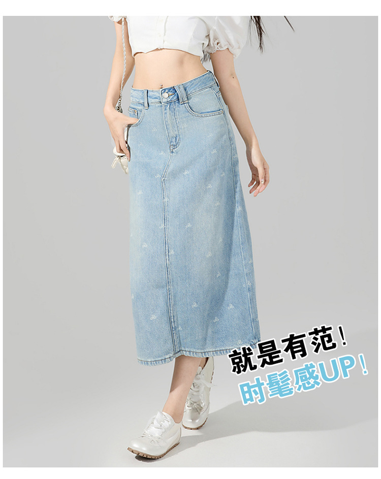 여성용 슬릿 데님 스커트 여름 얇은 대형 배형 바디 디자인 나비 프린트 a 라인 롱 스커트