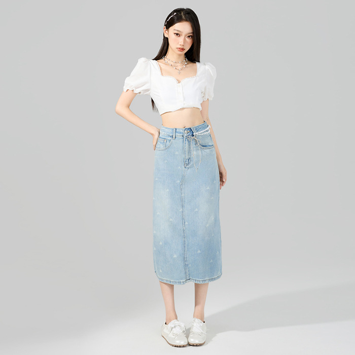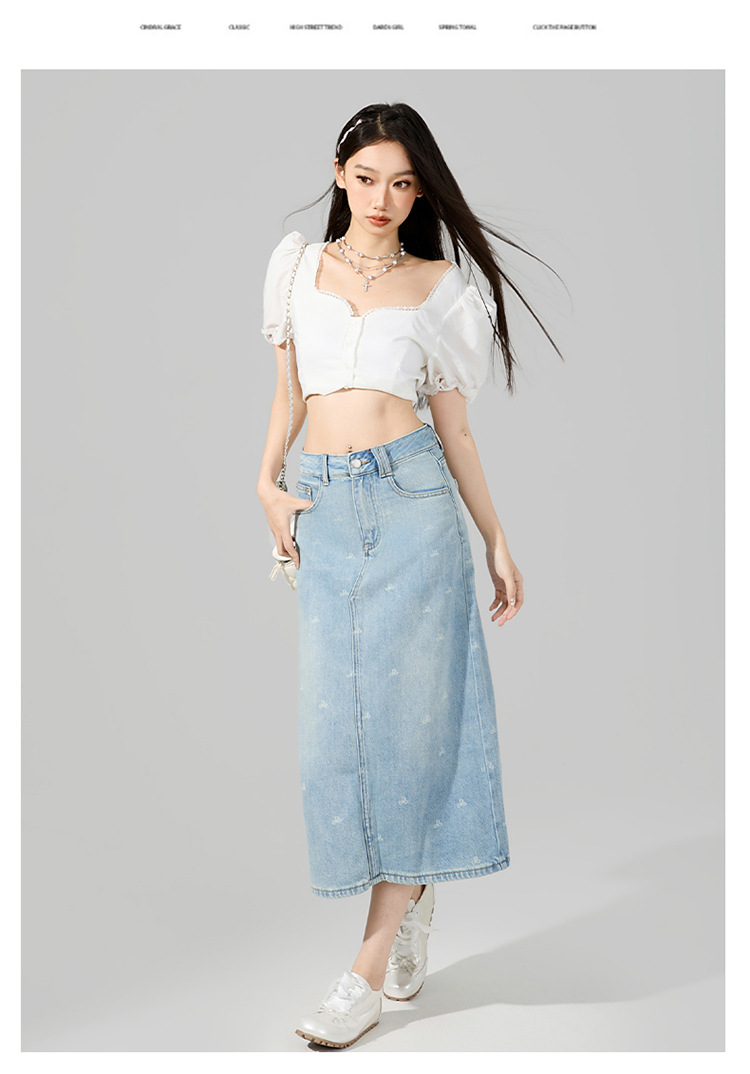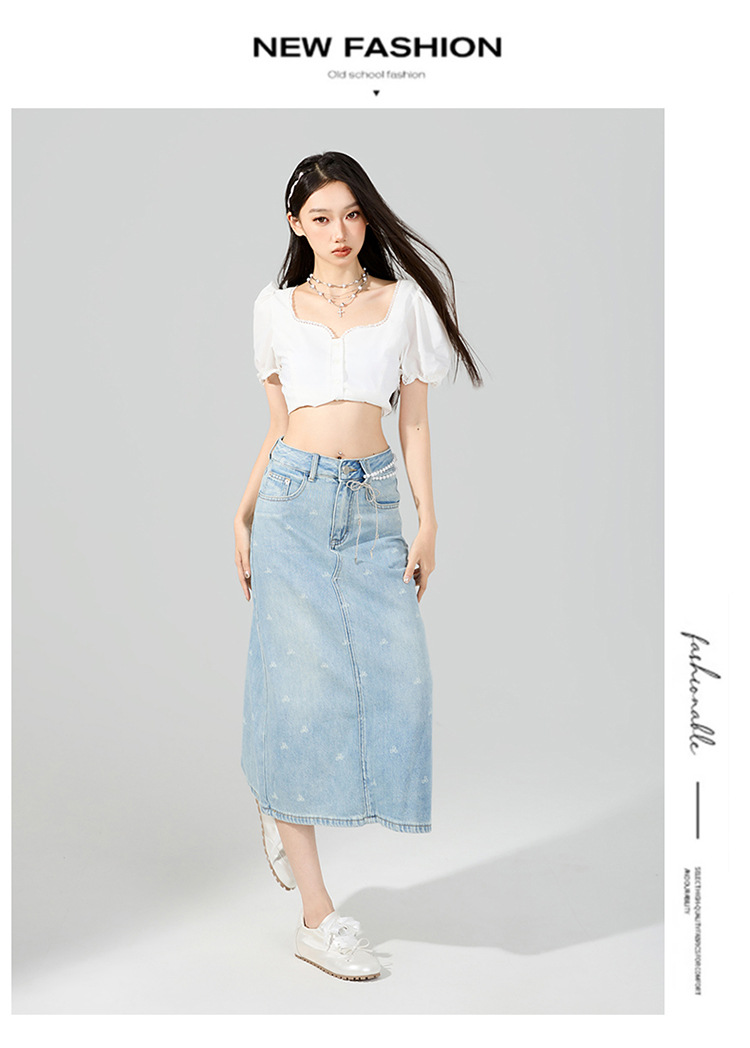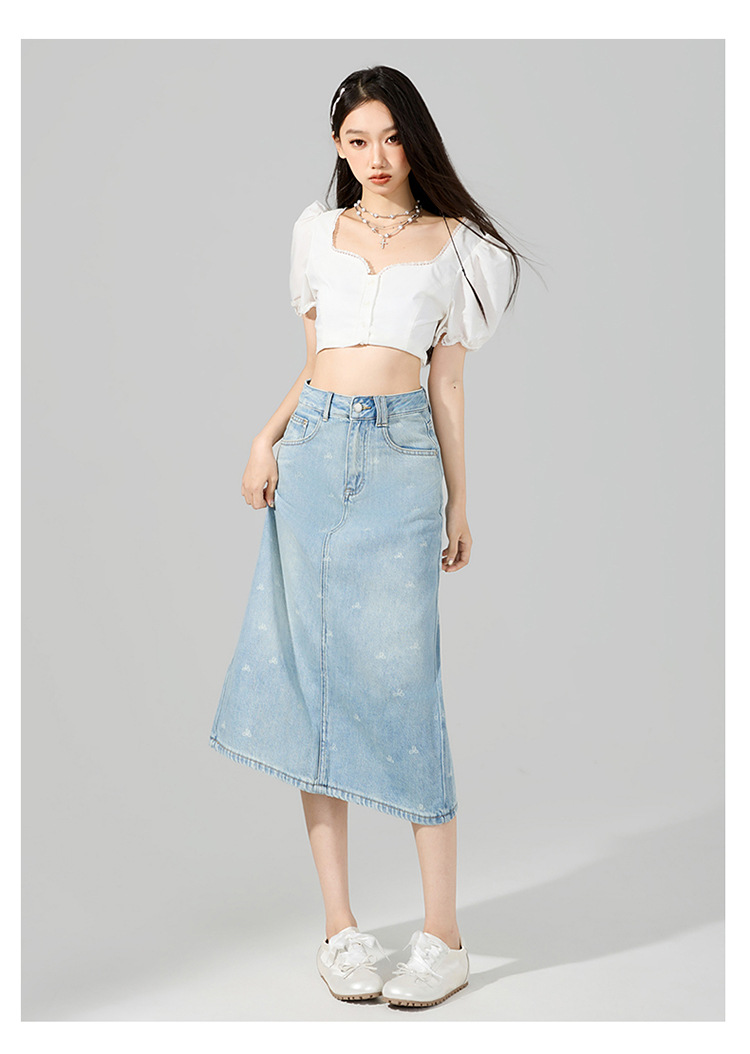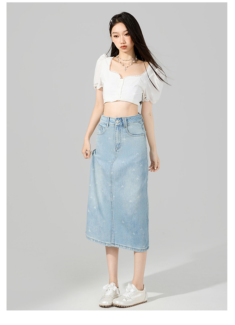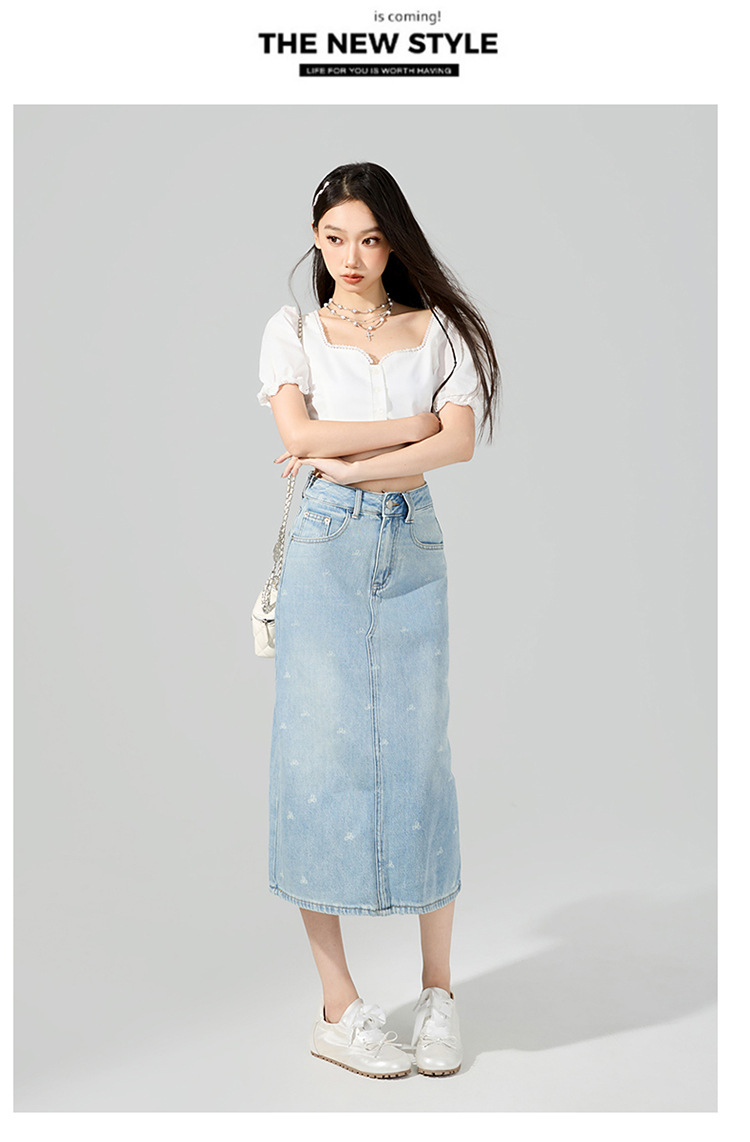 여성용 슬릿 데님 스커트 여름 얇은 대형 배형 바디 디자인 나비 프린트 a 라인 롱 스커트