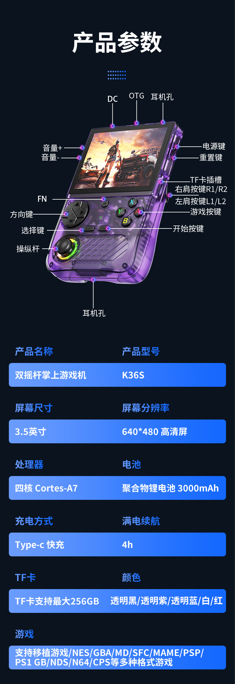 새로운 K36S 휴대용 게임 콘솔 싱글 로커 PSP 게임 콘솔 풀 뷰 HD 복고풍 아케이드 국경 폭발