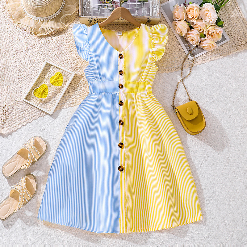 여성 중대형 아동복 대외 무역 어린이 원피스 2025 여름 새로운 스타일리스트 플라잉 슬리브 스트라이프 공주 원피스 배치 트렌드