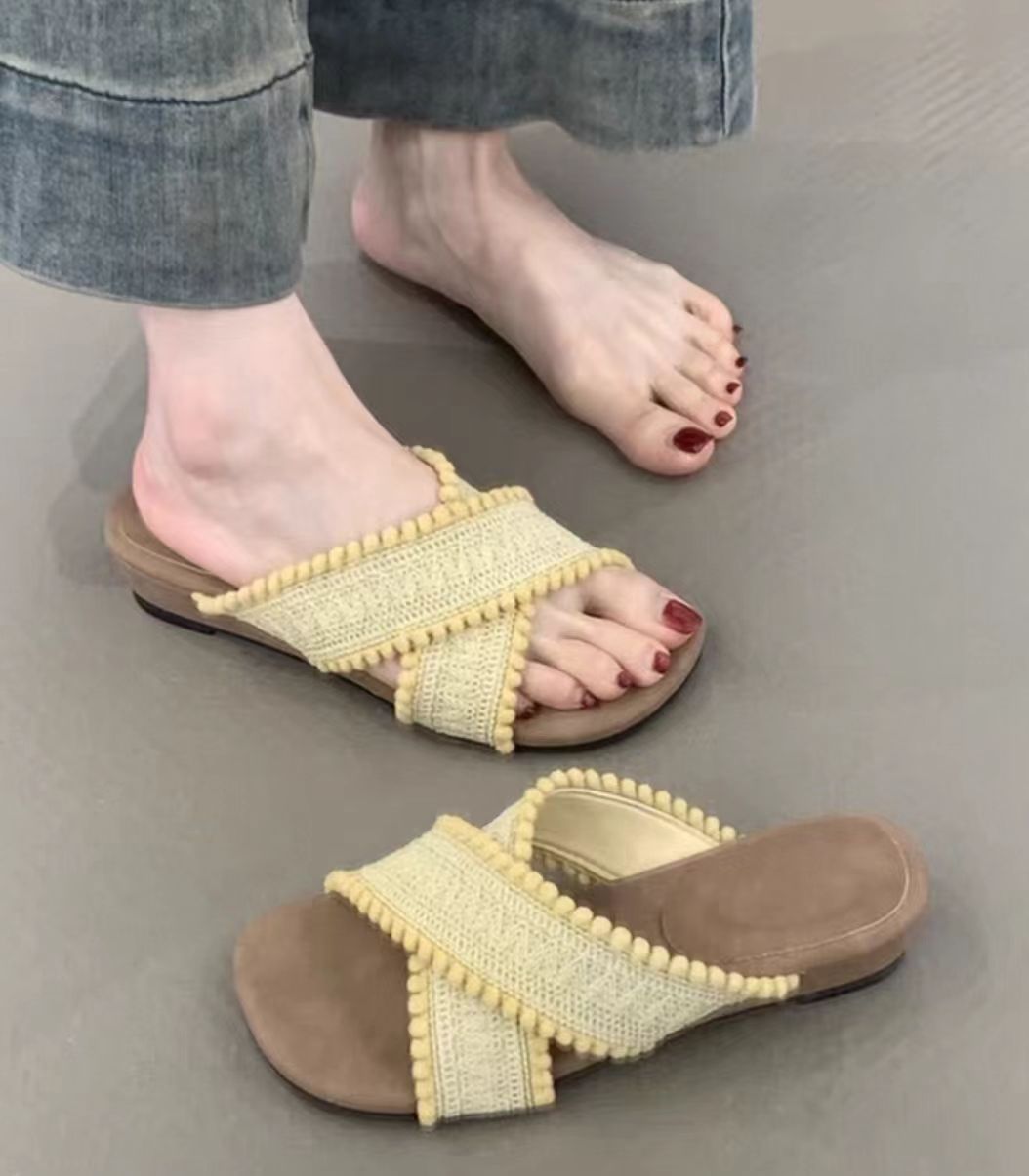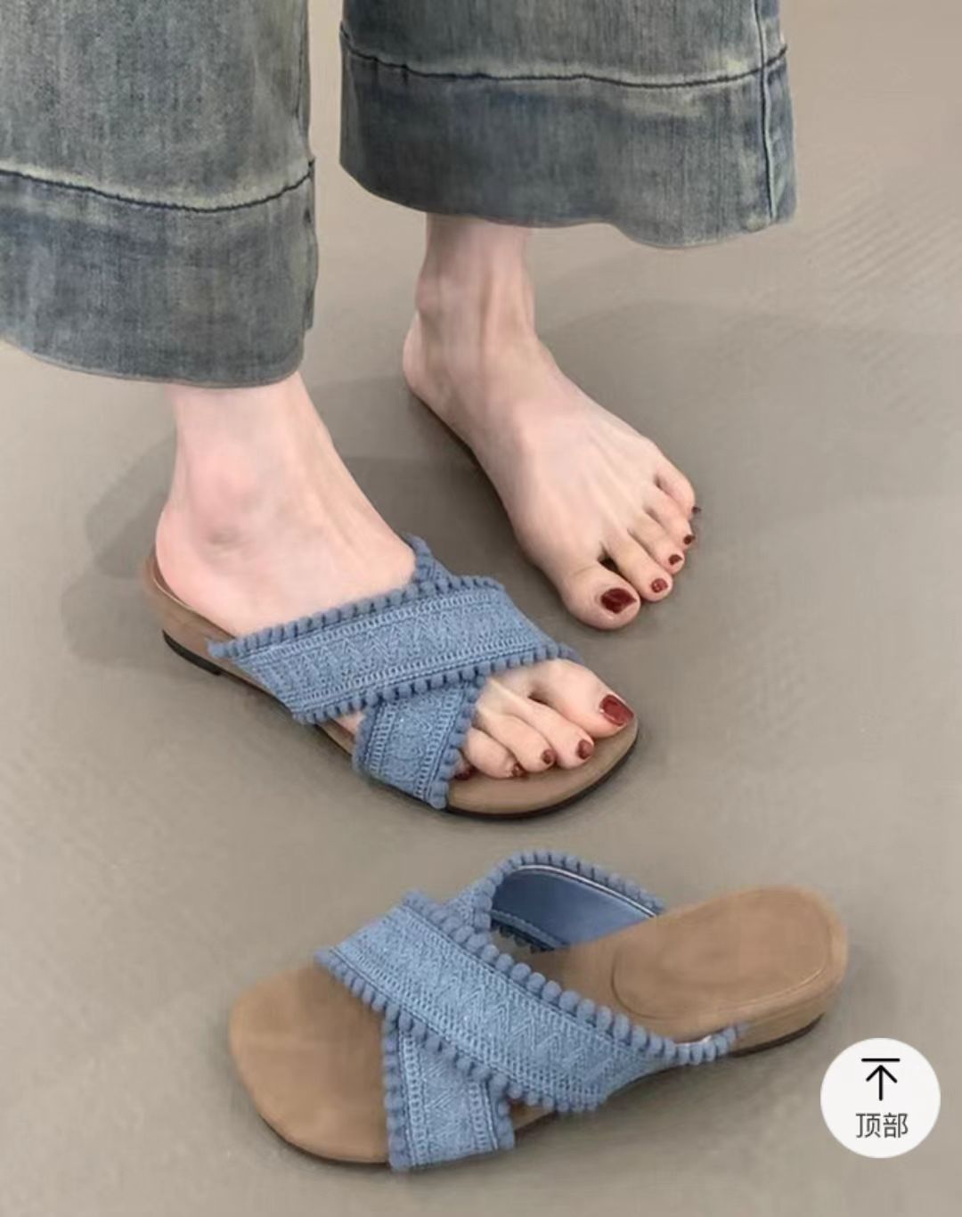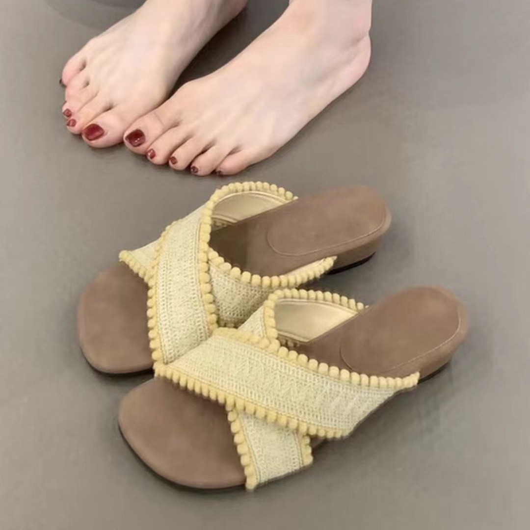 2025년 여름 신상 크로스 스트랩 린넨 두꺼운 밑창 웨지힐 게으른 여성용 비치 휴가 하프 슬리퍼스토어 가기