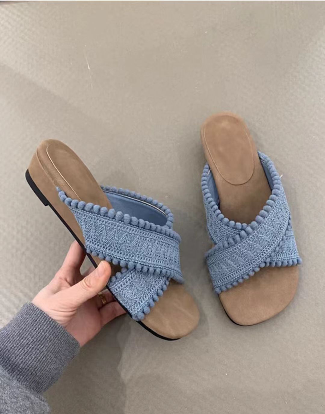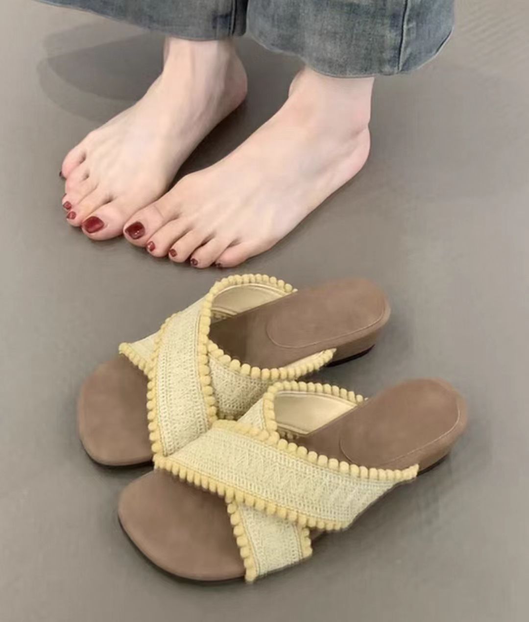 2025년 여름 신상 크로스 스트랩 린넨 두꺼운 밑창 웨지힐 게으른 여성용 비치 휴가 하프 슬리퍼