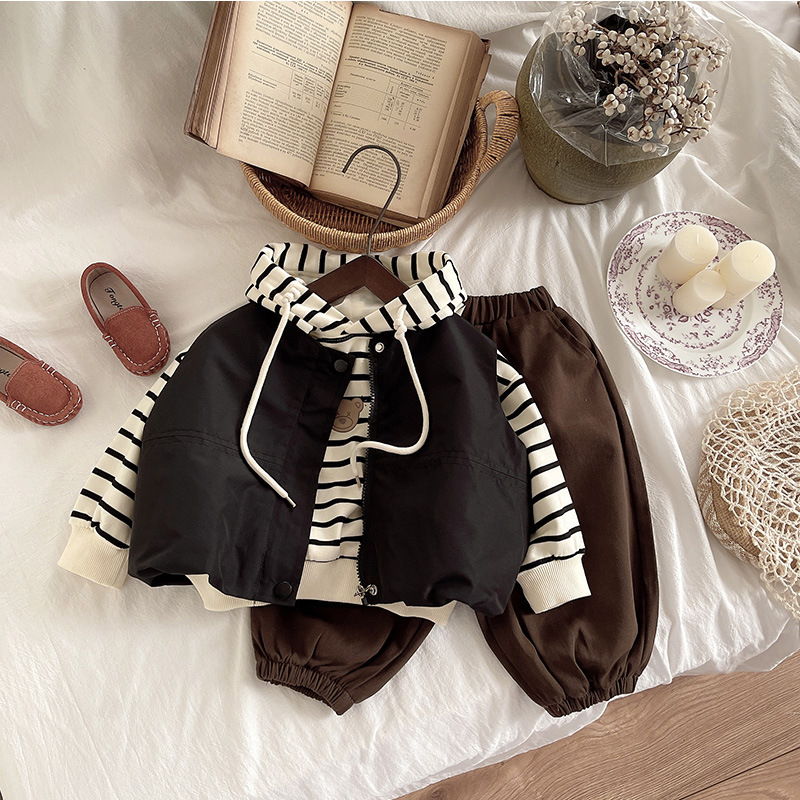 남성용 아동복 스트라이프 스포츠 캐주얼 스타일 후드 보이즈 탑 남자 가을 얇은 조끼 중립 봄과 가을 3 종 세트스토어 가기