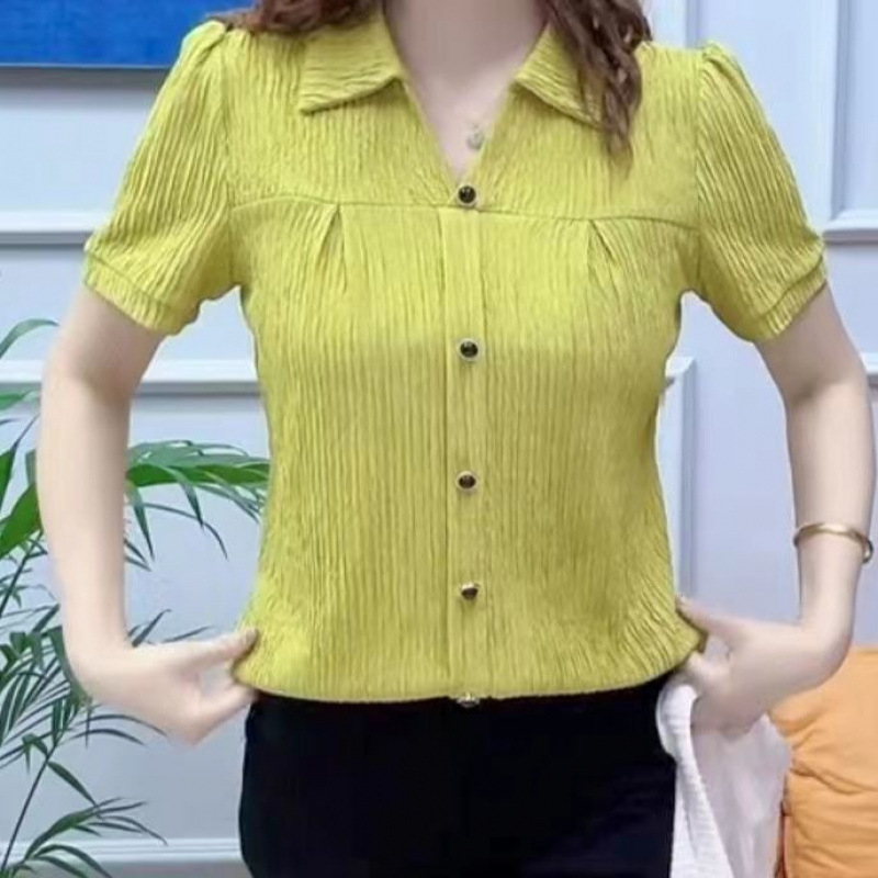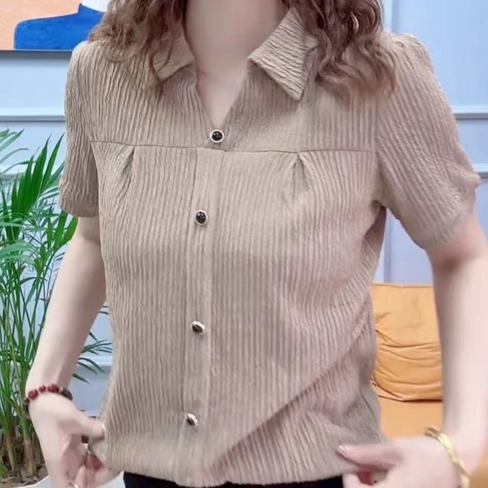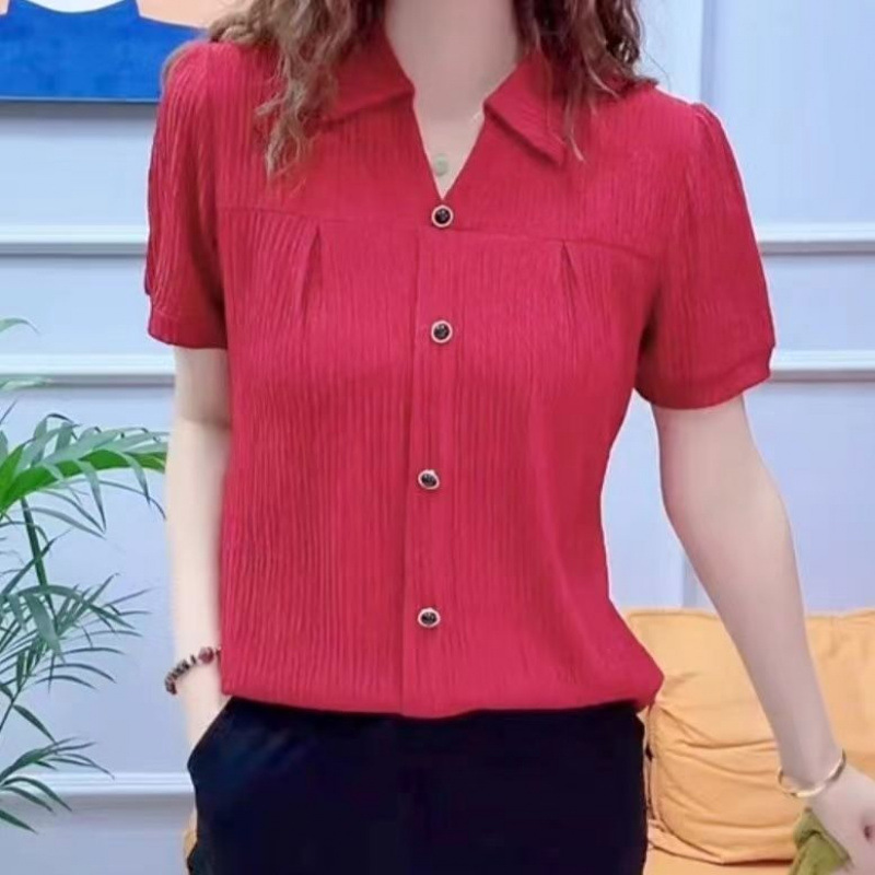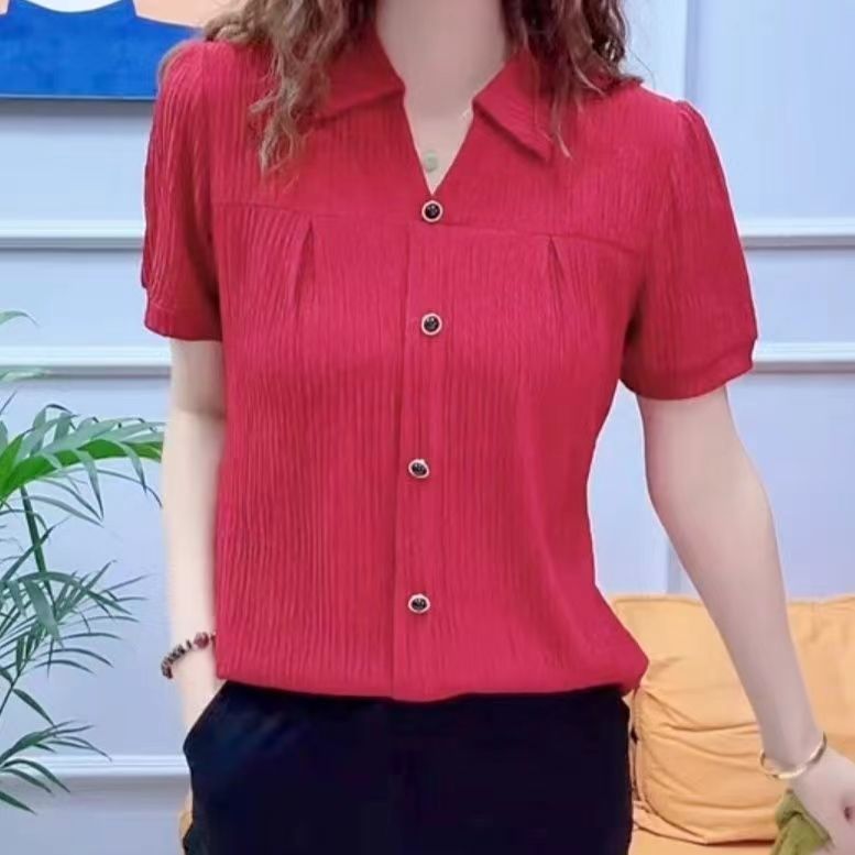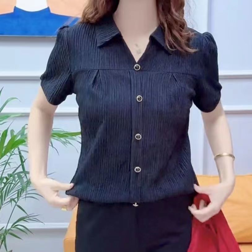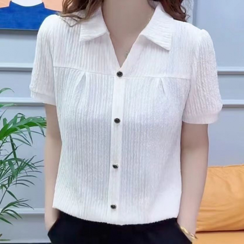 폭발성 여성 칼라 우아한 하프 오픈 반소매 세련된 올 매치 하이 엔드 탑 패션 슬림 핏 플러스 사이즈 셔츠