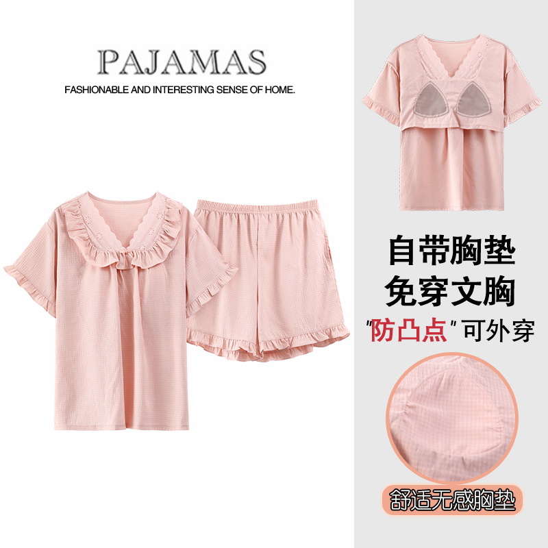 가슴 패드가있는 홈 의류 여성의 여름은 귀여운 아이스 실크 파자마 얇은 통기성 반소매 파자마 세트 도매로 나갈 수 있습니다.