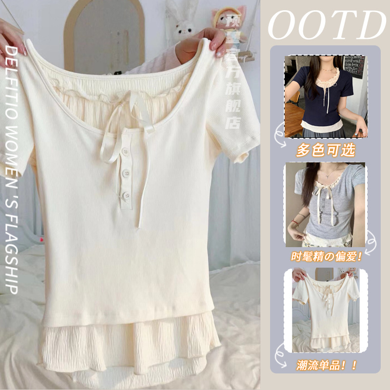 순수한 욕망 달콤한 소녀 핑크 레이스 업 어깨 티셔츠 여름 여성의 짧은 슬림-맞는 뜨거운 소녀 곰팡이스토어 가기