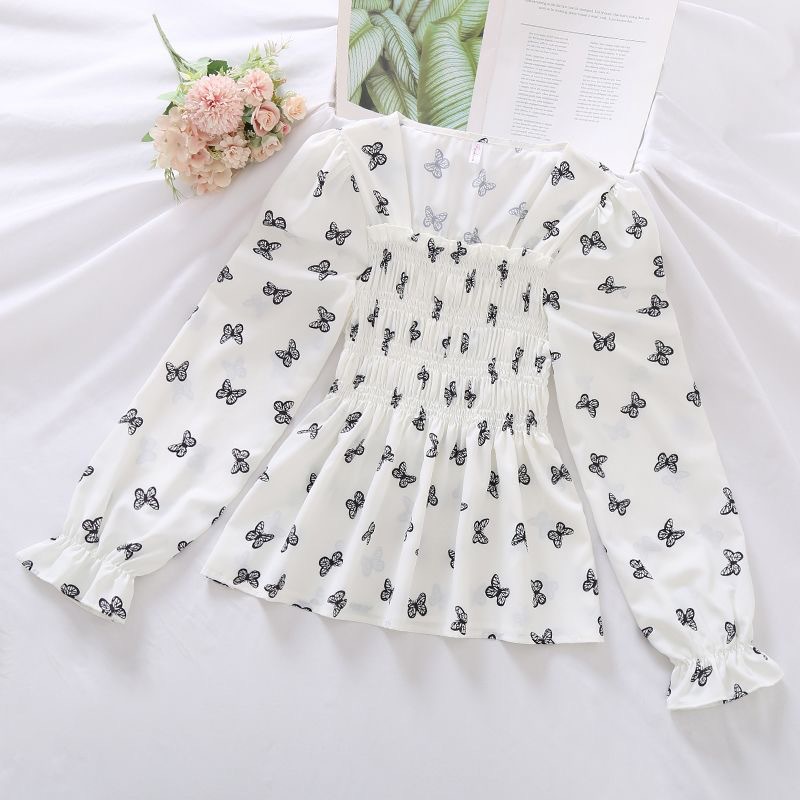 2024 새로운 가을 스타일 프렌치 섹시하고 세련된 쉬폰 셔츠 퍼프 슬리브 기질 허리 슬리밍 스위트 다용도 탑스토어 가기