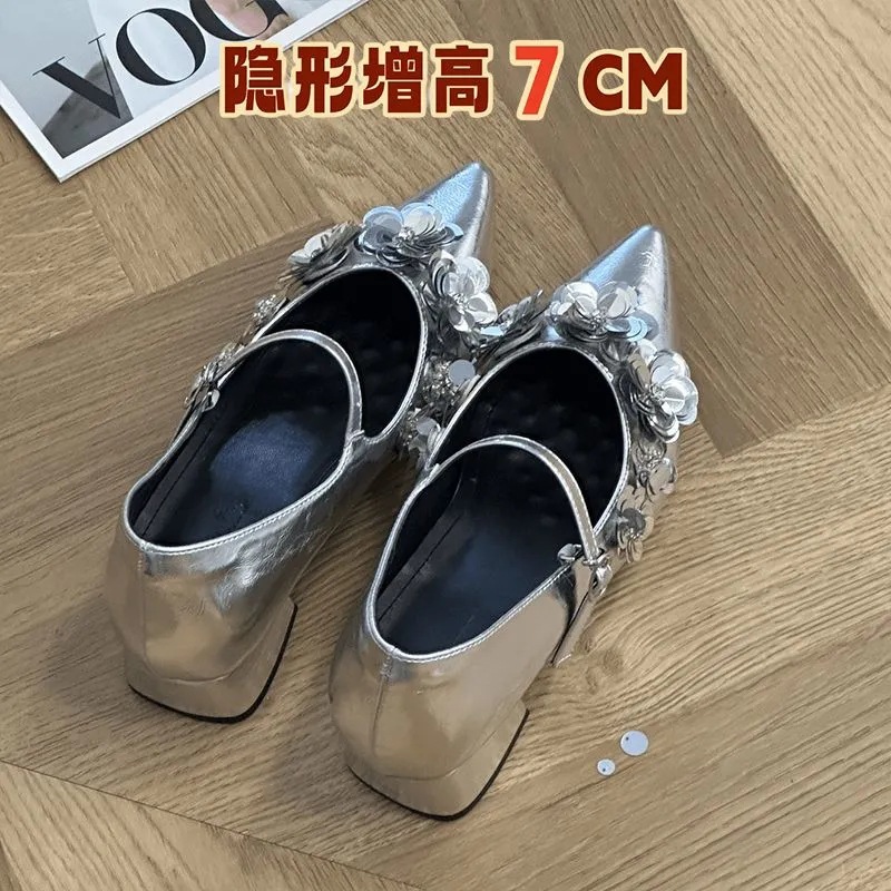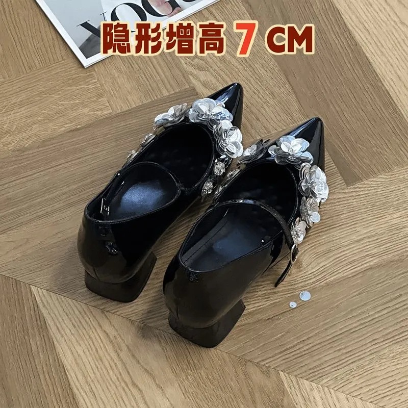 내부 높이 7CM 포인팅 Sequins Mary Jane 여성 신발 작은 한 줄 부드러운 가죽 통근 신발 두꺼운 힐스토어 가기