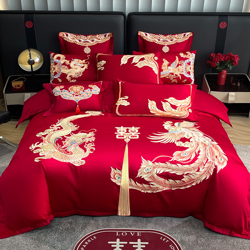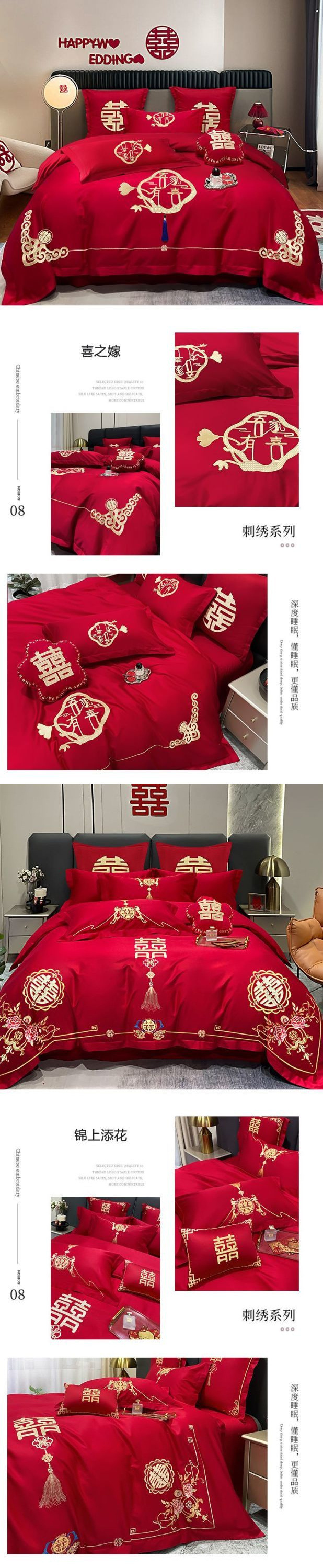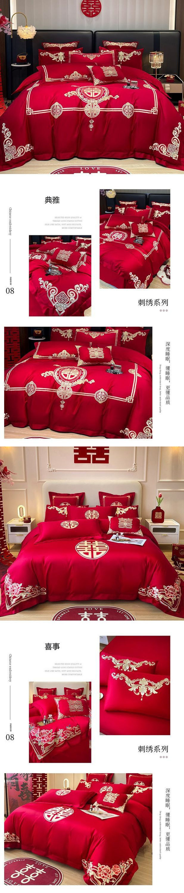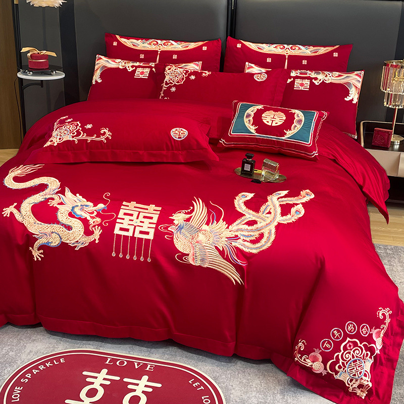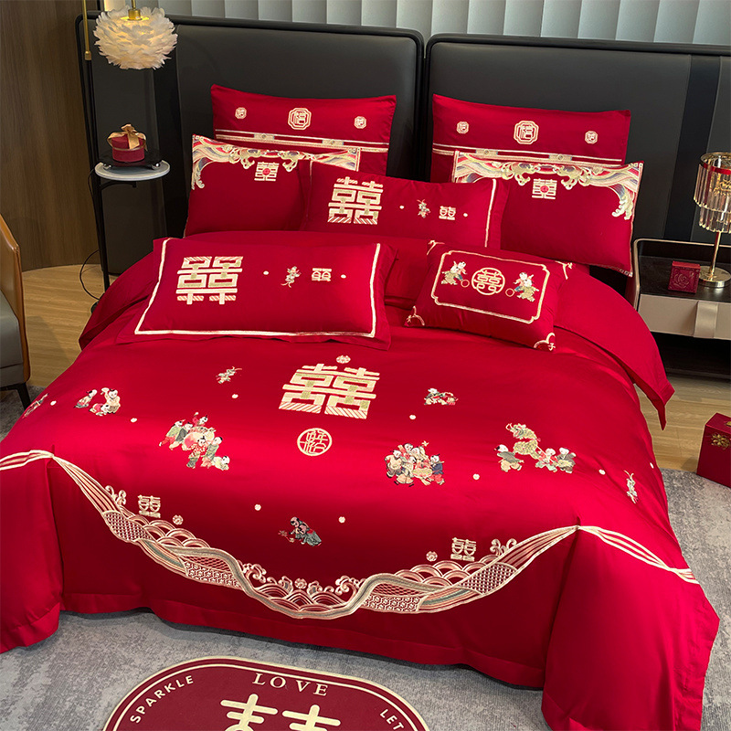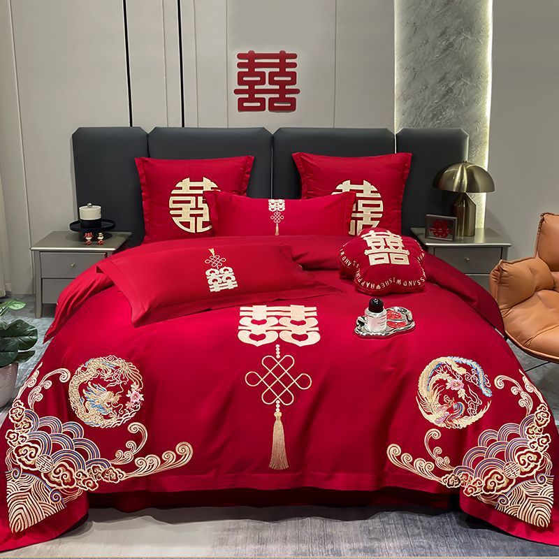웨딩 4종 세트 웨딩 신혼 침구 자수 이불 커버 레드 웨딩 웨딩 룸 웨딩 침대 축제 자수 세트