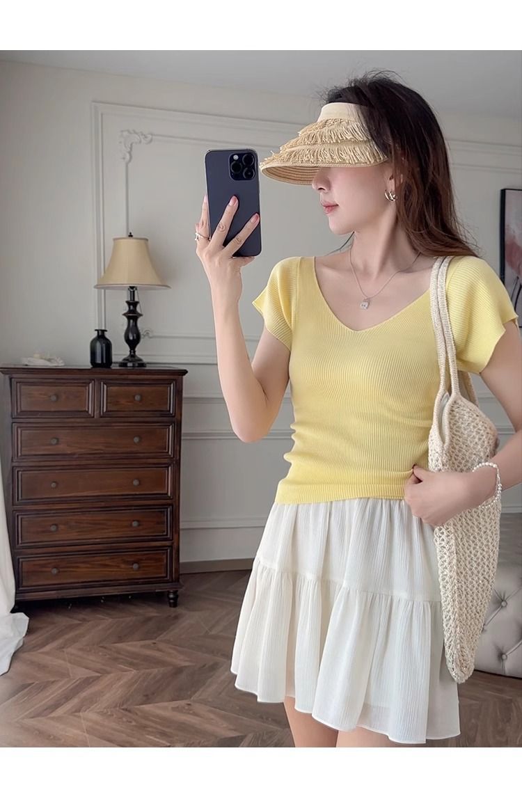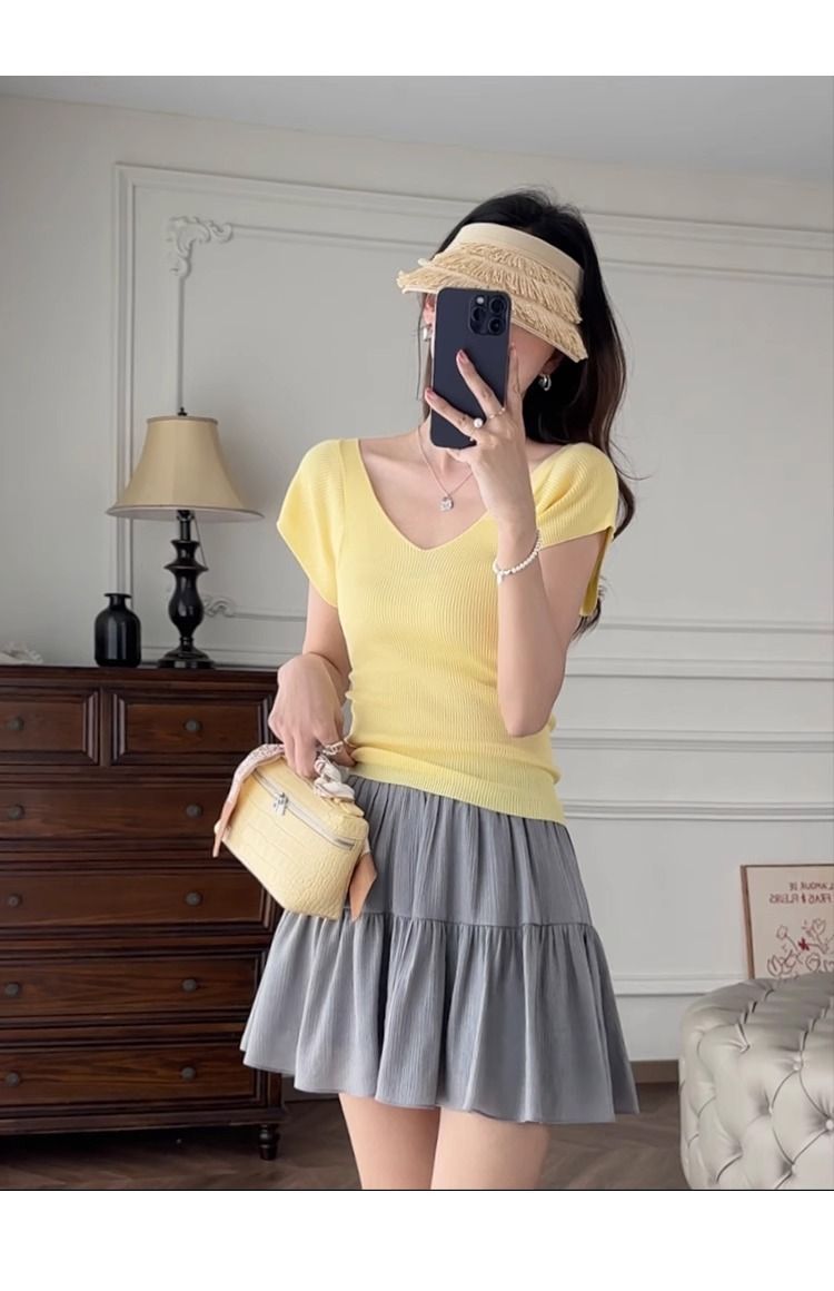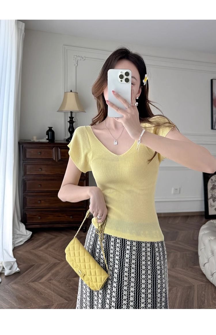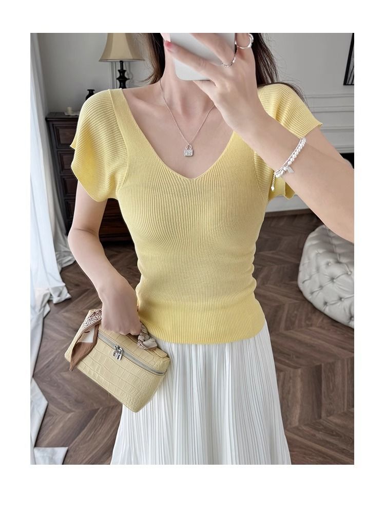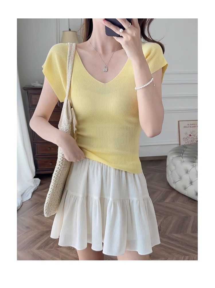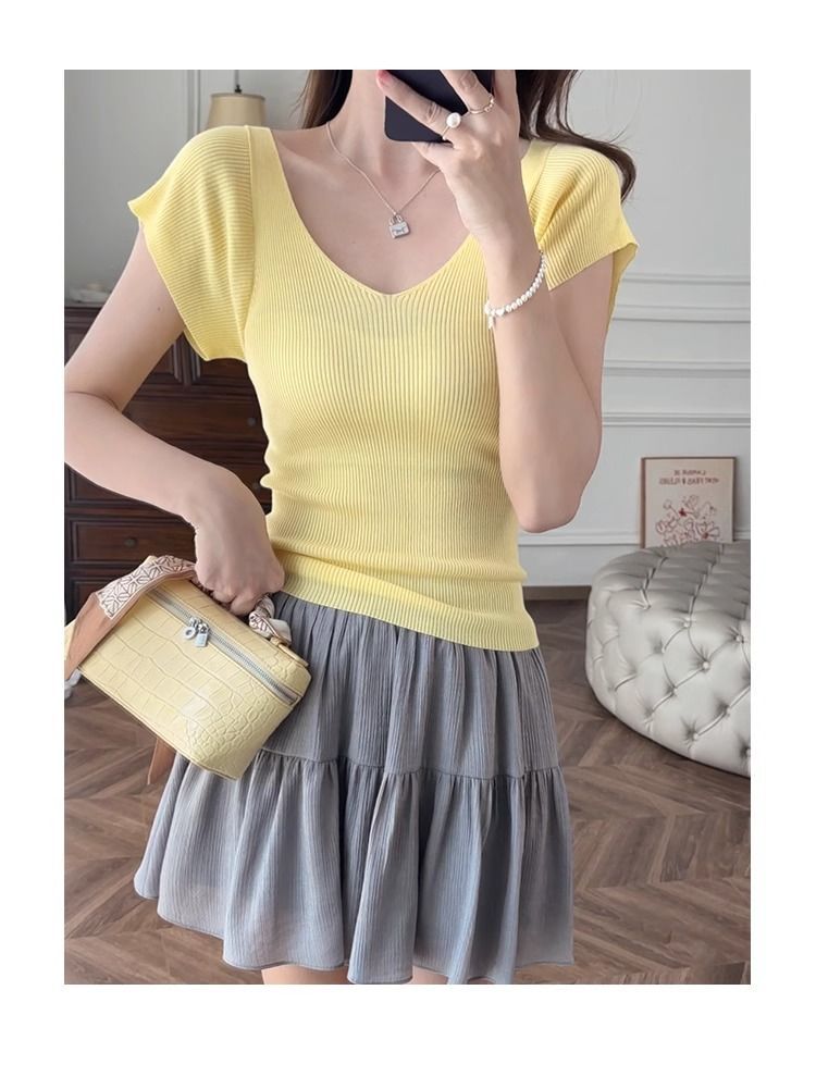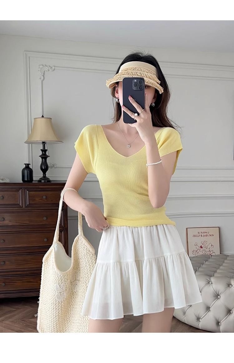 노란색 V 넥 어깨 아이스 실크 니트 반팔 티셔츠 여성용 여름 서양 스타일 독특한 세련된 슬림 핏 달콤한 스파이스 소녀 탑스토어 가기