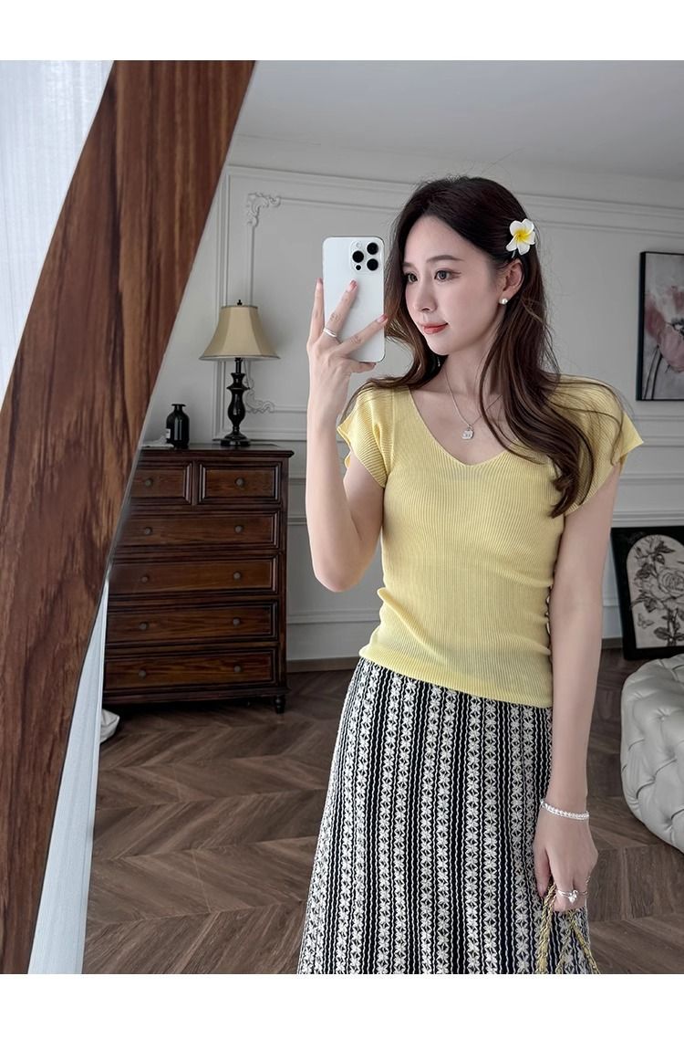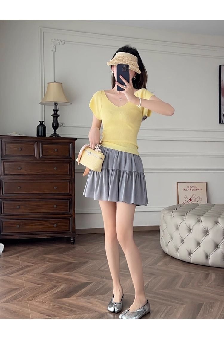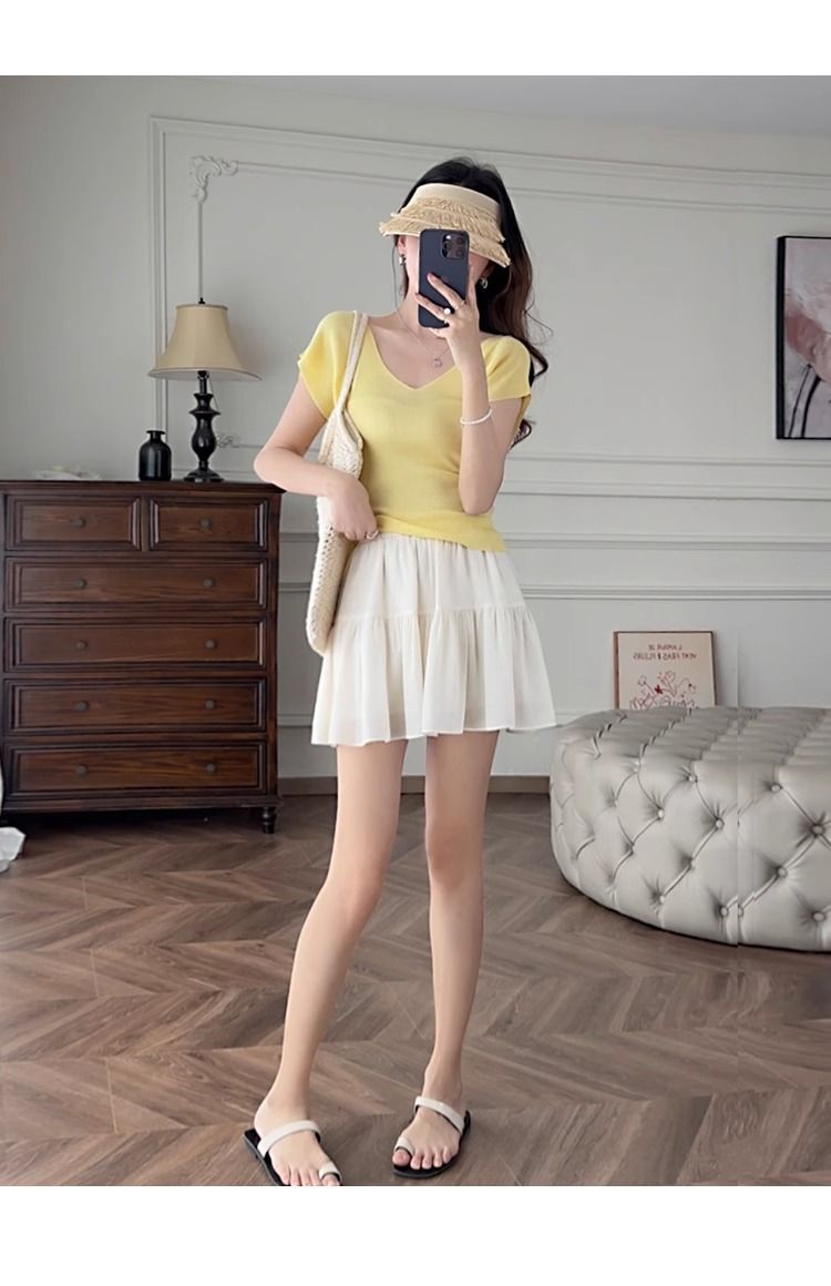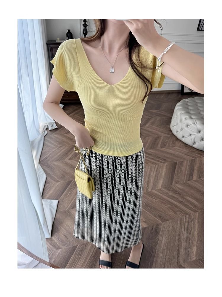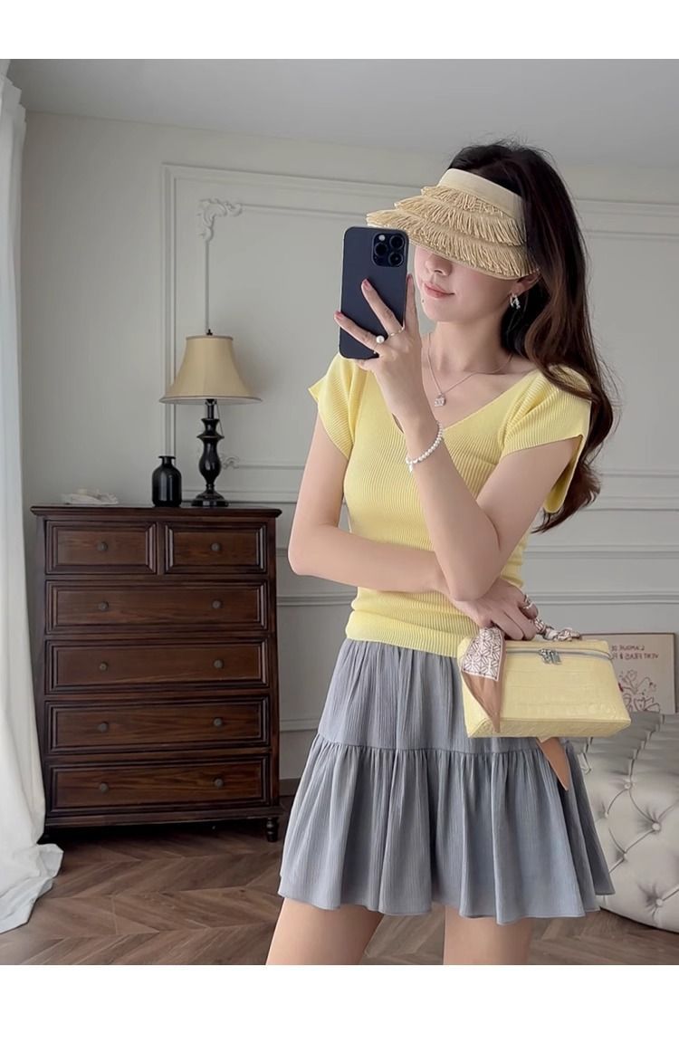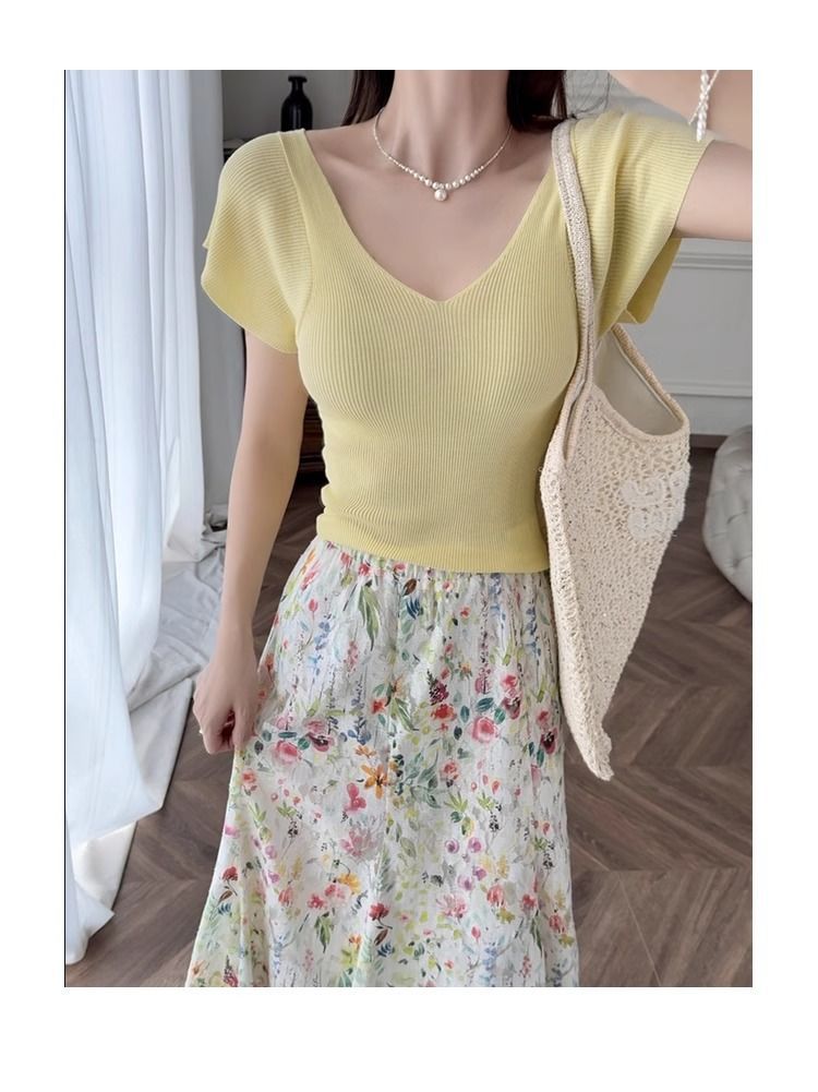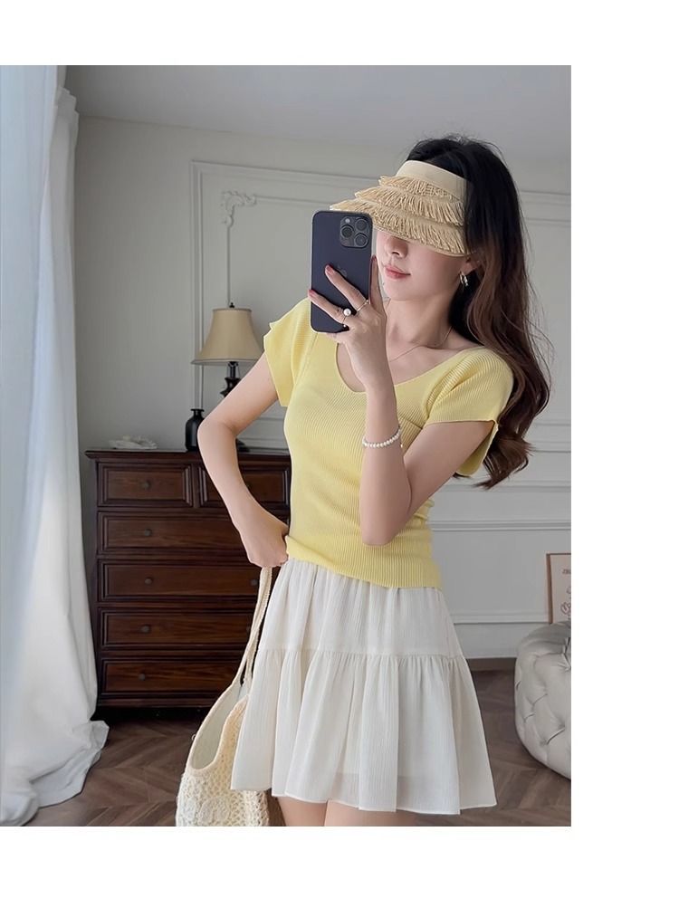 노란색 V 넥 어깨 아이스 실크 니트 반팔 티셔츠 여성용 여름 서양 스타일 독특한 세련된 슬림 핏 달콤한 스파이스 소녀 탑스토어 가기