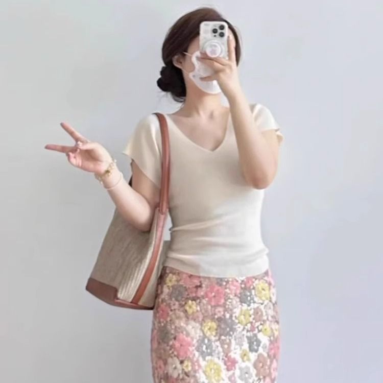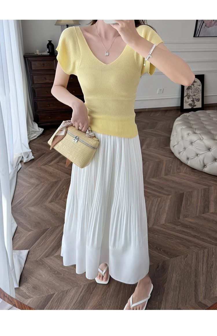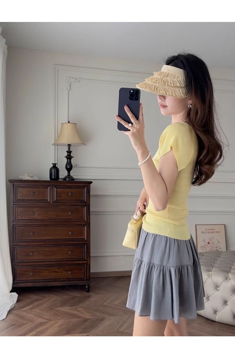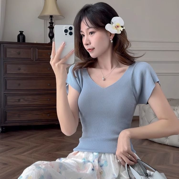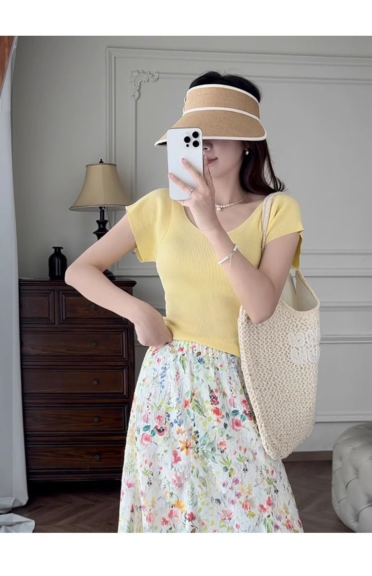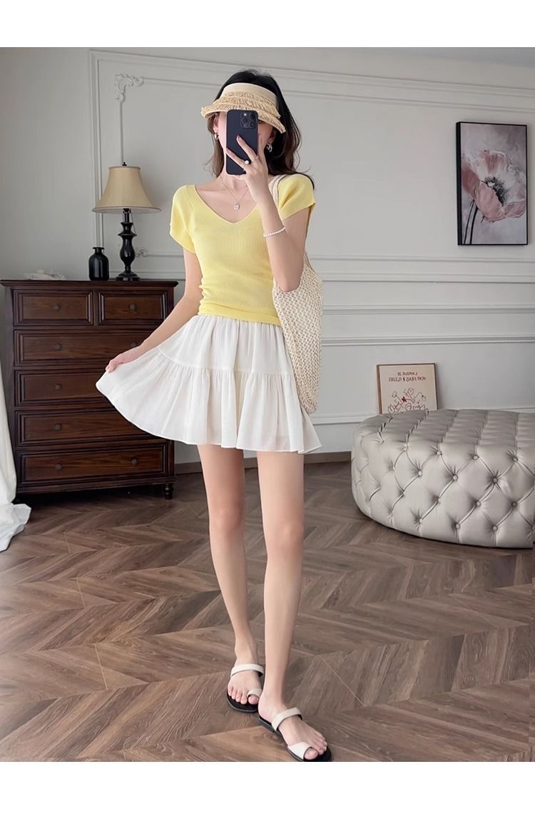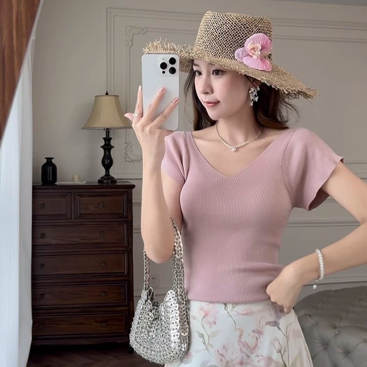 노란색 V 넥 어깨 아이스 실크 니트 반팔 티셔츠 여성용 여름 서양 스타일 독특한 세련된 슬림 핏 달콤한 스파이스 소녀 탑스토어 가기