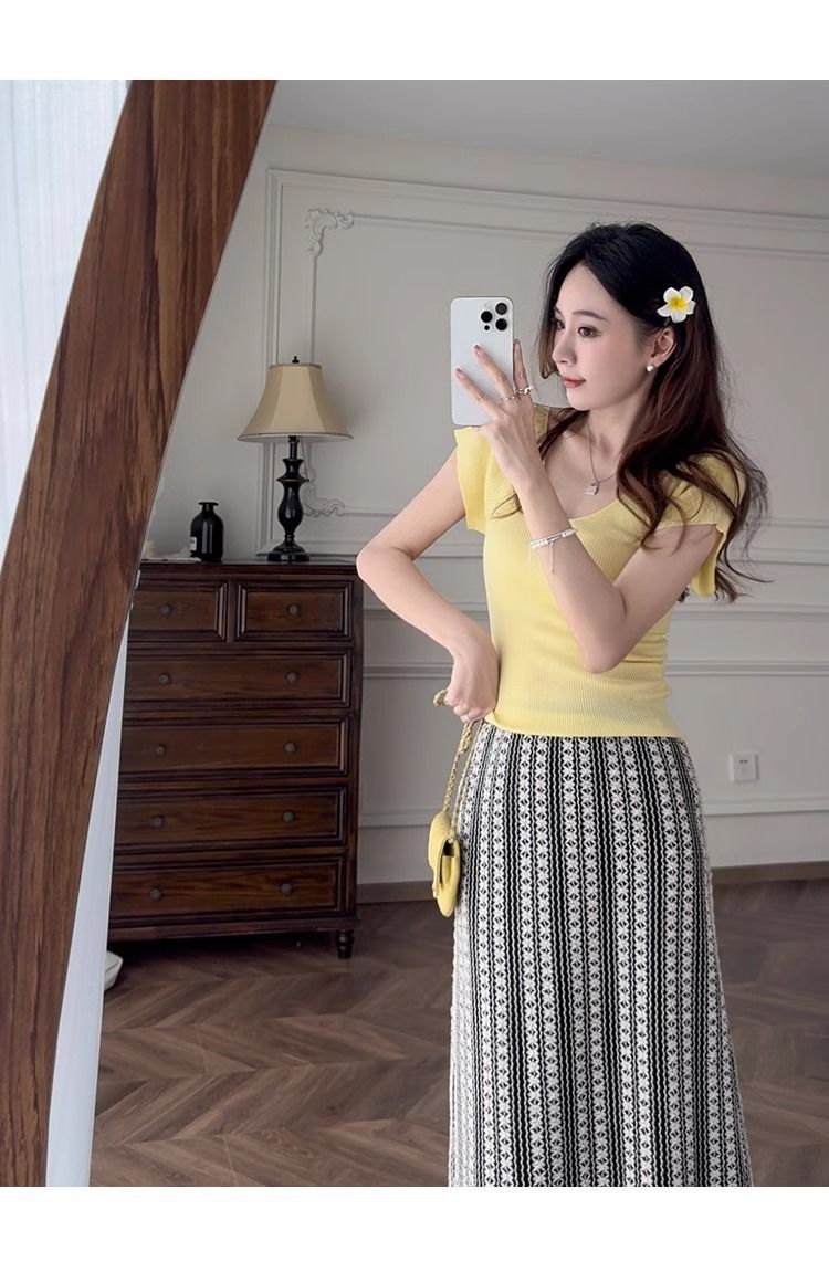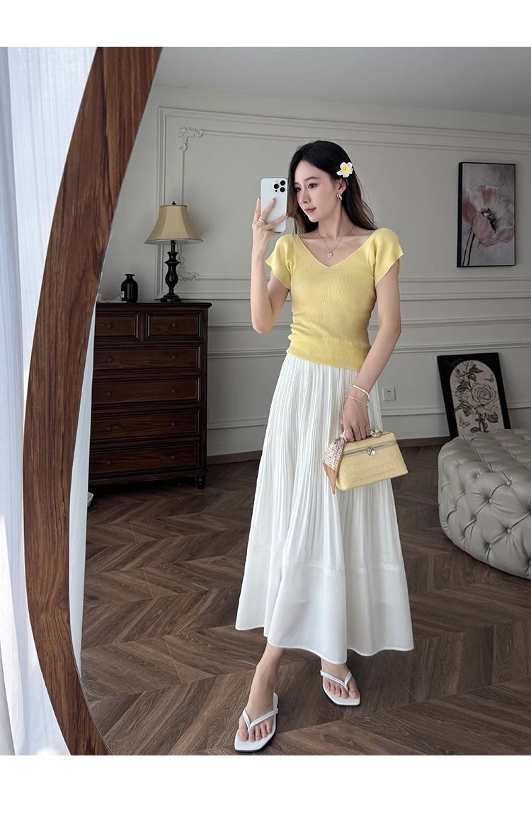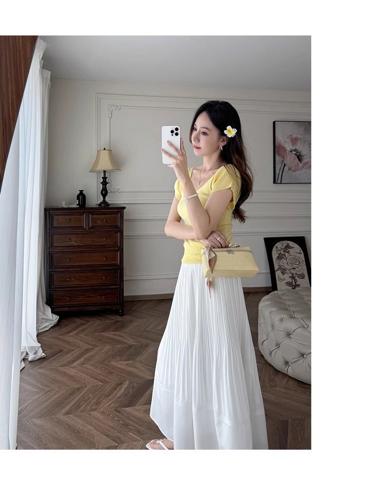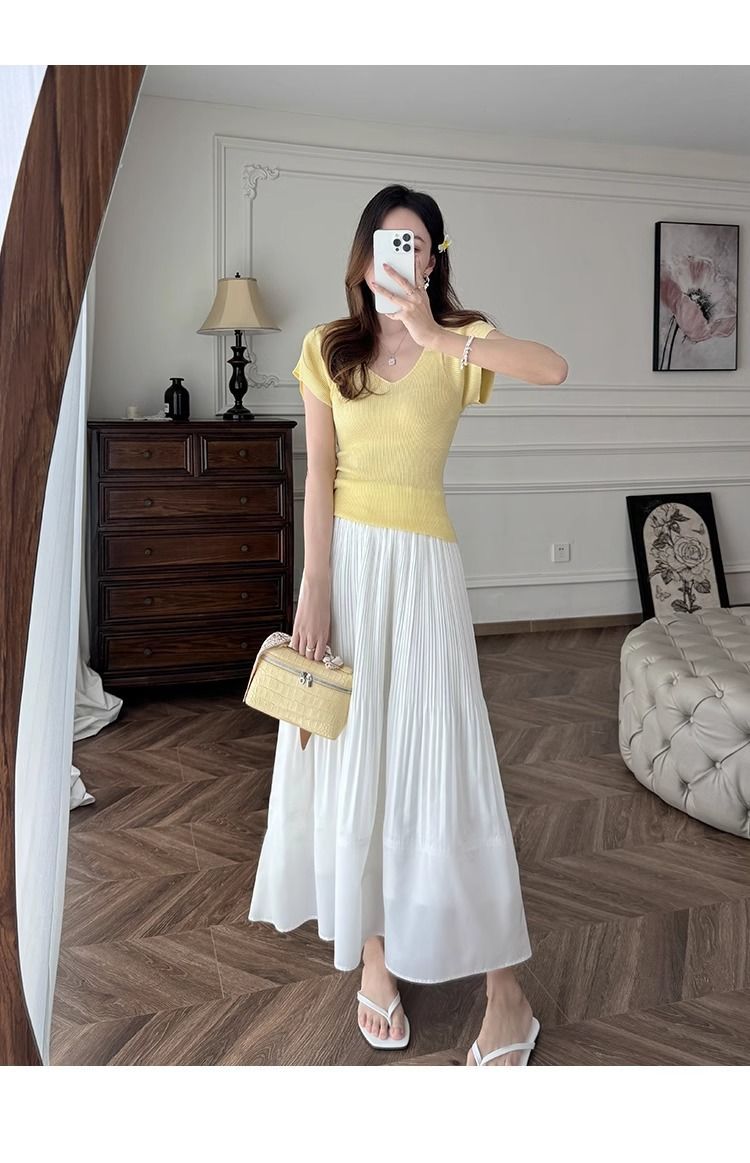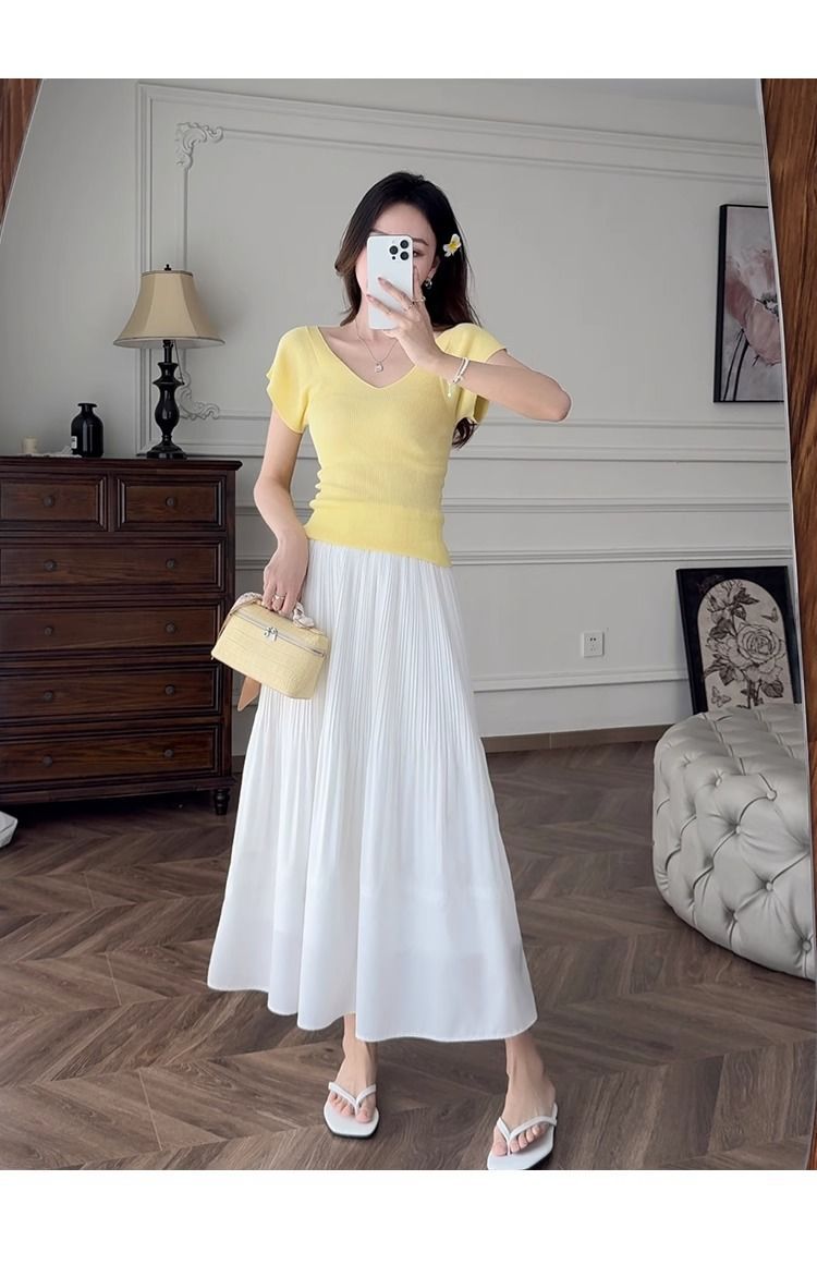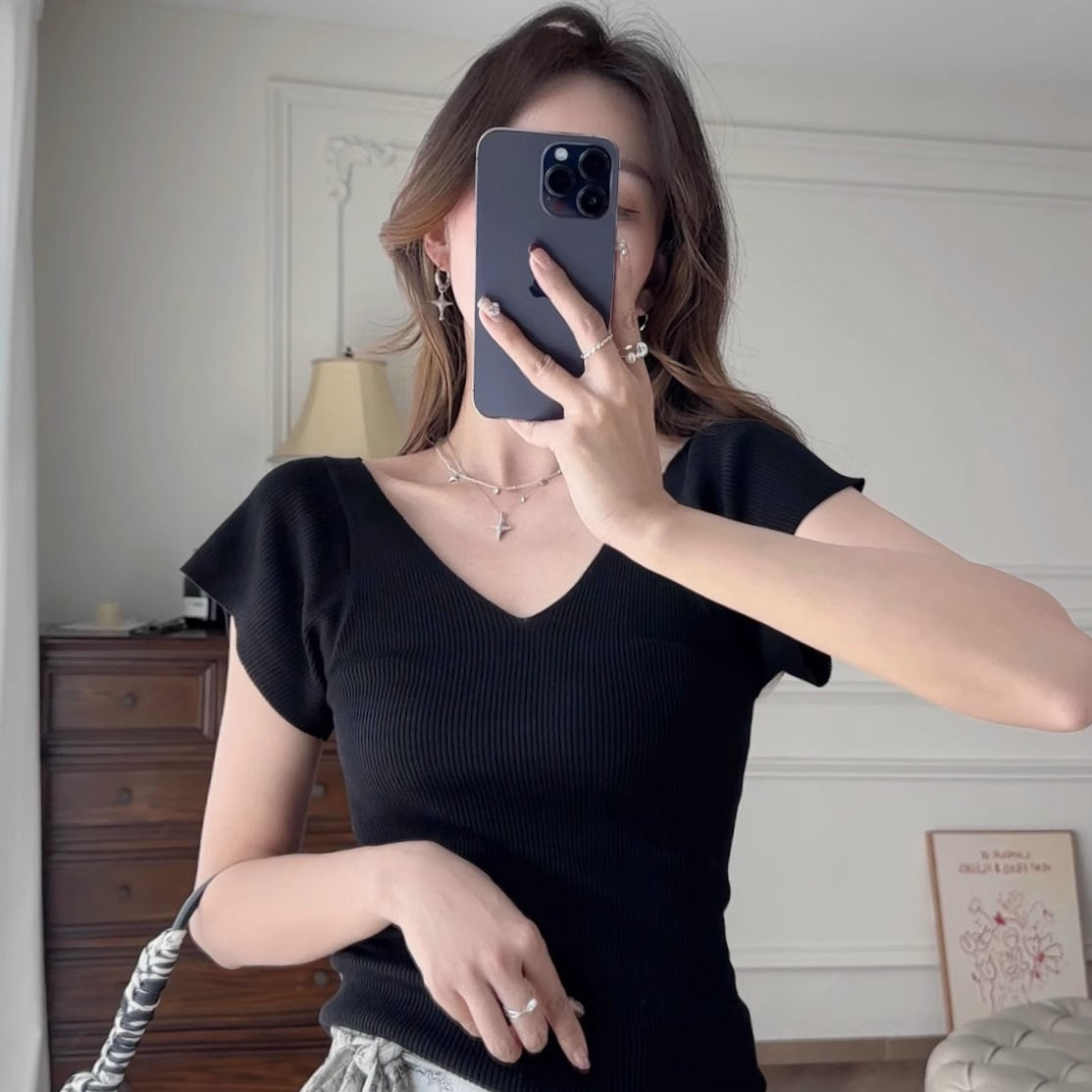 노란색 V 넥 어깨 아이스 실크 니트 반팔 티셔츠 여성용 여름 서양 스타일 독특한 세련된 슬림 핏 달콤한 스파이스 소녀 탑스토어 가기
