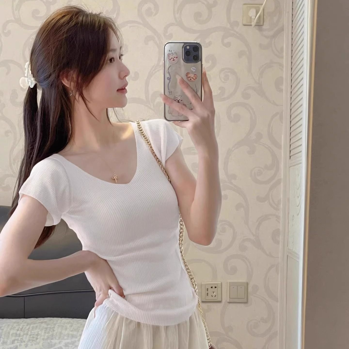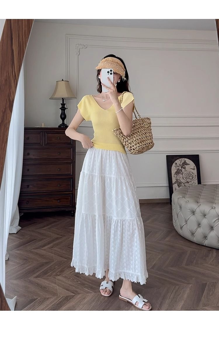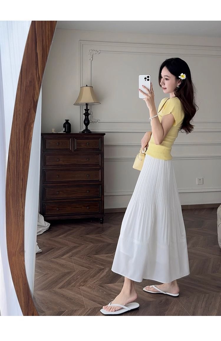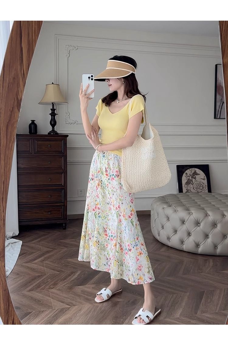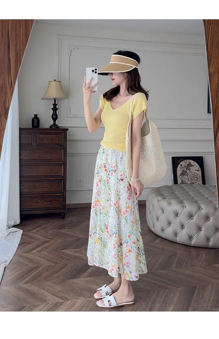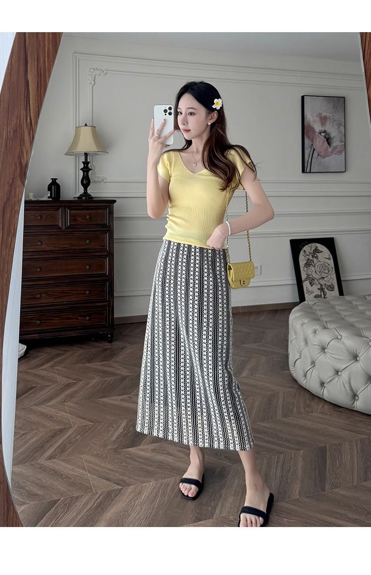 노란색 V 넥 어깨 아이스 실크 니트 반팔 티셔츠 여성용 여름 서양 스타일 독특한 세련된 슬림 핏 달콤한 스파이스 소녀 탑스토어 가기
