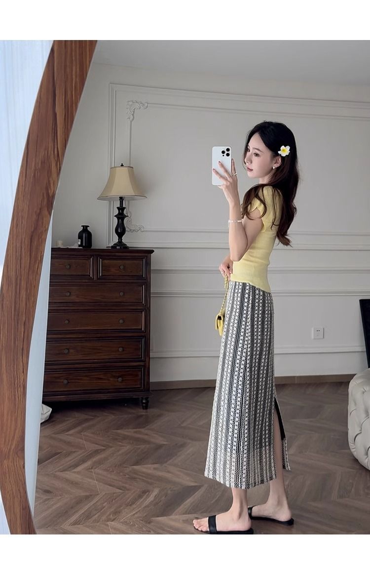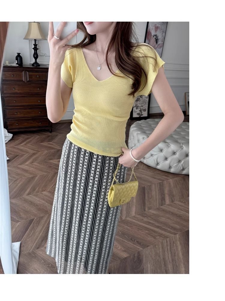 노란색 V 넥 어깨 아이스 실크 니트 반팔 티셔츠 여성용 여름 서양 스타일 독특한 세련된 슬림 핏 달콤한 스파이스 소녀 탑