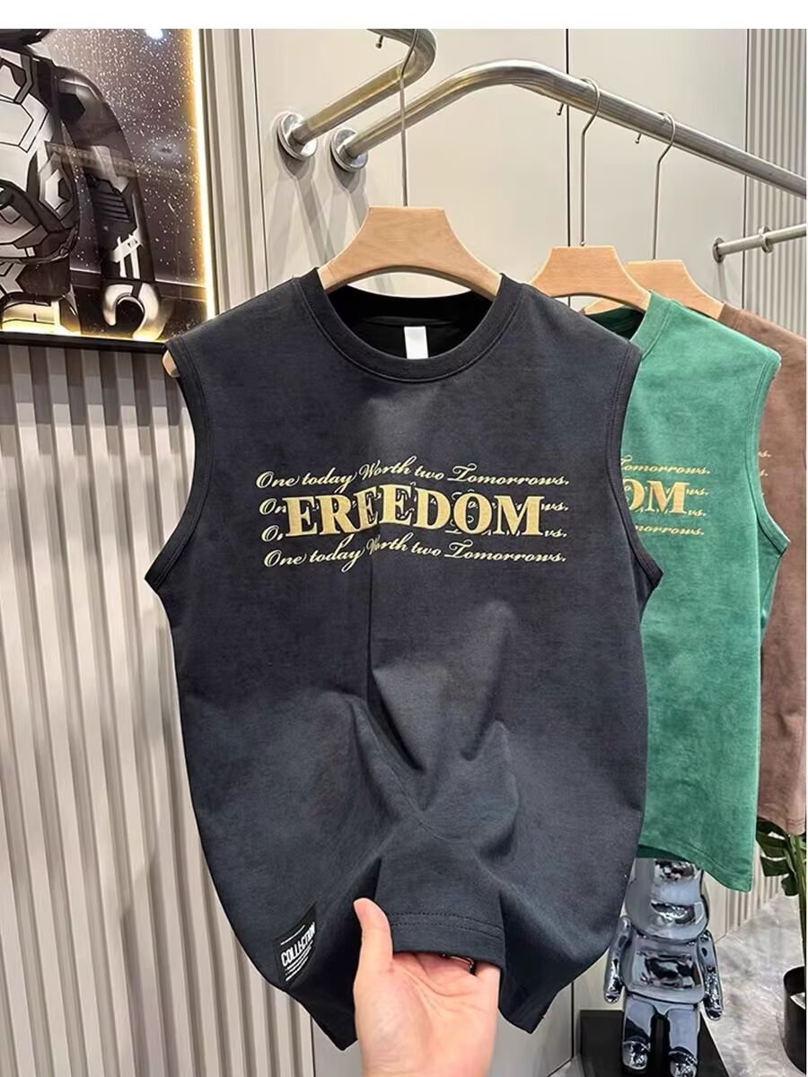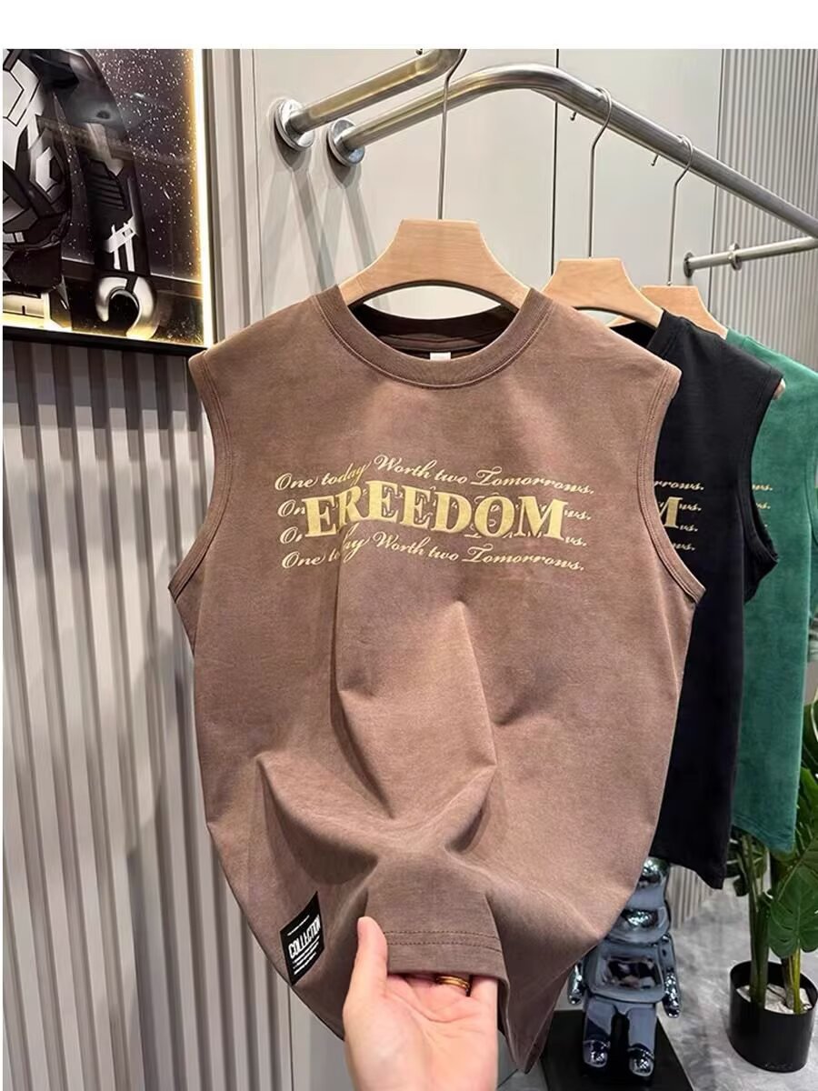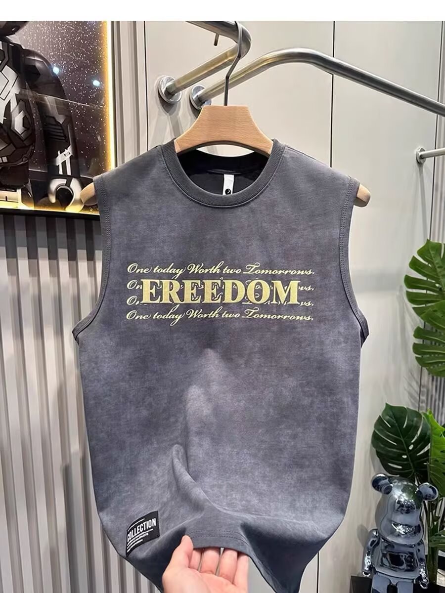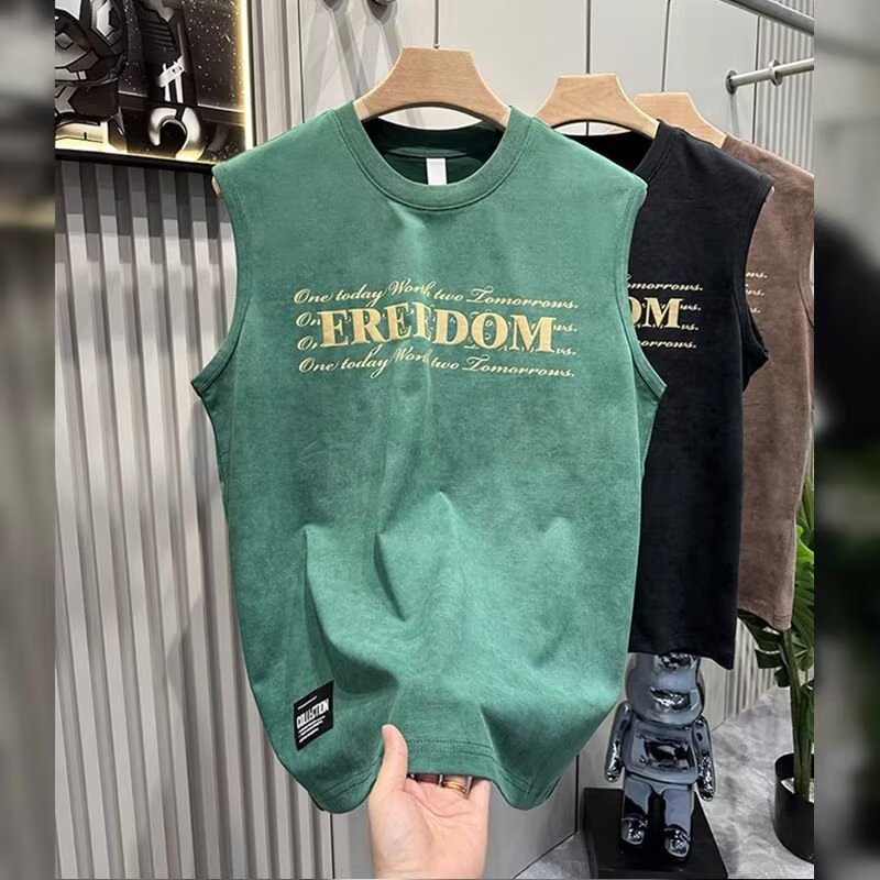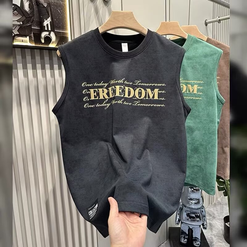 여름 새로운 조끼 남자의 유행 인쇄 민소매 느슨한 허리 코트 스포츠 피트니스 캐주얼 라운드 넥 올 매치 탑 트렌디스토어 가기