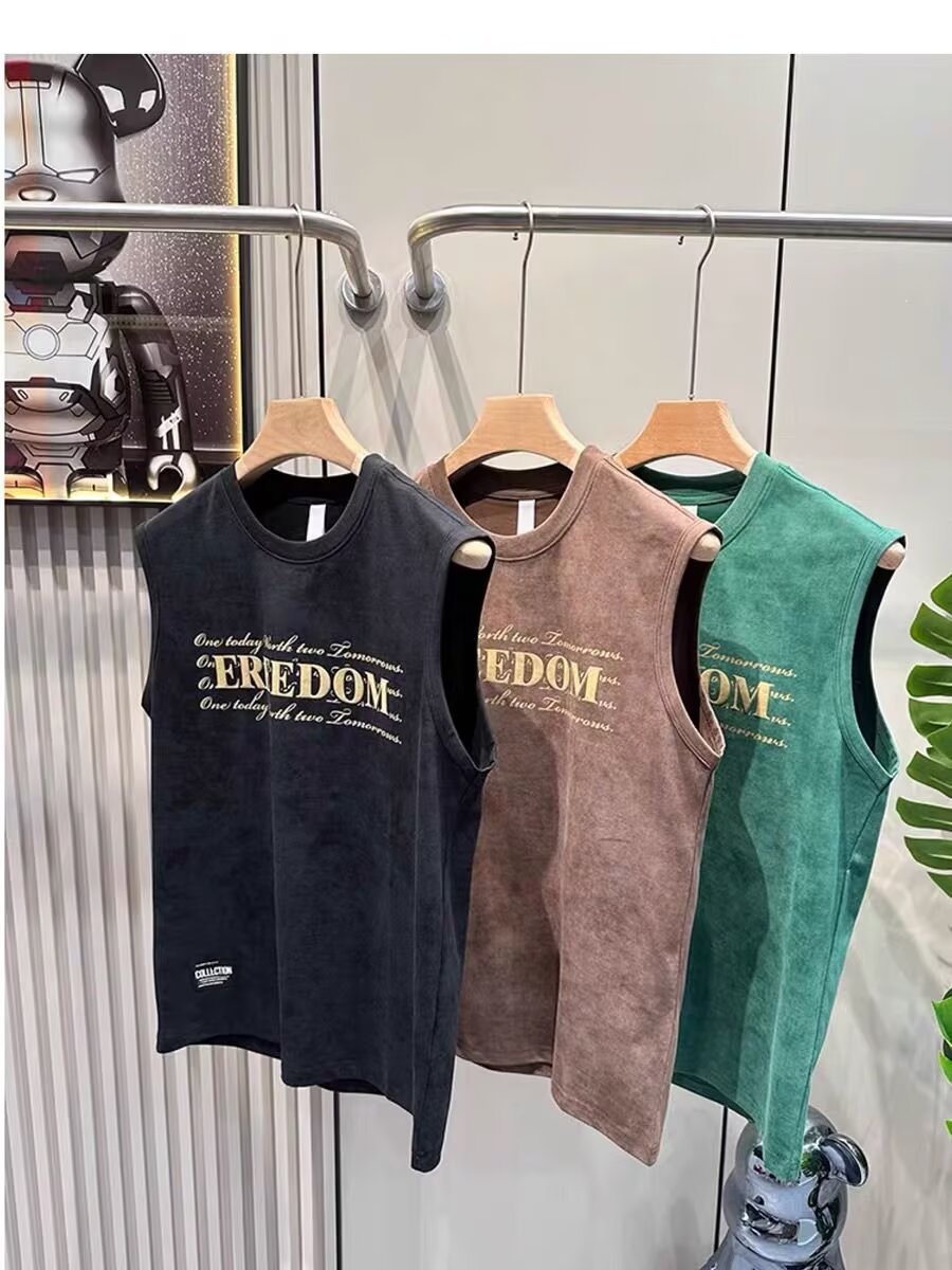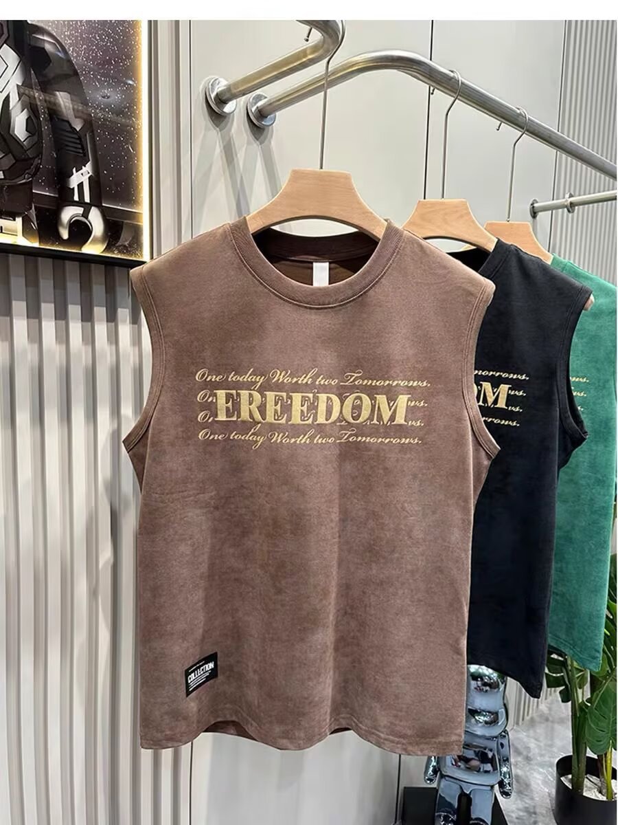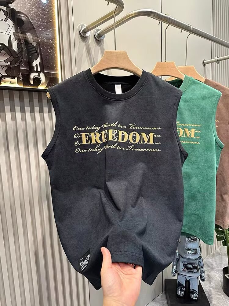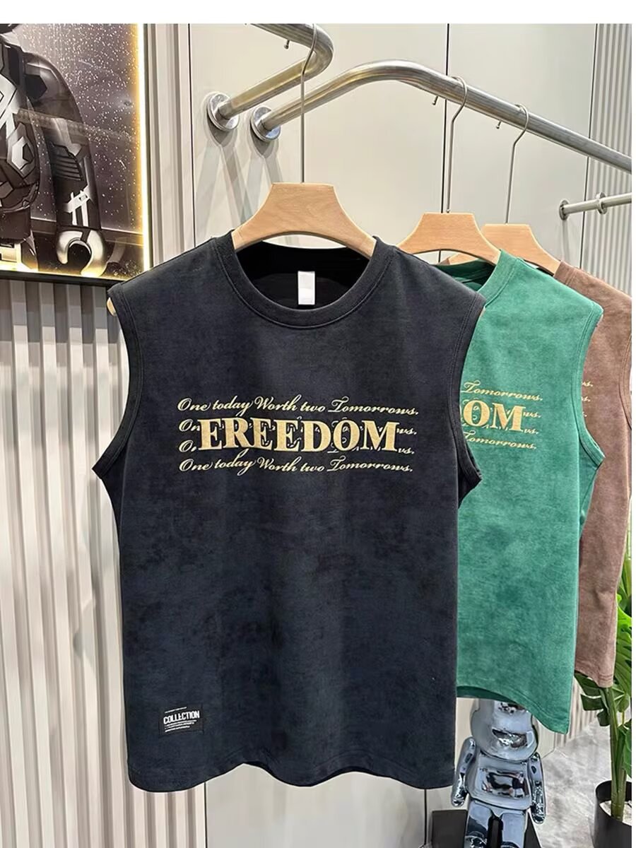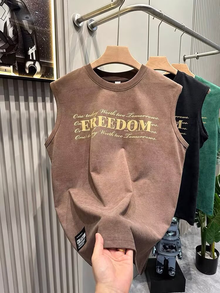 여름 새로운 조끼 남자의 유행 인쇄 민소매 느슨한 허리 코트 스포츠 피트니스 캐주얼 라운드 넥 올 매치 탑 트렌디스토어 가기