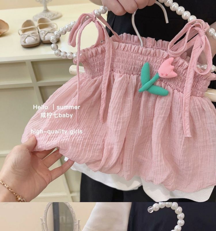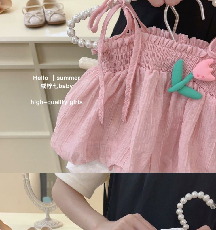 여아 여름 투피스 세트, 새로운 스타일의 중소형 어린이 서스펜더 탑, 패셔너블한 쉬폰 셔츠, 여아 반바지 세트스토어 가기