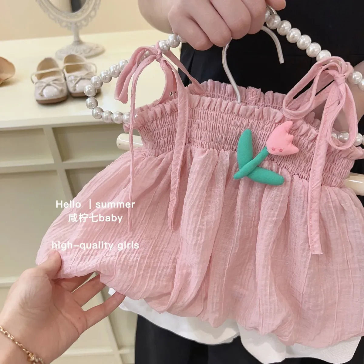여아 여름 투피스 세트, 새로운 스타일의 중소형 어린이 서스펜더 탑, 패셔너블한 쉬폰 셔츠, 여아 반바지 세트