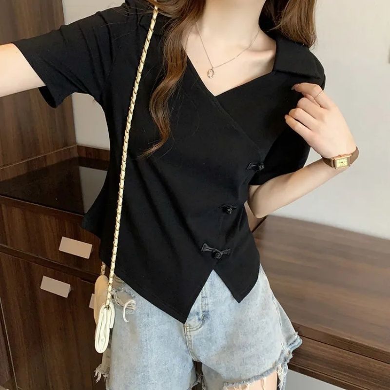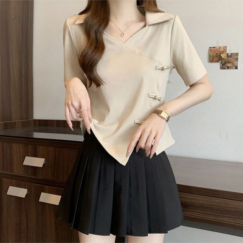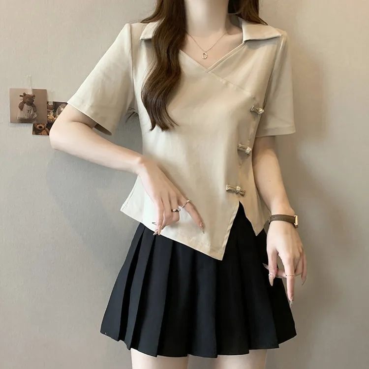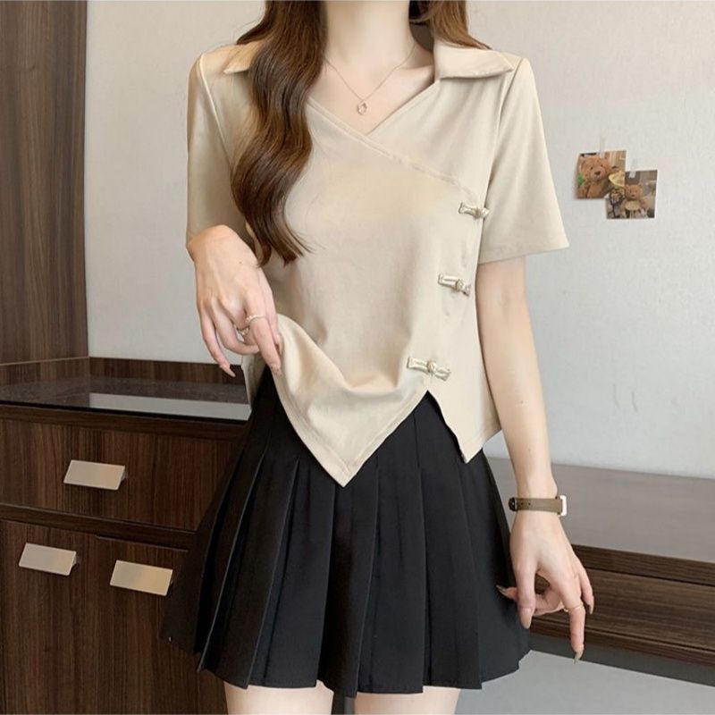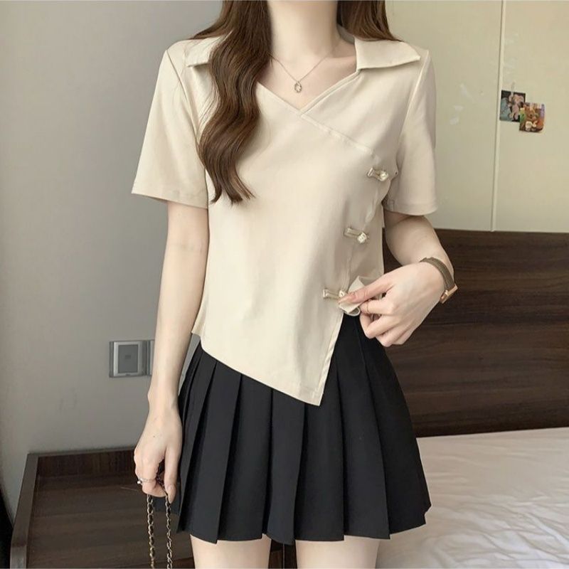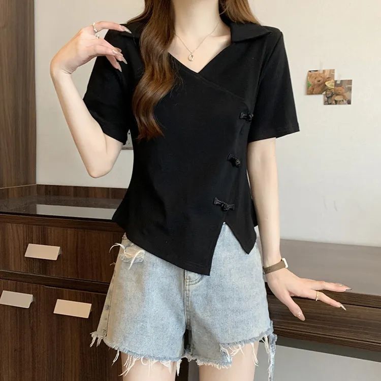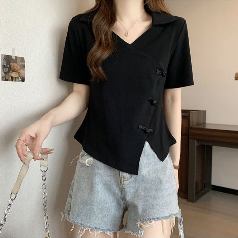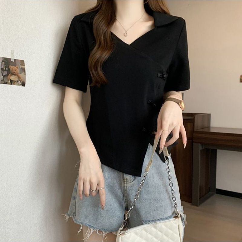 폴로 셔츠 여성용 반팔 티셔츠 V 넥 플러스 사이즈 통통녀 어깨 순수한 욕망 디자인 센스 니쉬 새로운 중국 스타일 핫 걸 탑스토어 가기