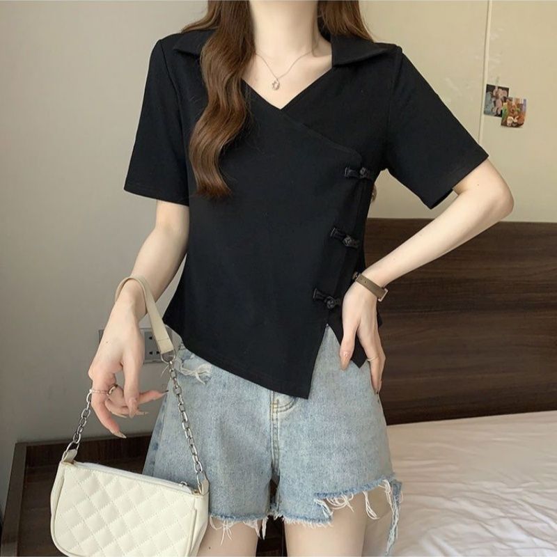 폴로 셔츠 여성용 반팔 티셔츠 V 넥 플러스 사이즈 통통녀 어깨 순수한 욕망 디자인 센스 니쉬 새로운 중국 스타일 핫 걸 탑