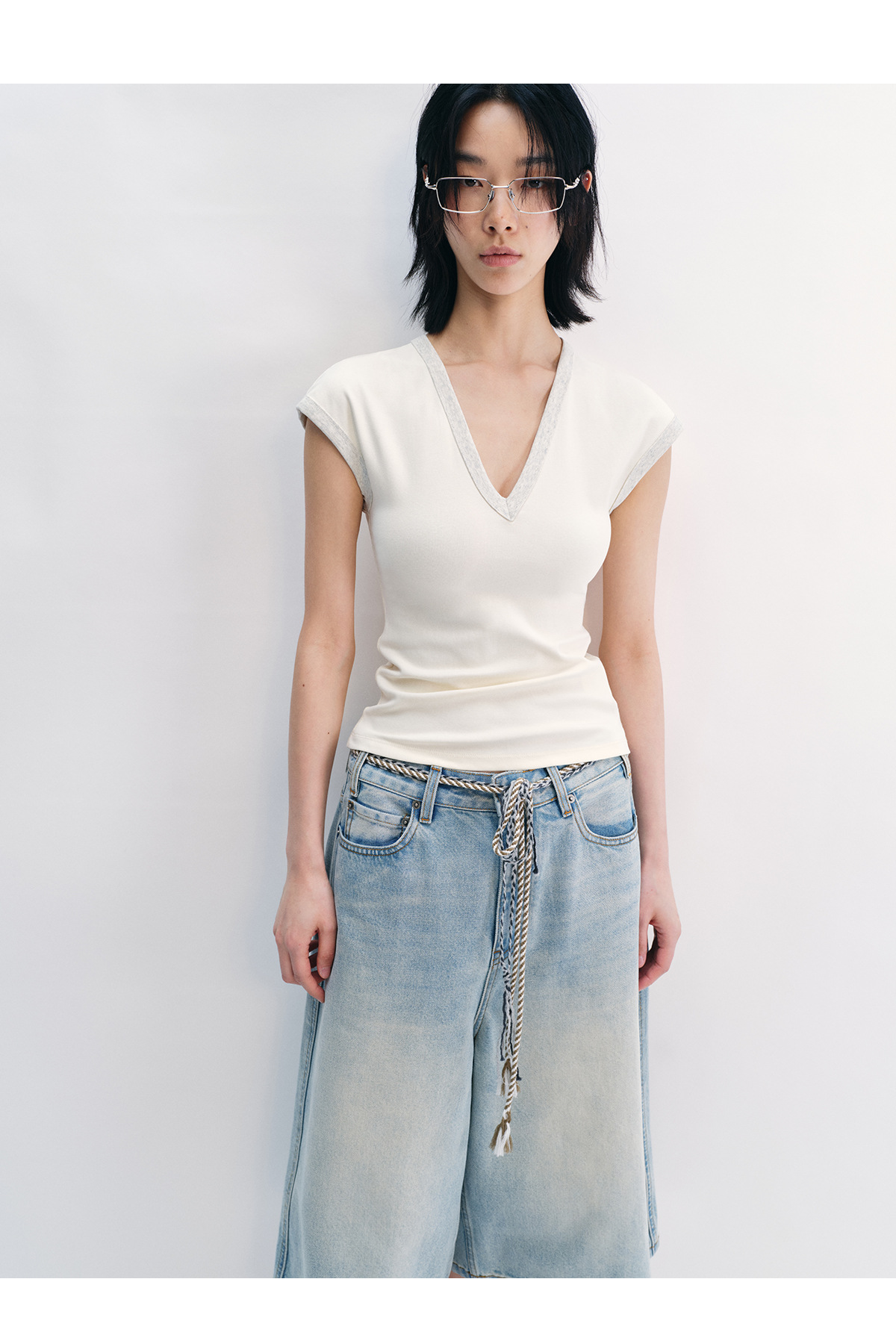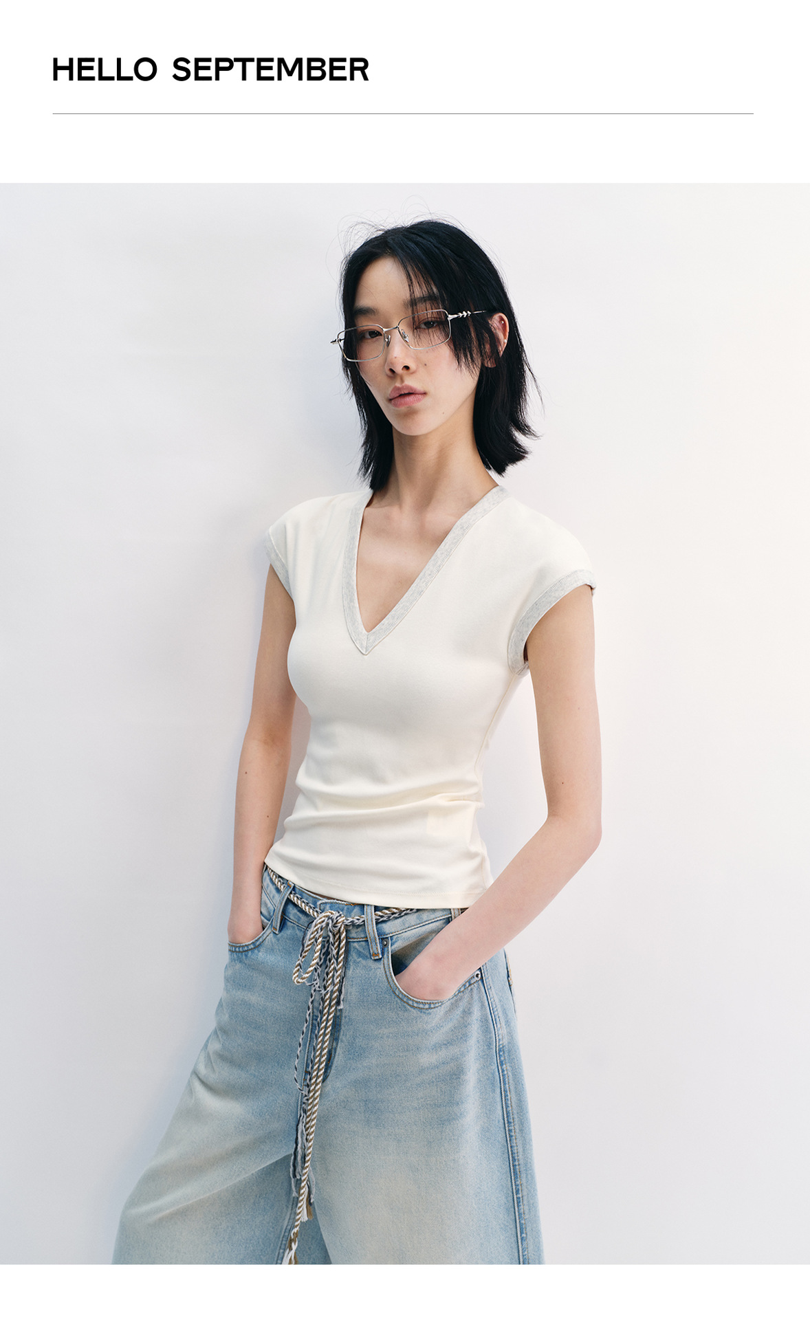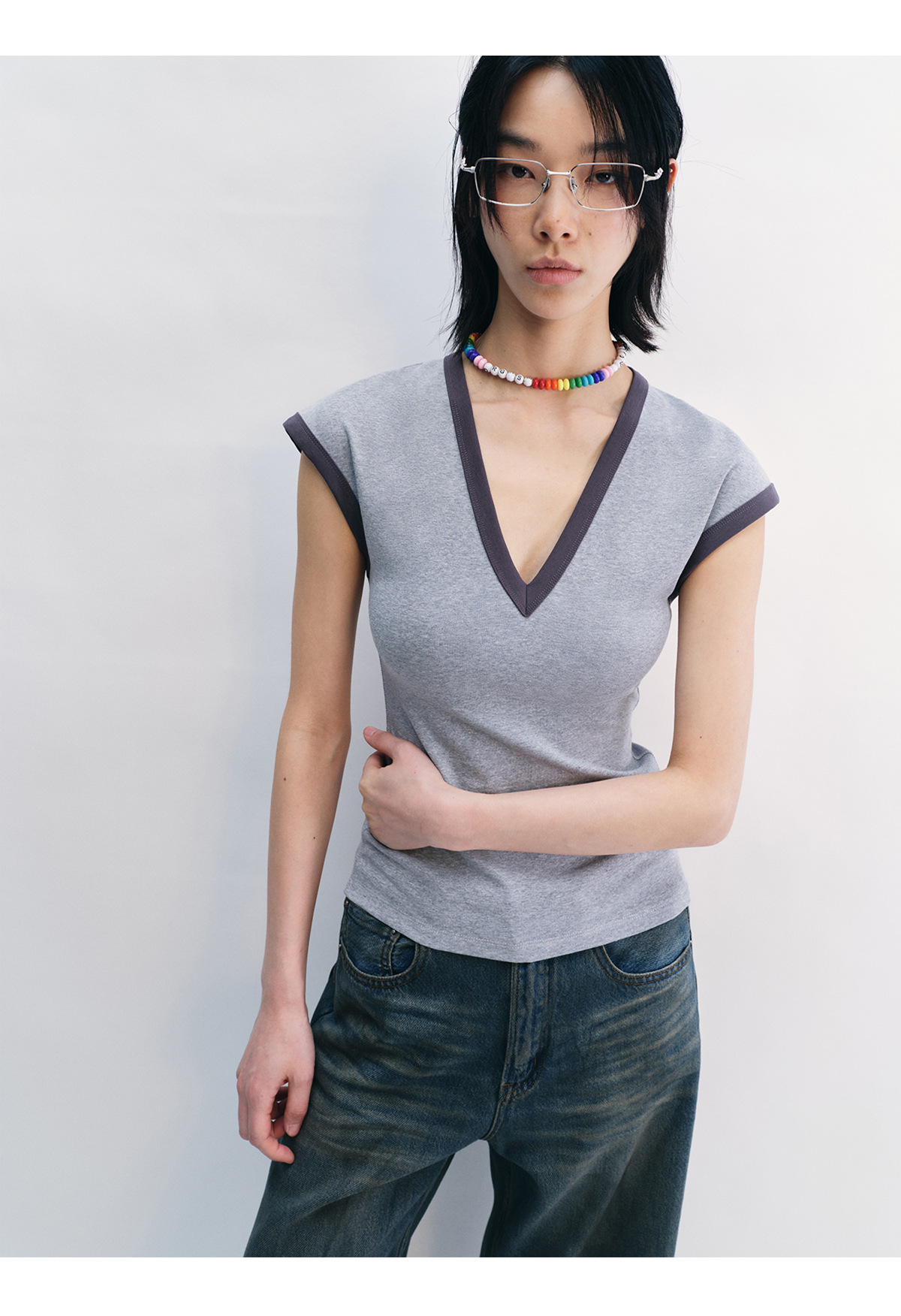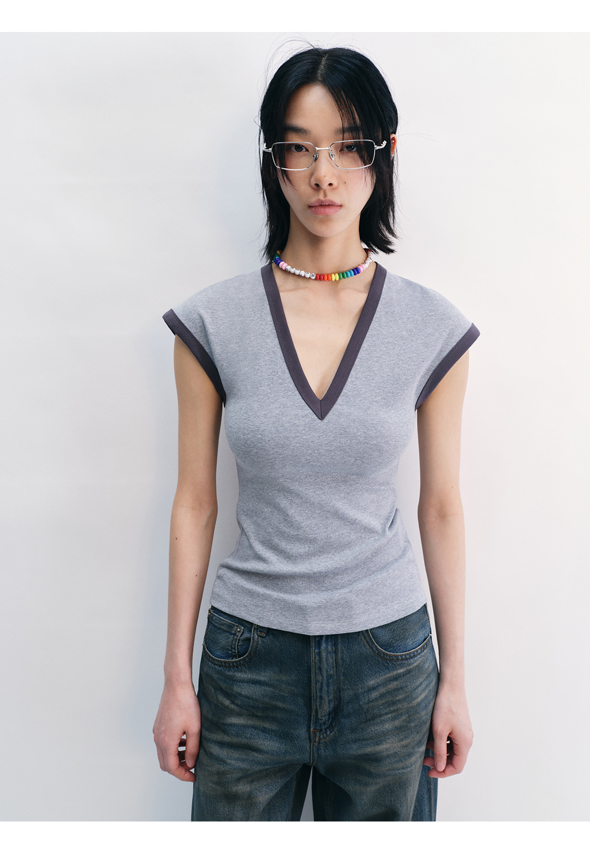[시간] 신형 코튼 레트로 컬러 대조 민소매 V-넥 탄성 슬림 핏 슬림 조커 티셔츠 탑 여성 V8737스토어 가기