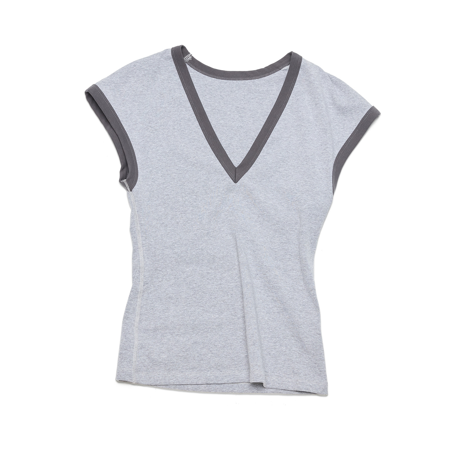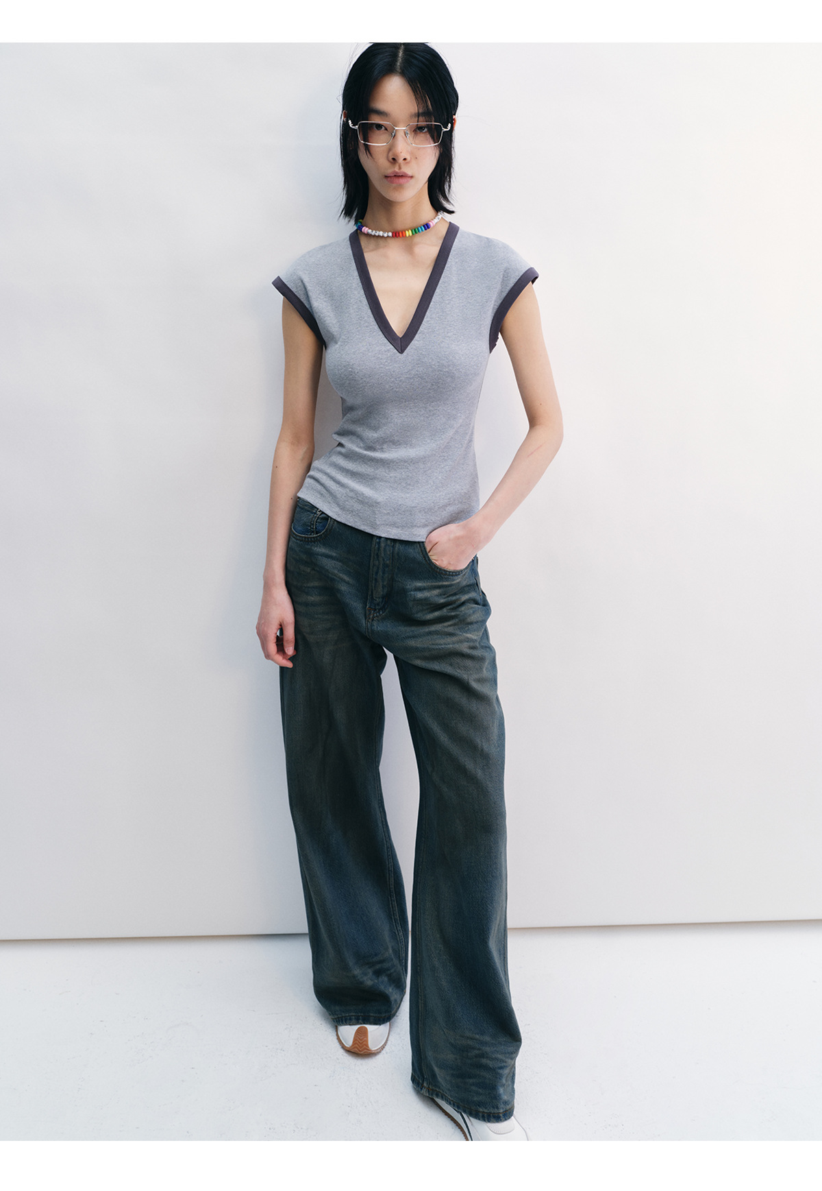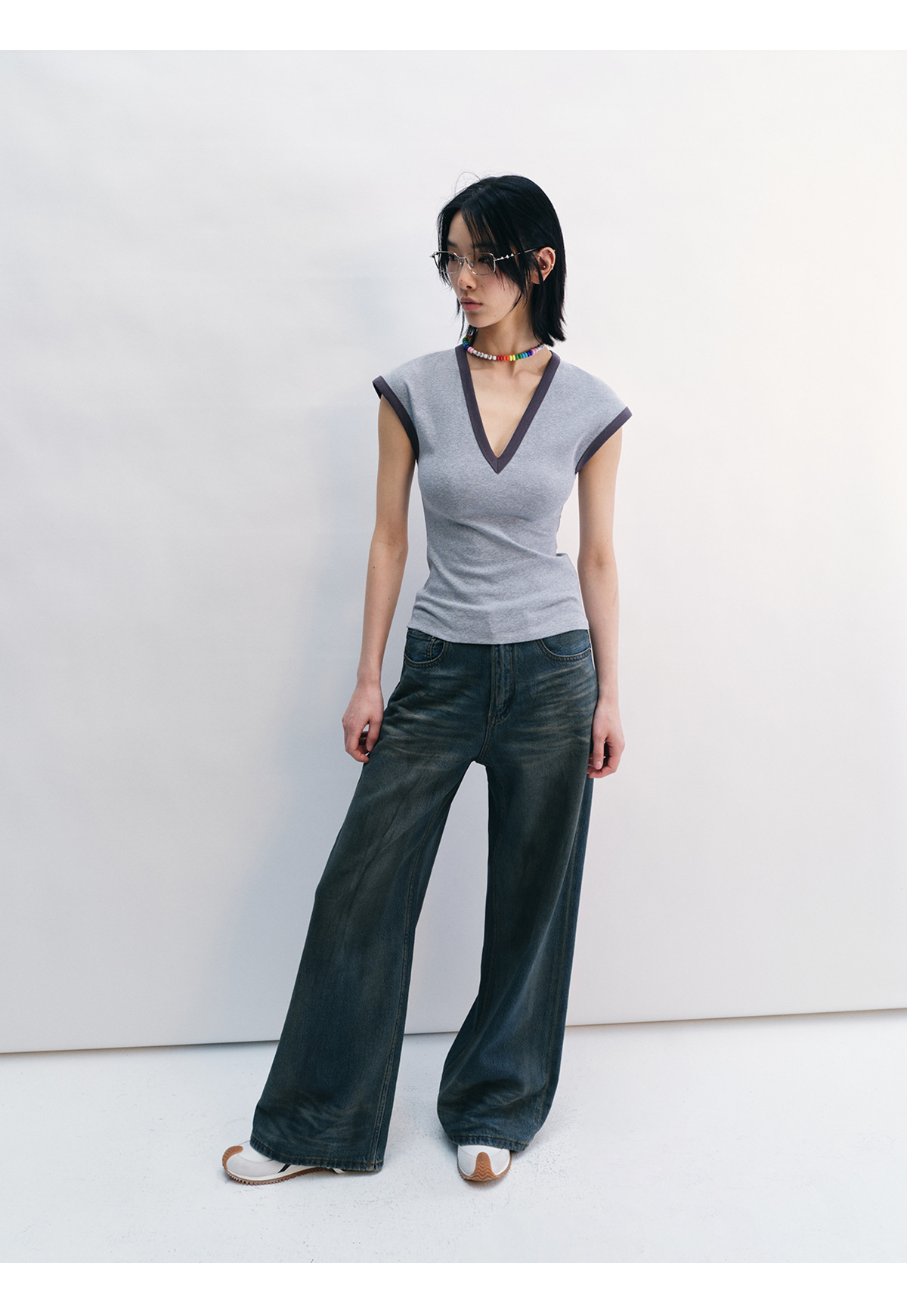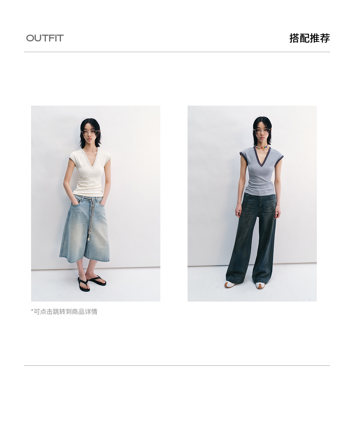 [시간] 신형 코튼 레트로 컬러 대조 민소매 V-넥 탄성 슬림 핏 슬림 조커 티셔츠 탑 여성 V8737스토어 가기