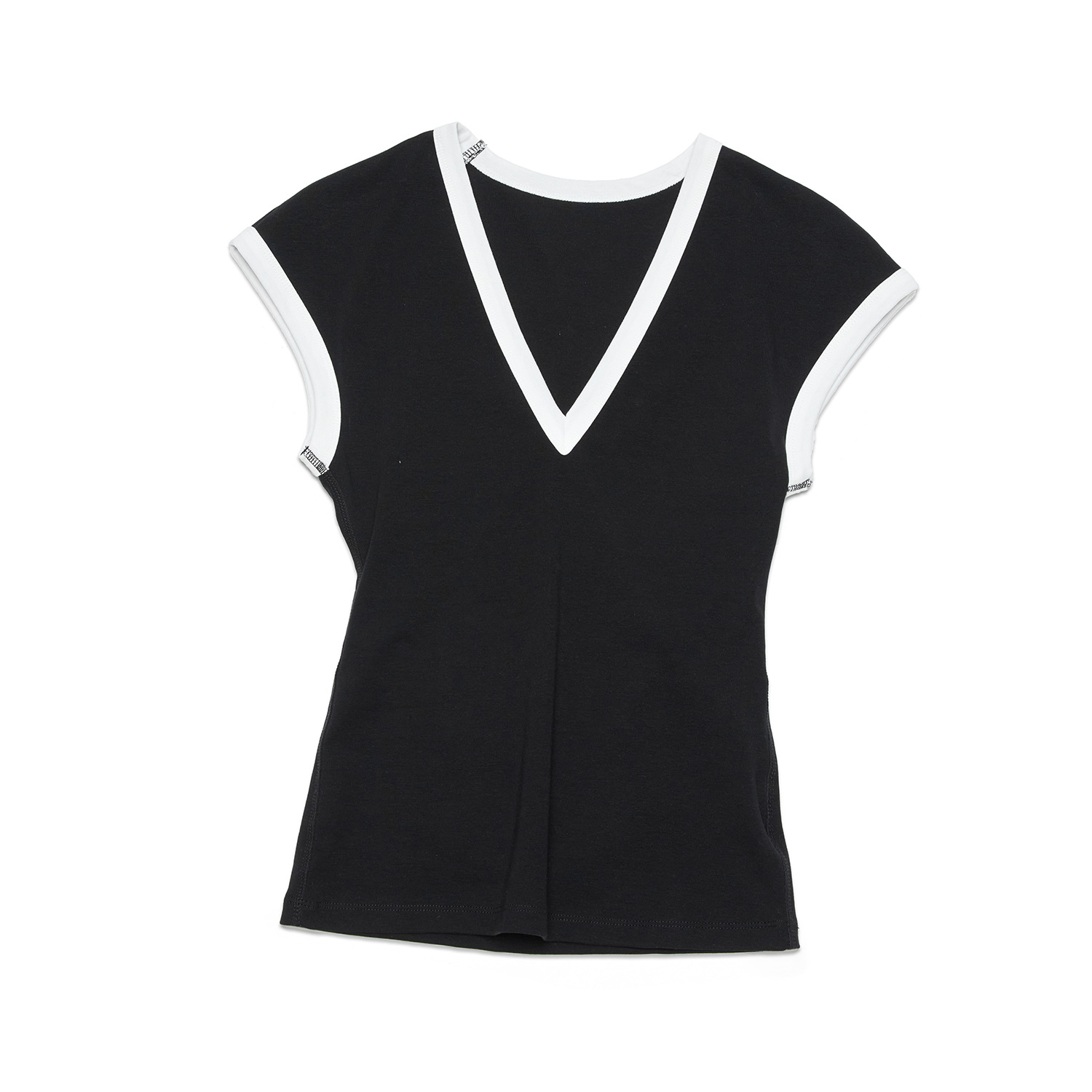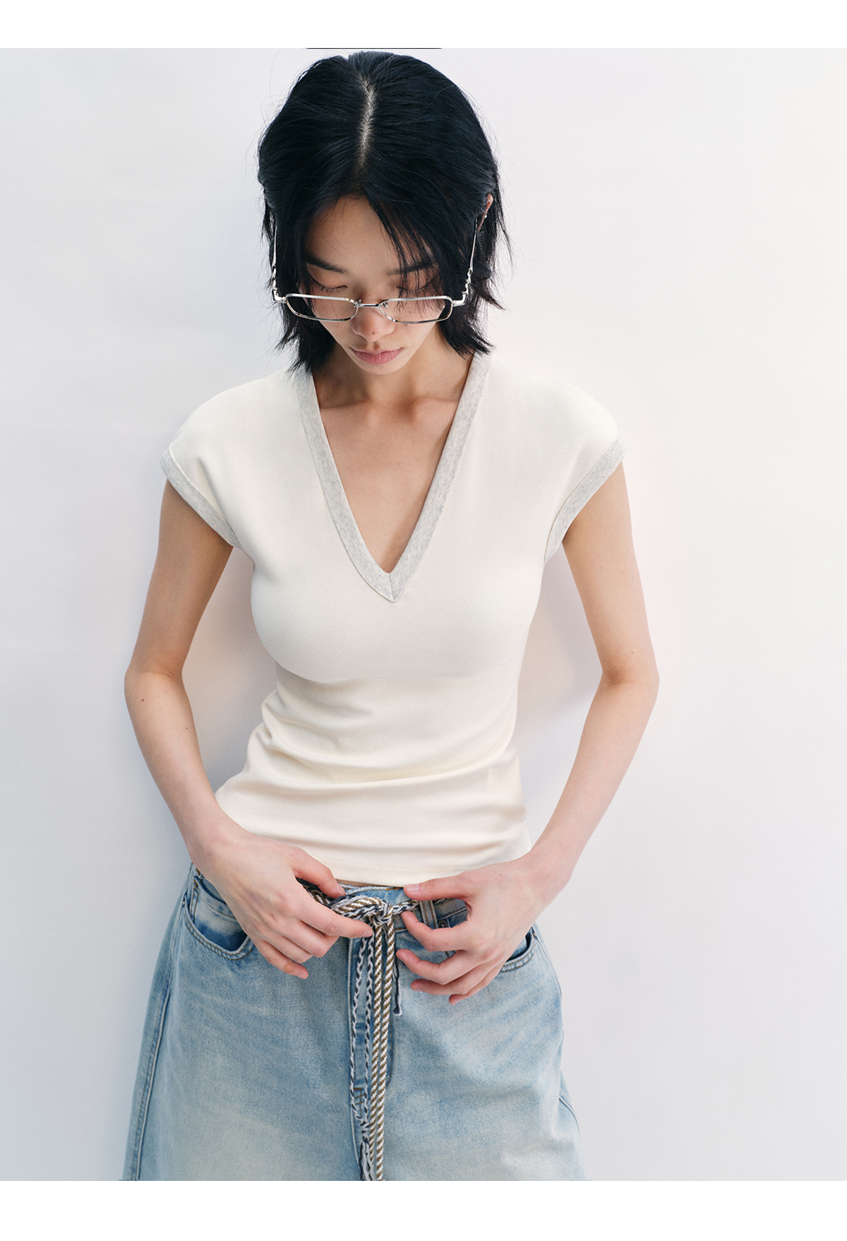 [시간] 신형 코튼 레트로 컬러 대조 민소매 V-넥 탄성 슬림 핏 슬림 조커 티셔츠 탑 여성 V8737
