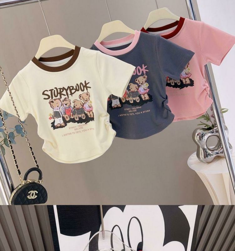 여름 한국 스타일 다용도 라운드 넥 탑 어린이 같은 스타일 곰 프린트 허리 짧은 소매 순수 코튼 티셔츠 트렌디스토어 가기