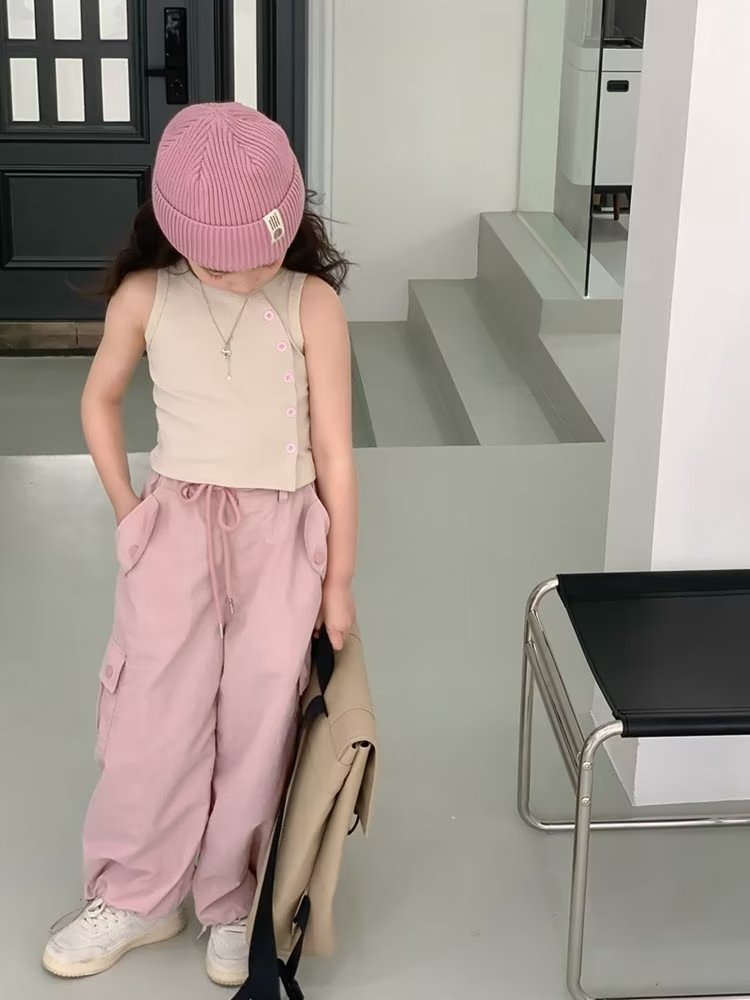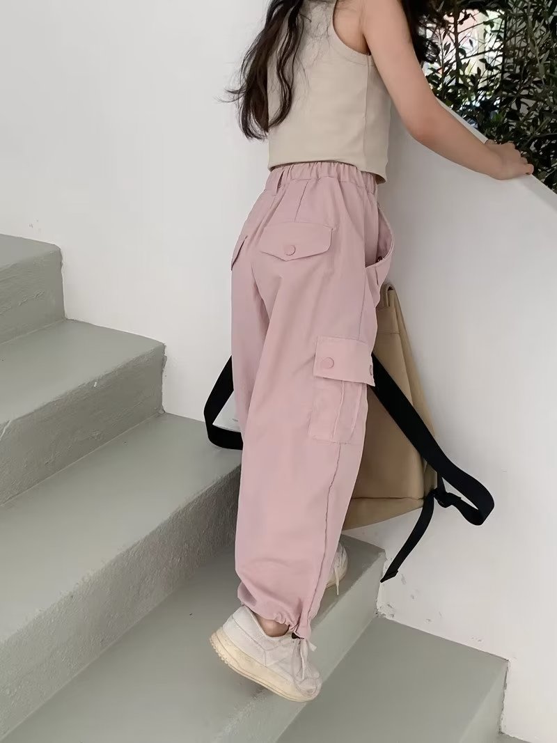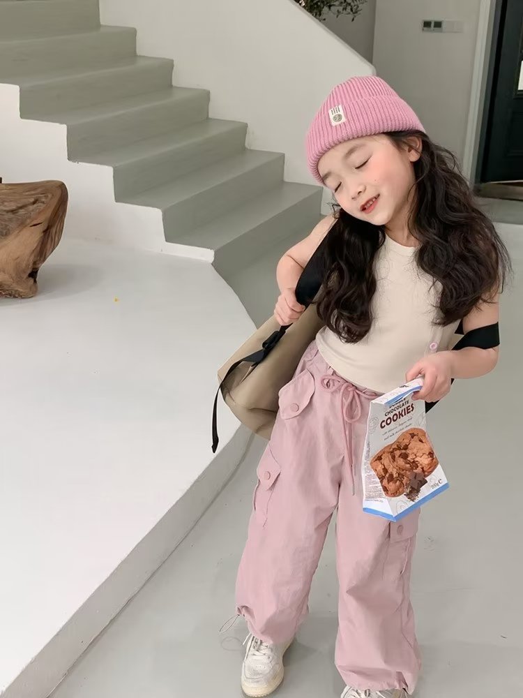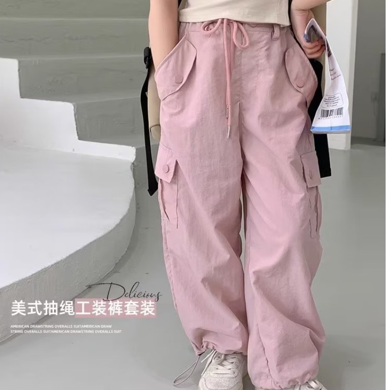 여아용 미국식 드로스트링 작업복, 봄 여름 의류, 중대형 아동용 한국식 핑크 속건성 댄스 팬츠, 캐주얼 바지, 트렌디스토어 가기