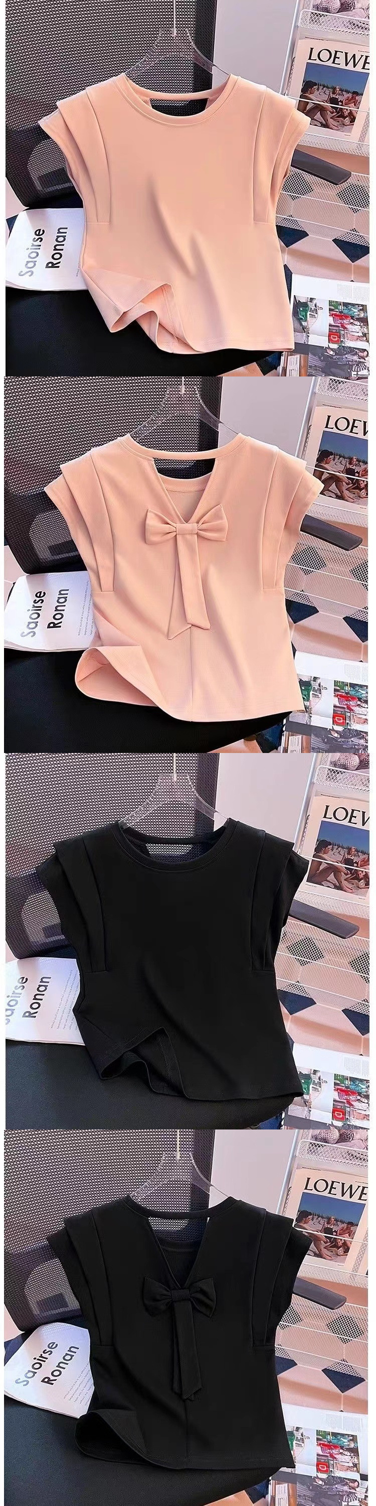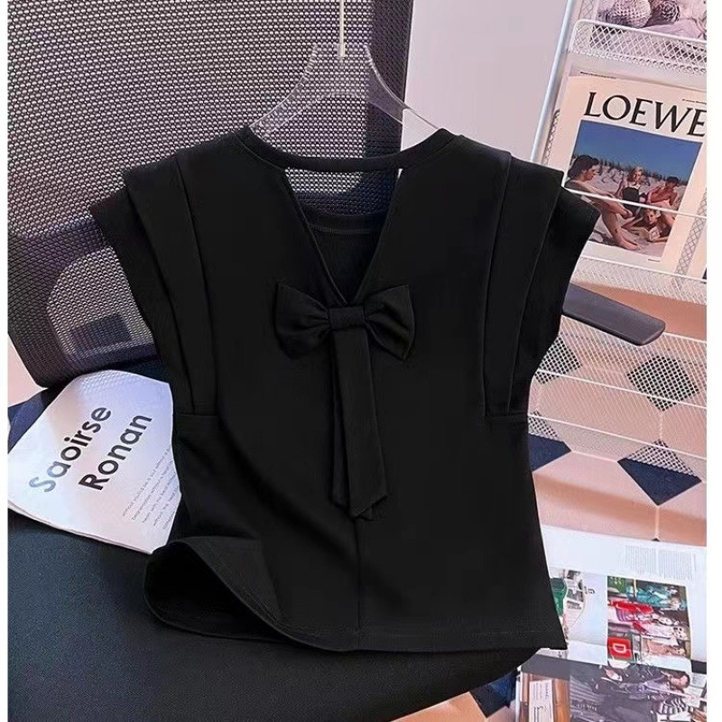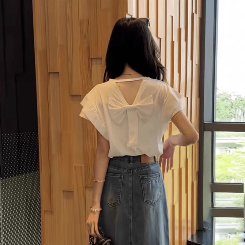 프랑스 스타일 달콤한 플라잉 슬리브 티셔츠 여성 2024 년 여름 새 활 빈 세련된 아름다운 작은 탑스토어 가기