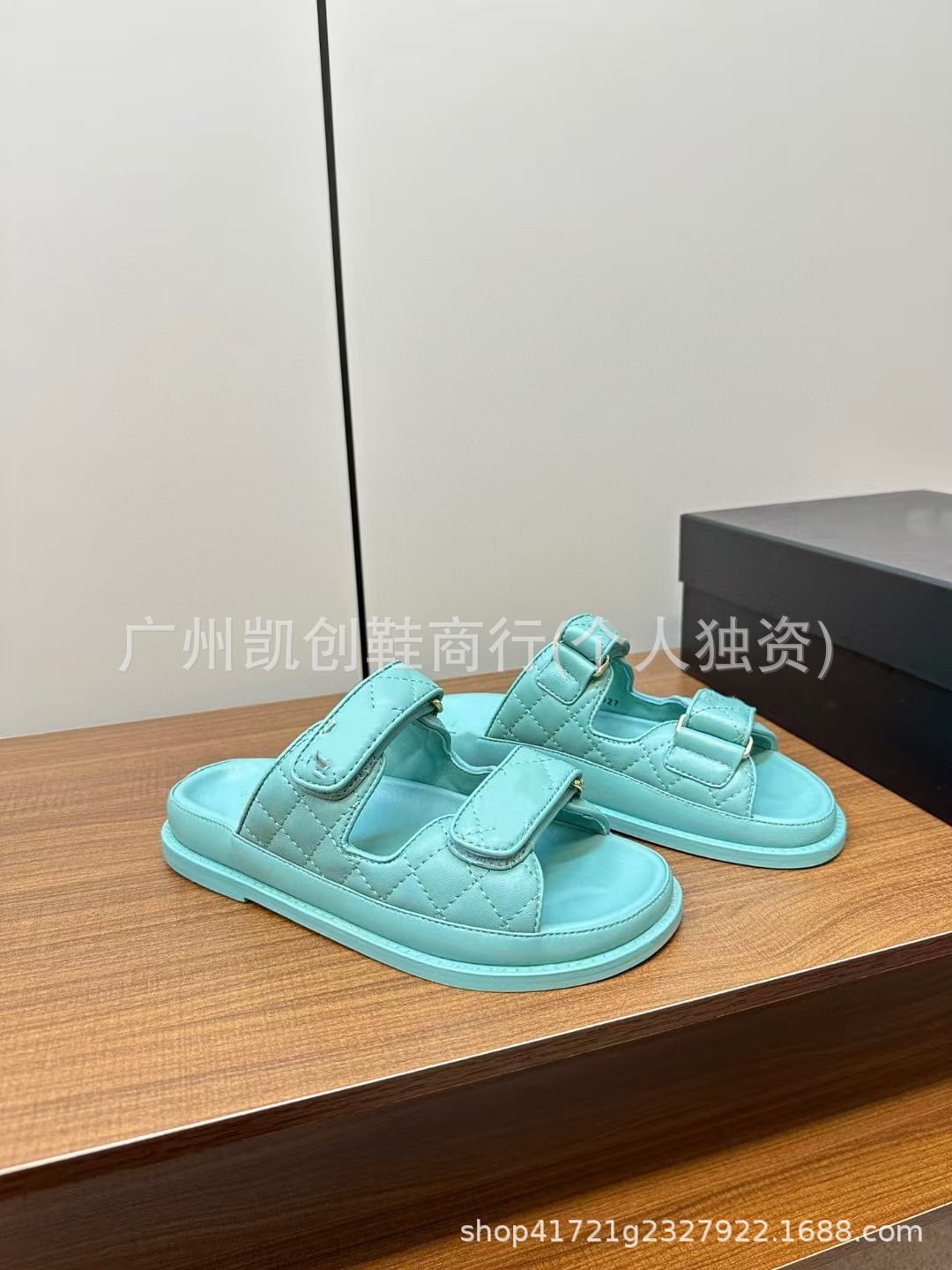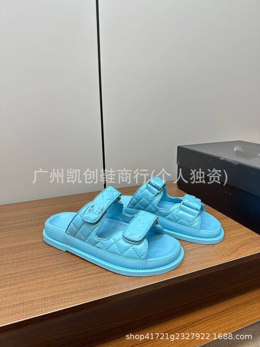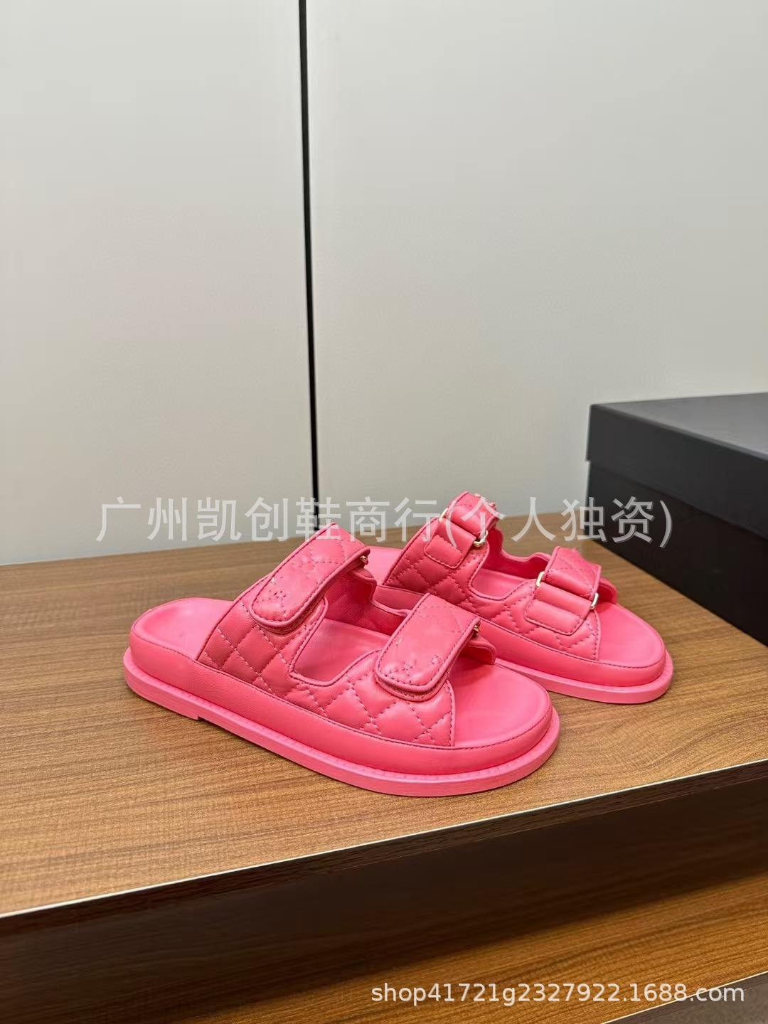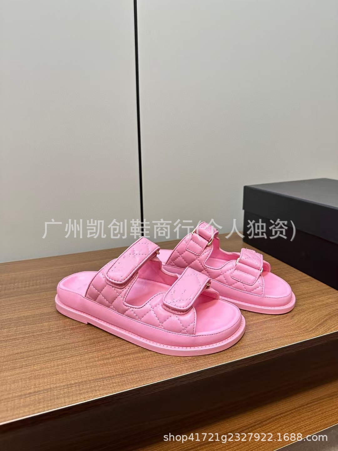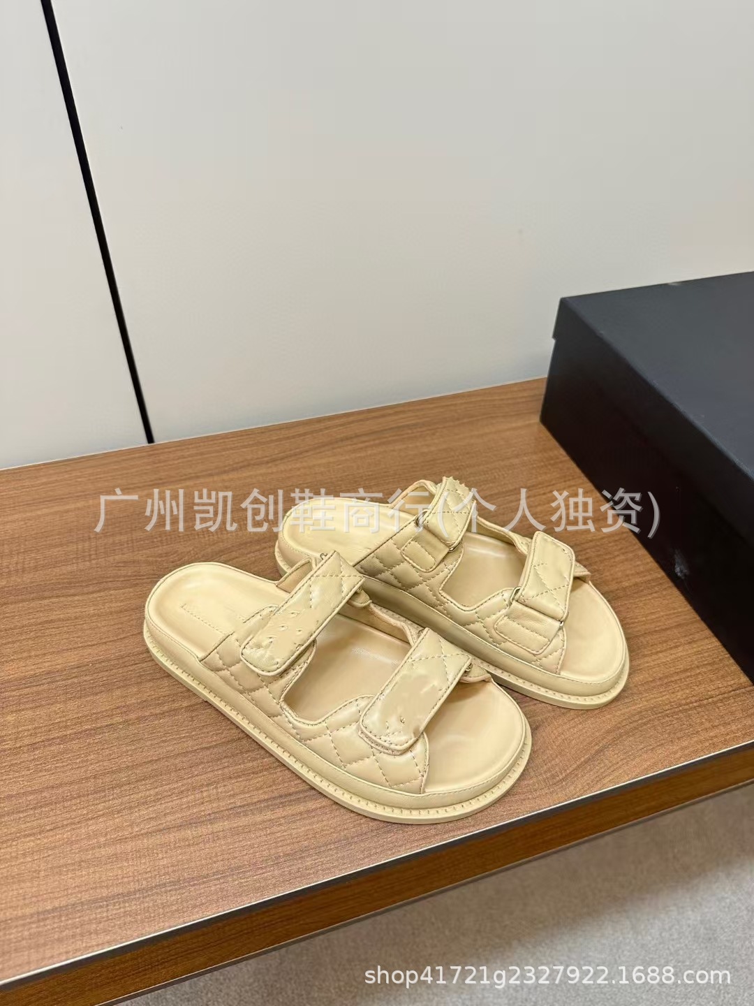 유럽과 미국의 2025년 새로운 여름 스타일 샤오샹 스타일 샌들, 마름모 겉옷 오픈 토 매직 테이프 플랫 비치 슬리퍼