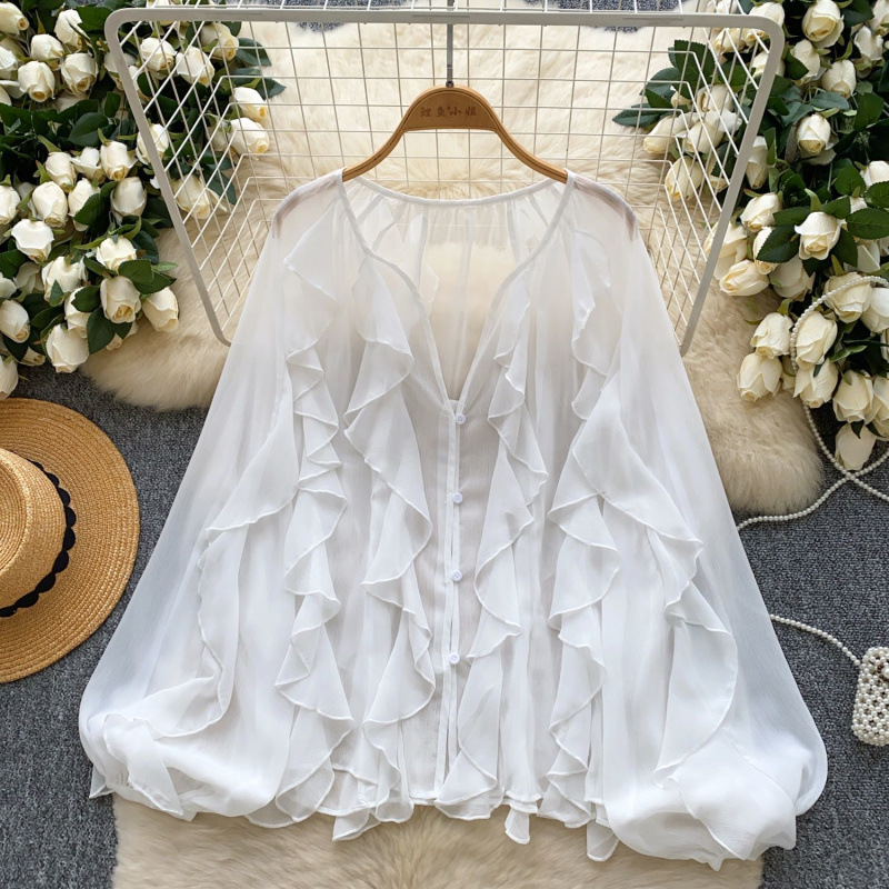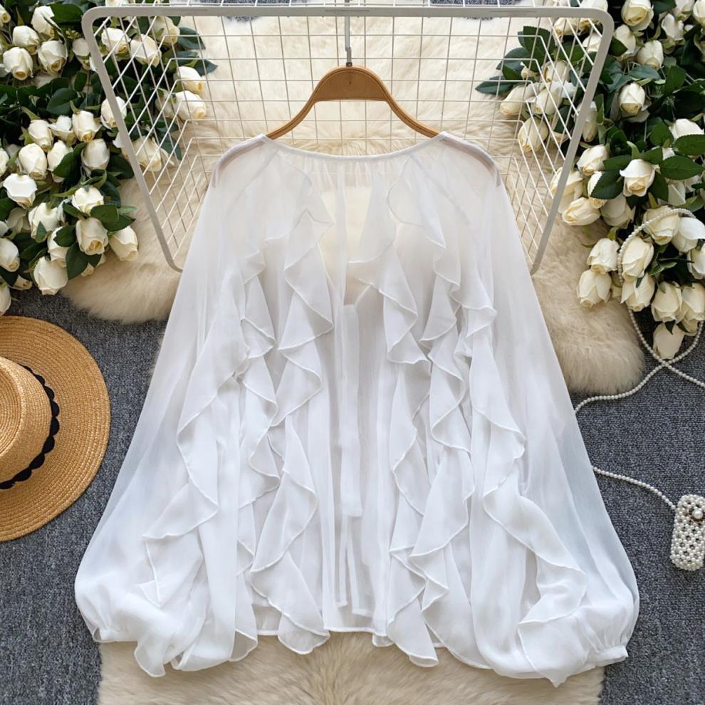 페어리 톱 2025 새로운 프랑스 분위기 센스 다층 귀 가장자리 셔츠 얇은 관점 풀오버 시폰 카디건스토어 가기
