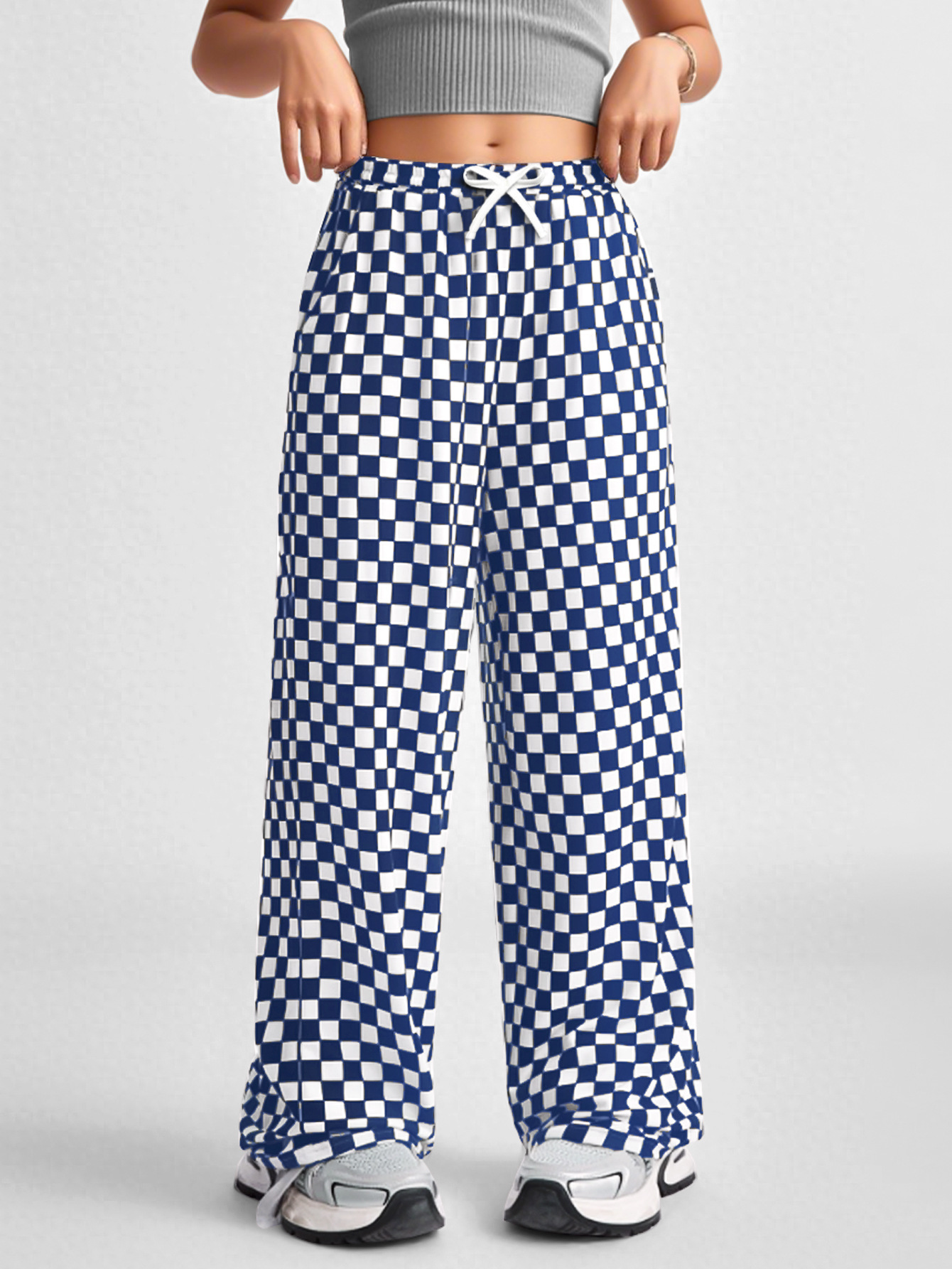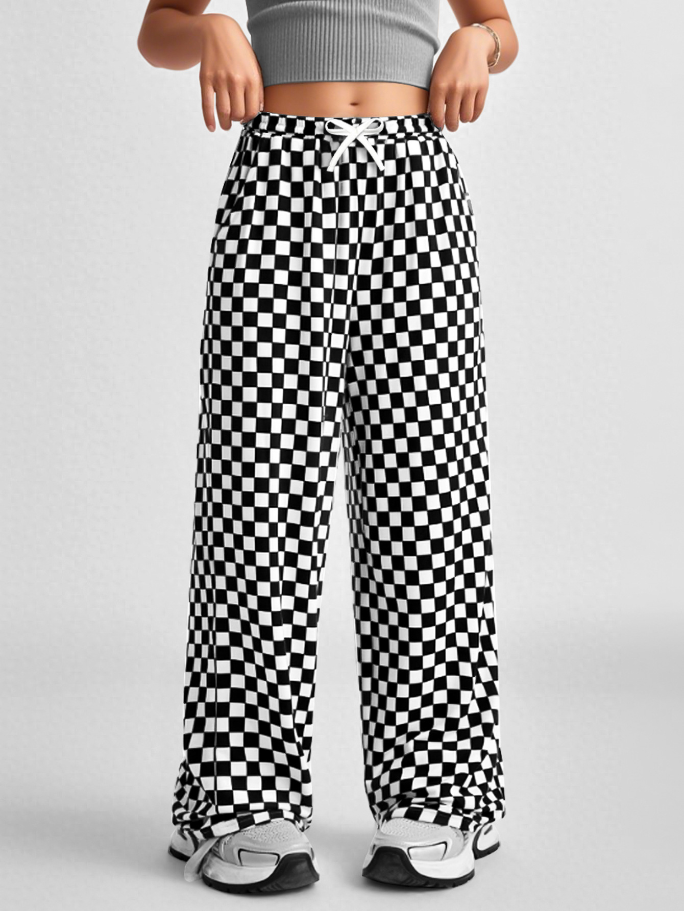 Zhongda 여자 바둑판 격자 무늬 인쇄 캐주얼 느슨한 넓은 다리 바지 탄성 허리띠 디자인 통기성 여성 바지