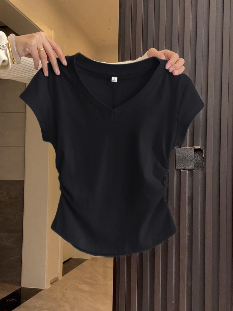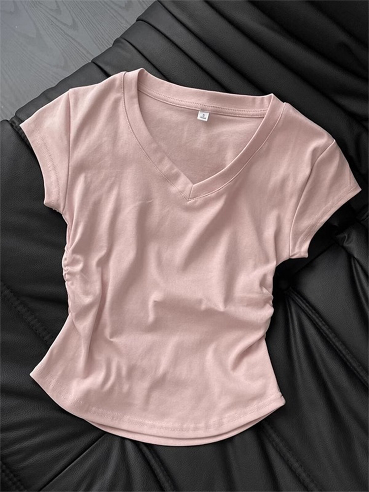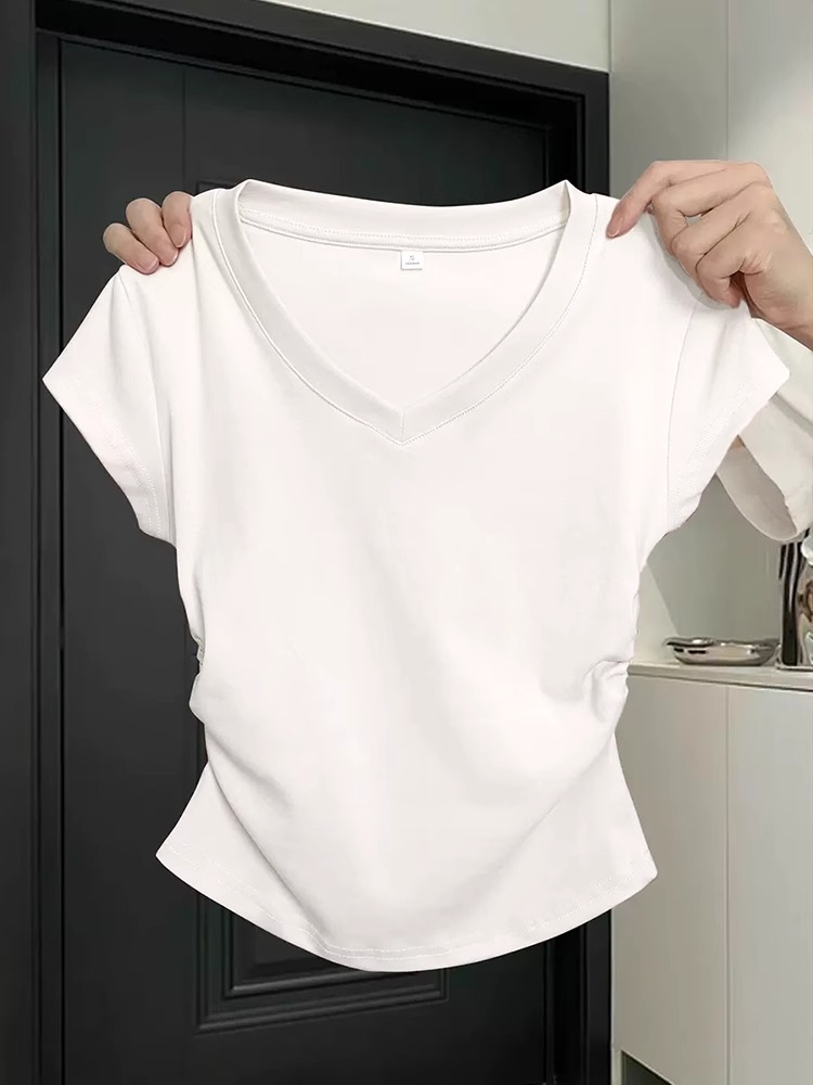 92 코튼 블루 숄더 반팔 티셔츠 여성용 여름 슬림 핏 슬리밍 서양식 플리츠 허리 쇼트 티셔츠 탑