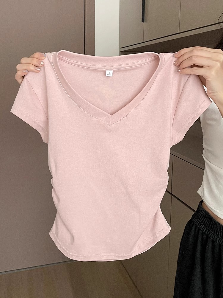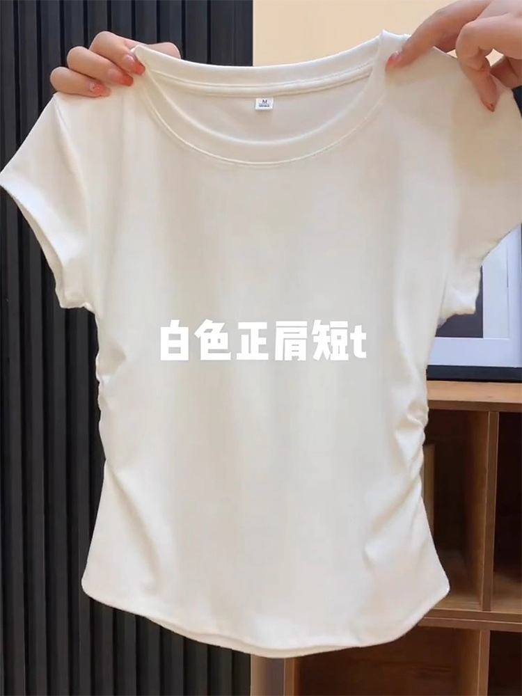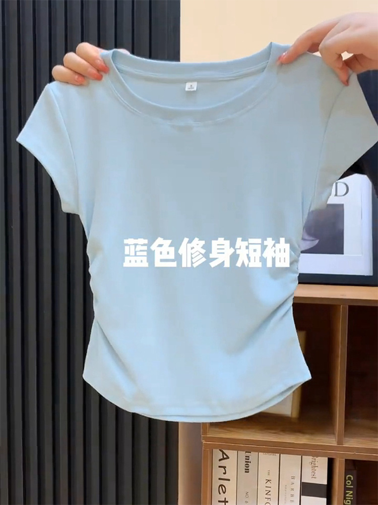 92 코튼 블루 숄더 반팔 티셔츠 여성용 여름 슬림 핏 슬리밍 서양식 플리츠 허리 쇼트 티셔츠 탑스토어 가기