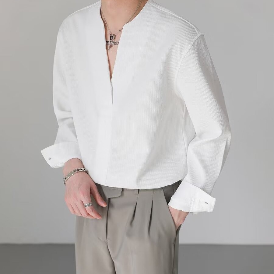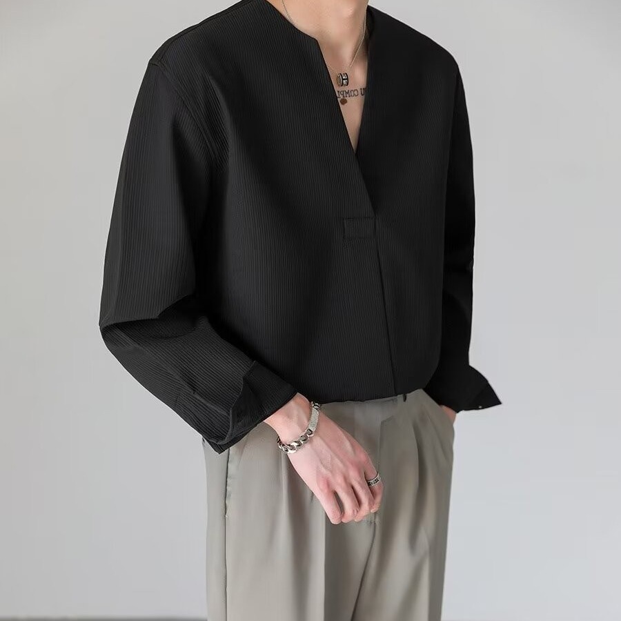 가을 트렌디 브랜드 Handsome V 칼라리스 노아이론 셔츠 남성용 가벼운 럭셔리 및 하이엔드 한국 루즈 풀오버 긴팔 셔츠