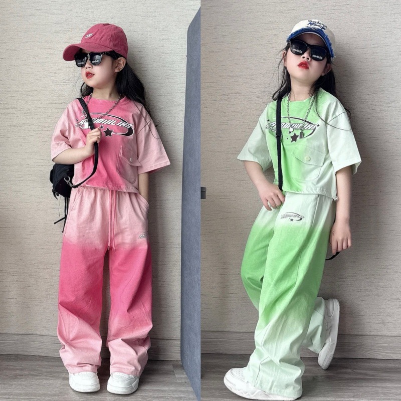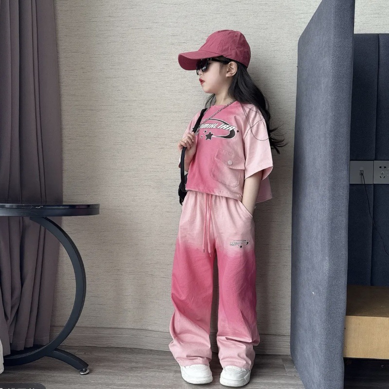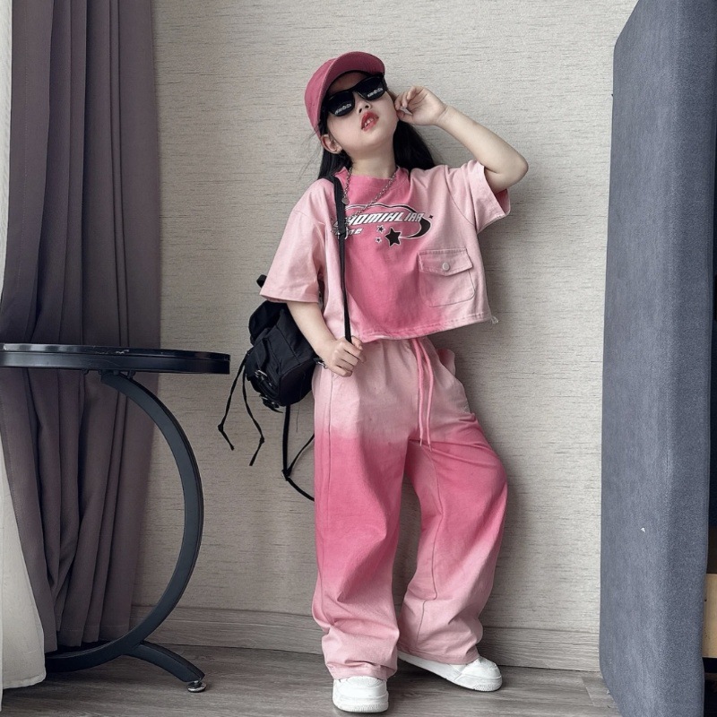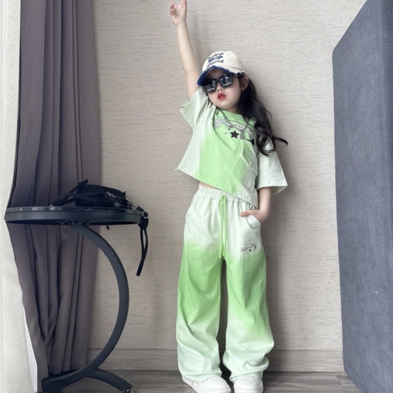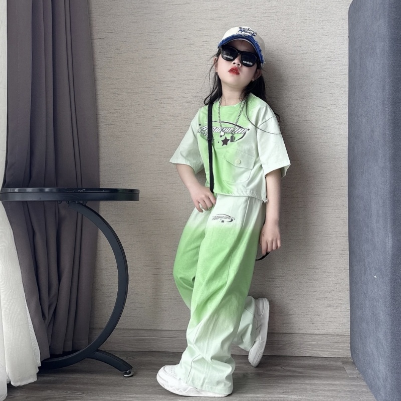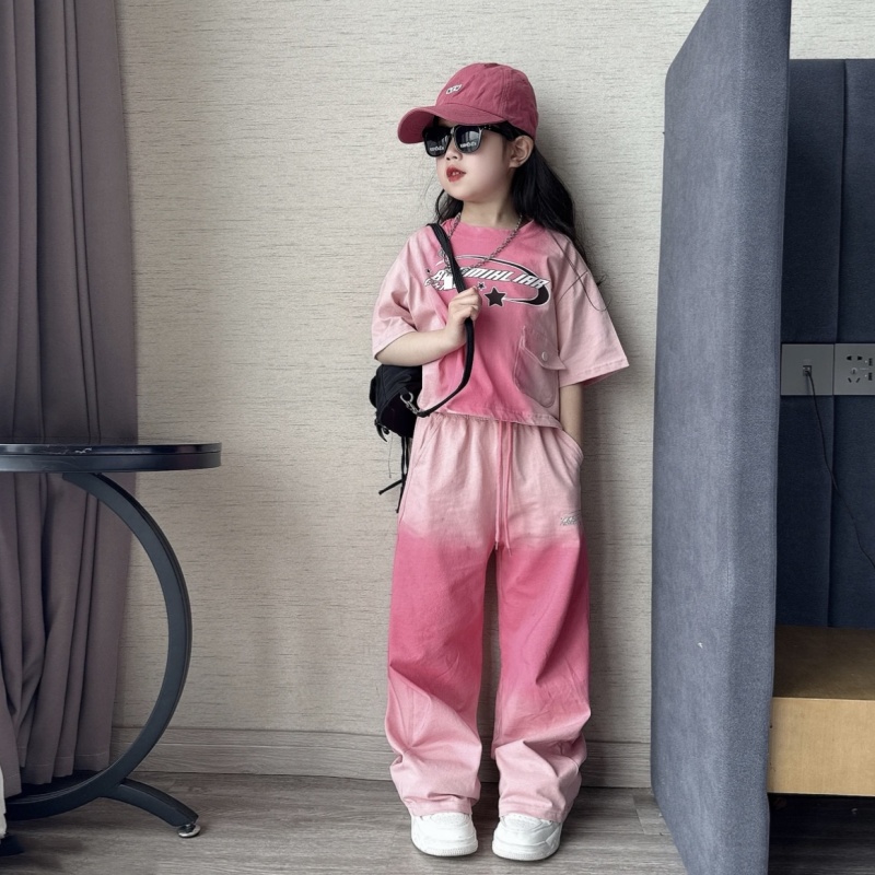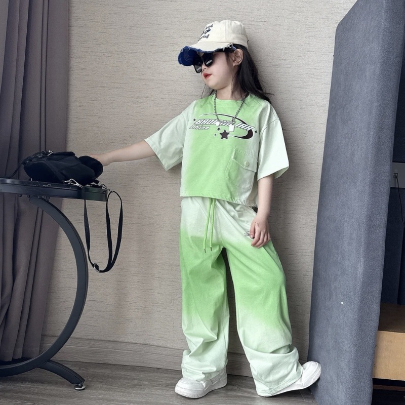 소녀 여름 서양식 그라디언트 컬러 스프레이 염색 중대형 어린이 넥타이 염색 짧은 드로우 스트링 티셔츠 스트레이트 다리 바지 세트스토어 가기
