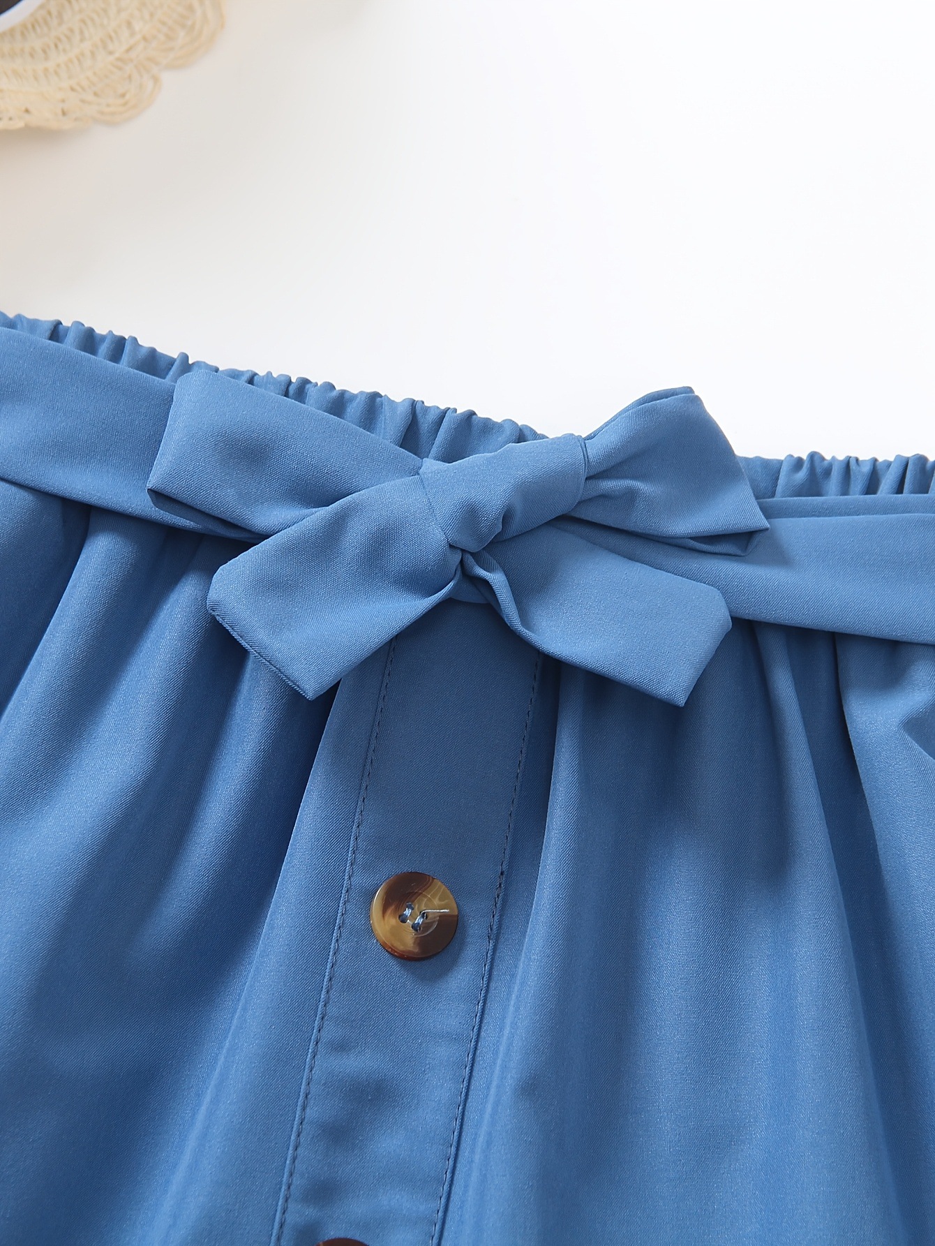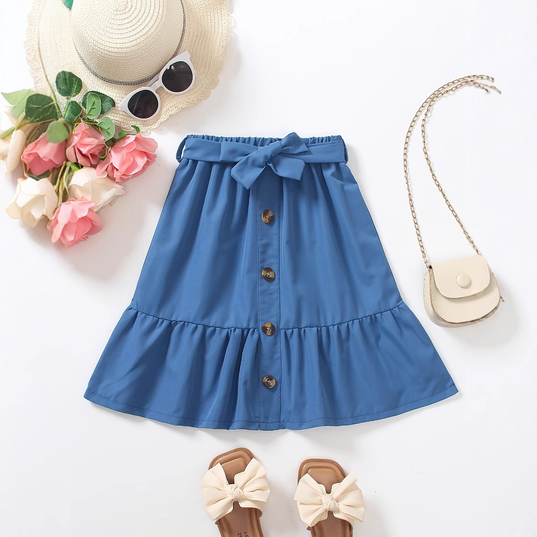 여아 패션 캐주얼 다용도 벨트 버튼 스트레이트 레이어 프릴 솔리드 컬러 레이스 업 신축성 있는 허리 A라인 스커트 하프 길이