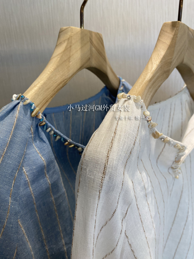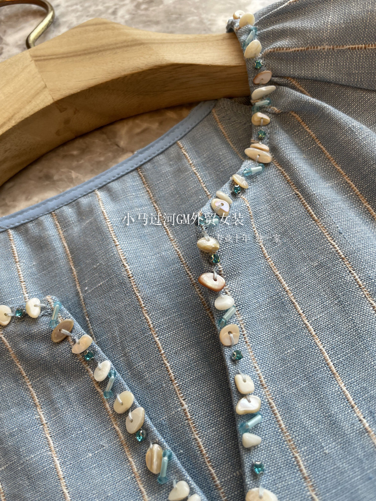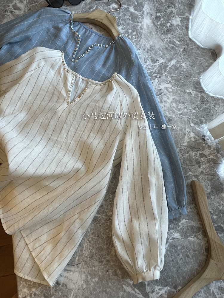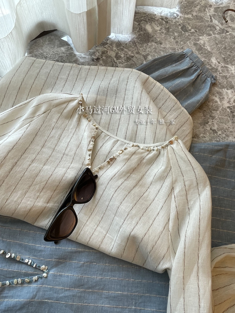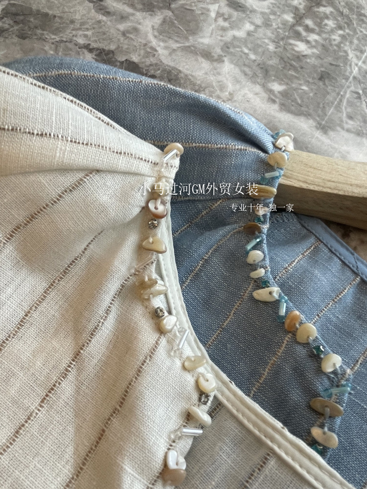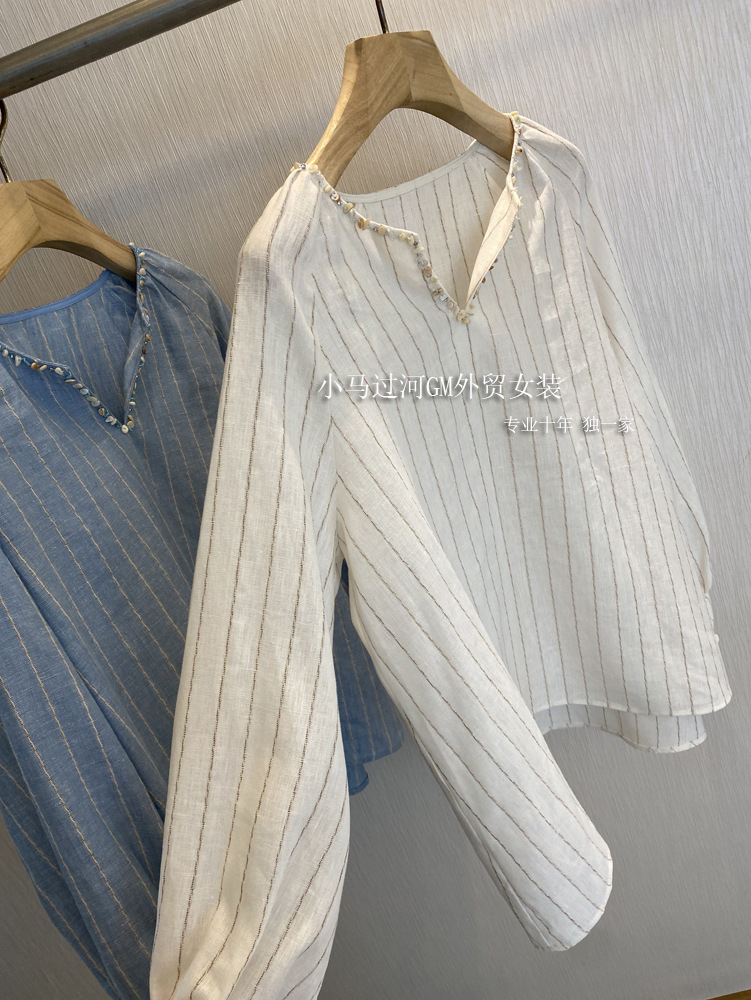 화난 푸시!! 상체는 매우 리프트 기질, 차가운 느낌 느슨한 린넨 스트링 쉘 비즈 V 칼라 수직 스트립 셔츠 여성 봄입니다