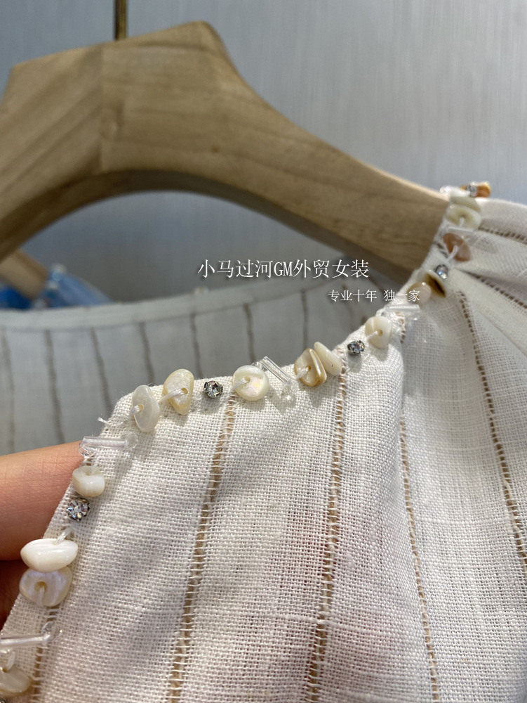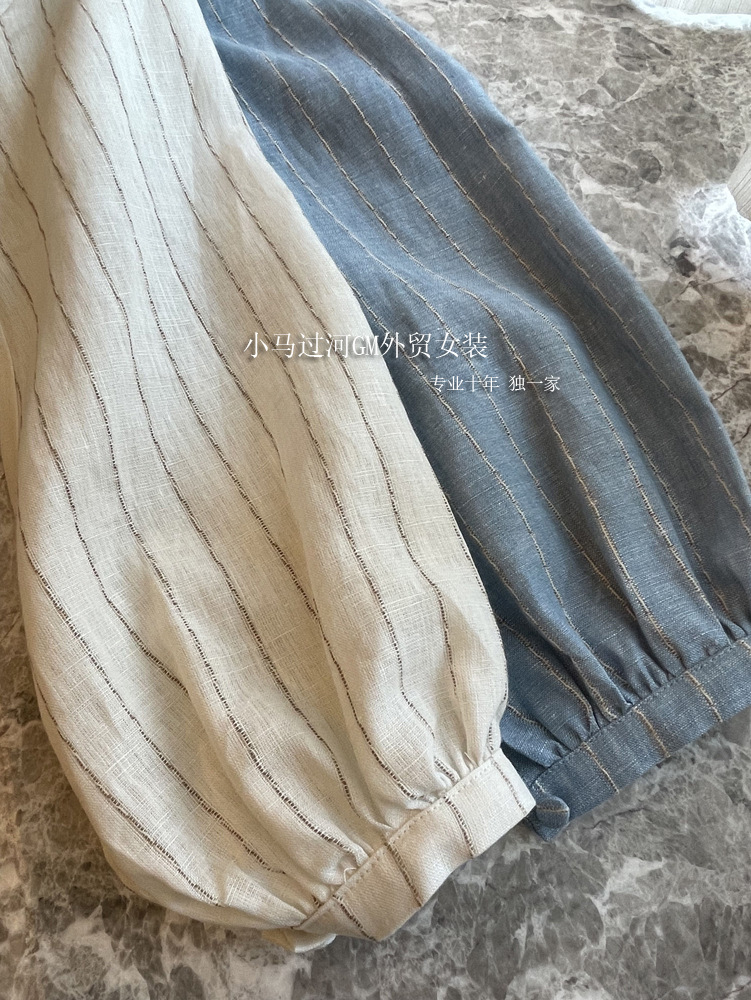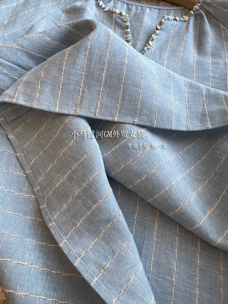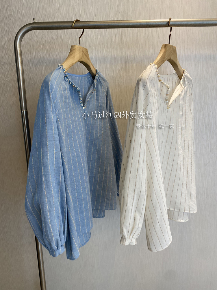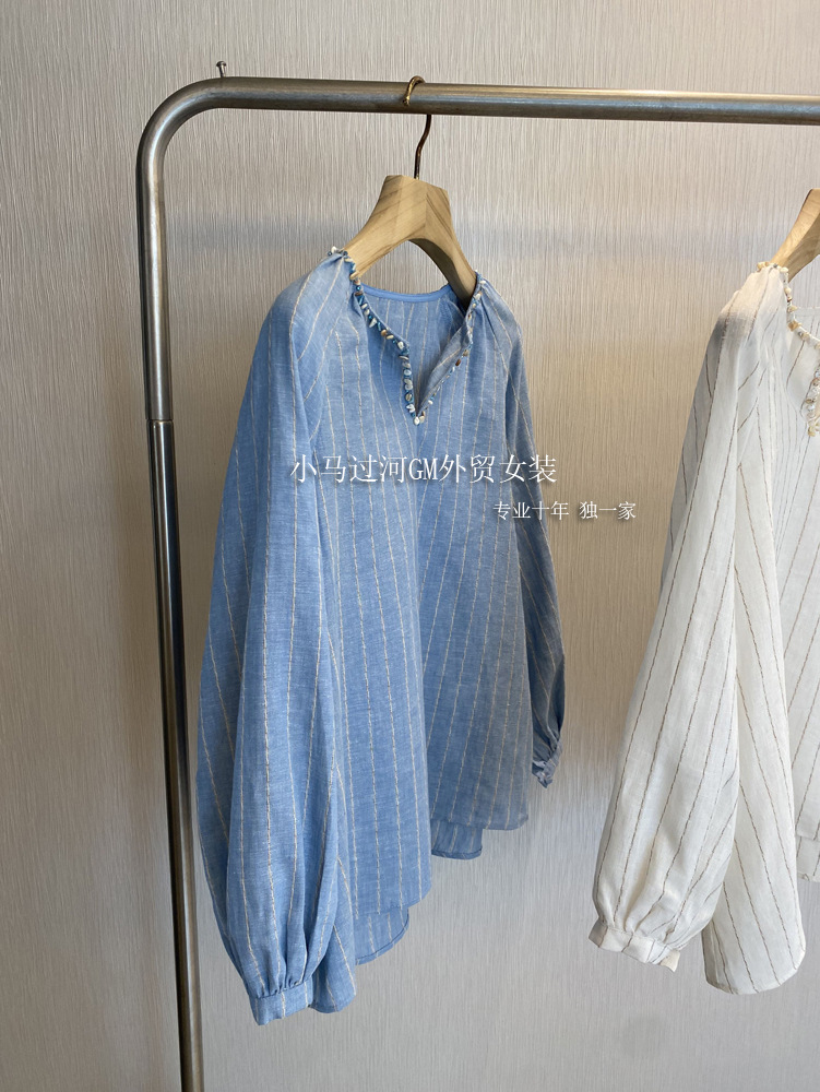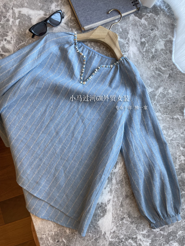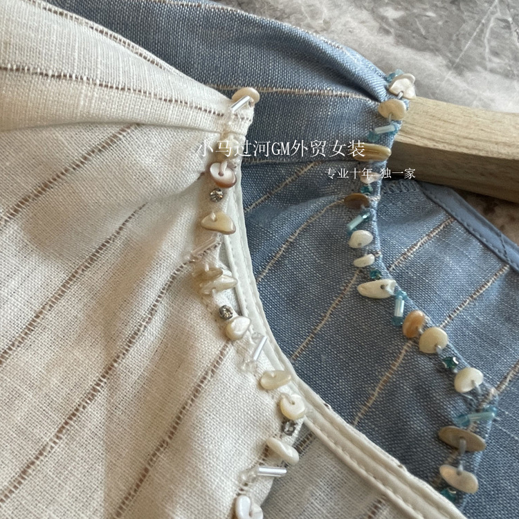 화난 푸시!! 상체는 매우 리프트 기질, 차가운 느낌 느슨한 린넨 스트링 쉘 비즈 V 칼라 수직 스트립 셔츠 여성 봄입니다