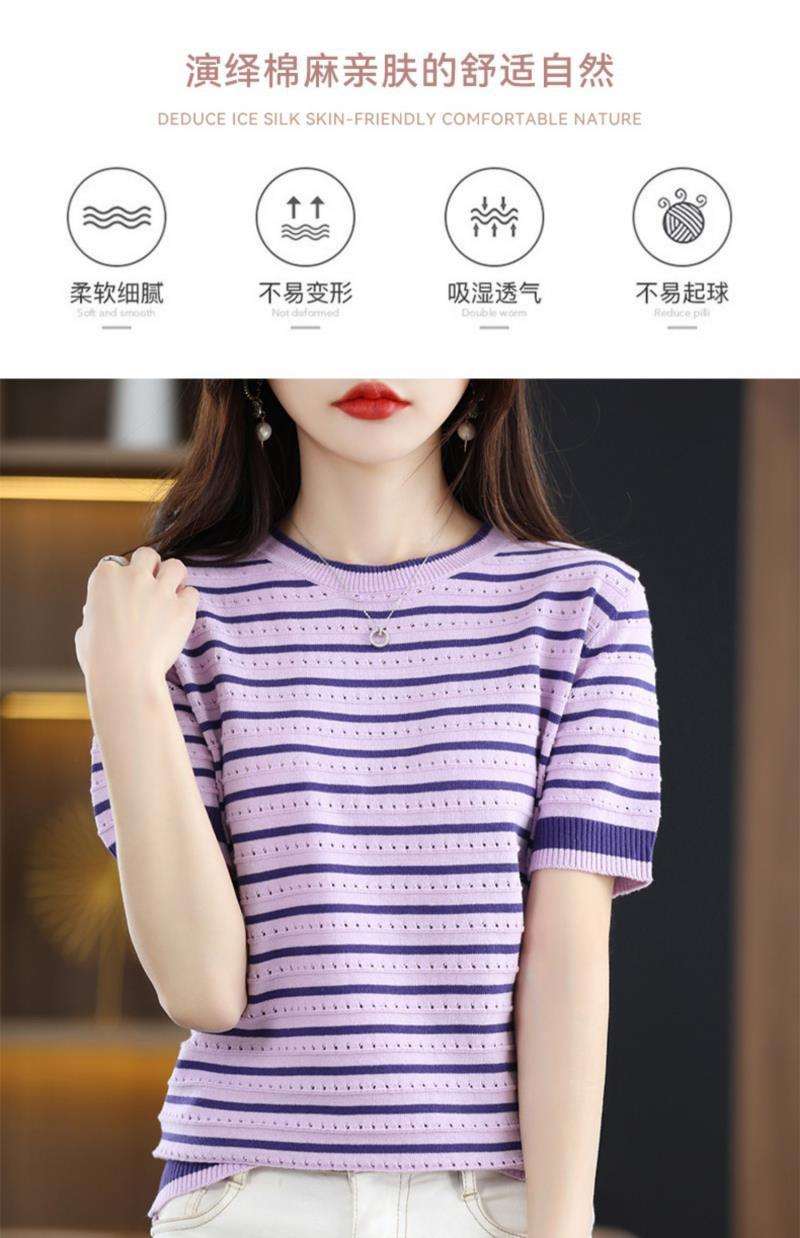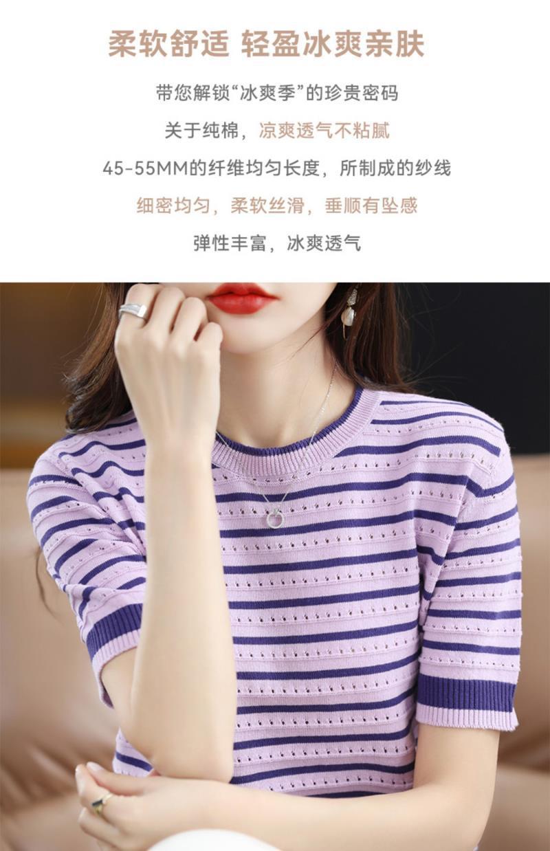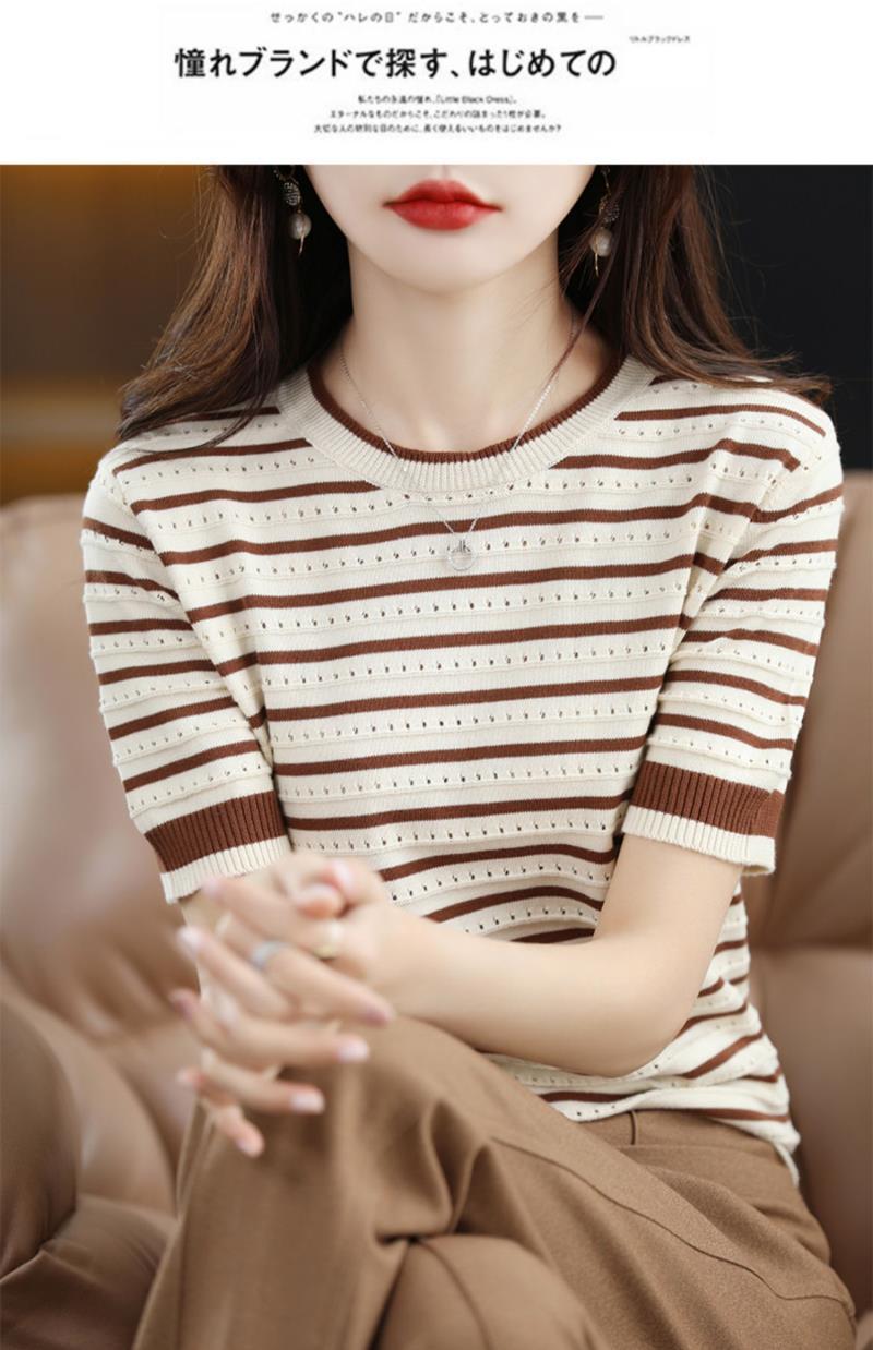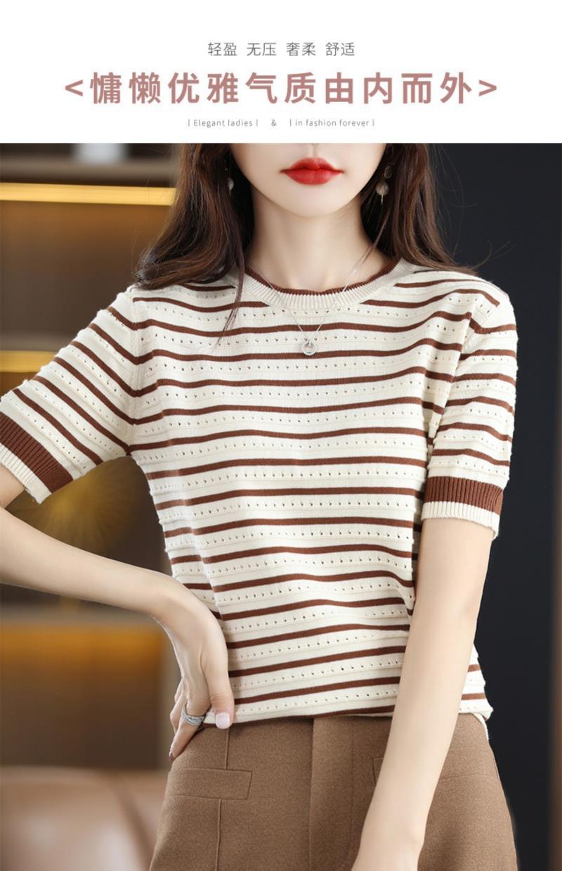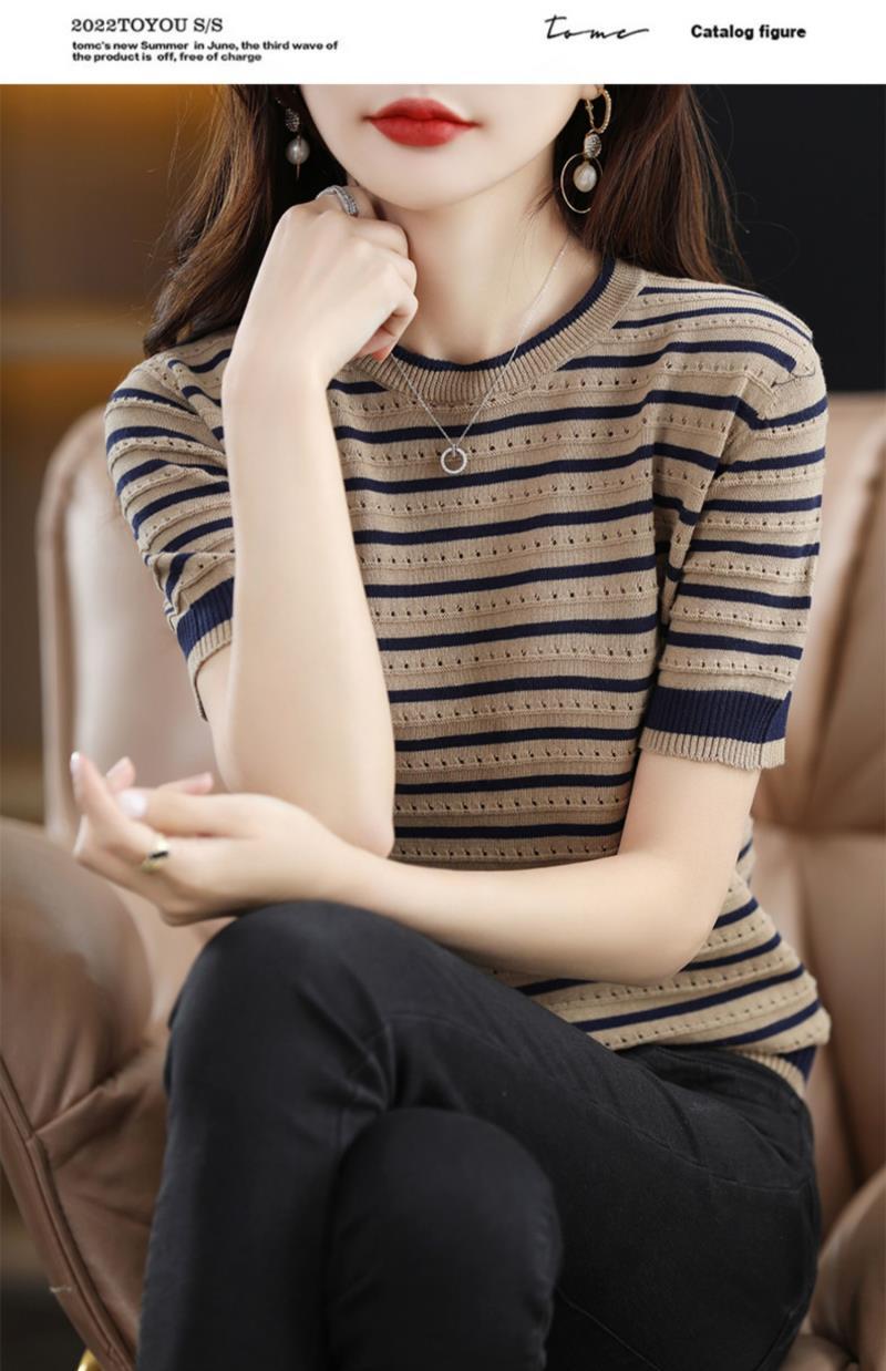 패셔너블한 인터넷 연예인 패션 반팔 티셔츠 여성 2023 여름 얇은 스웨터 새로운 라운드 넥 스트라이프 반팔스토어 가기