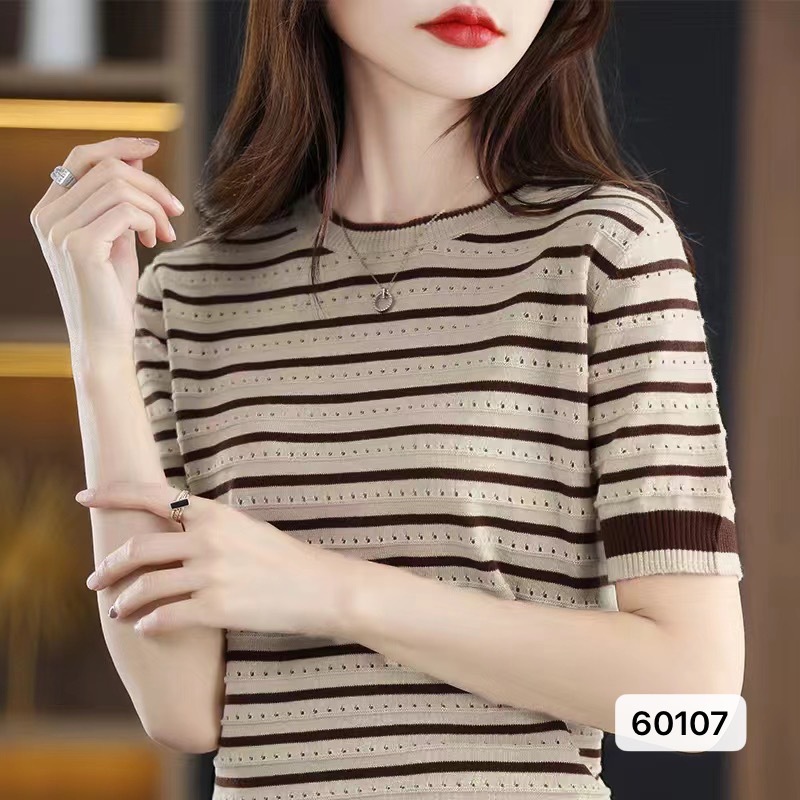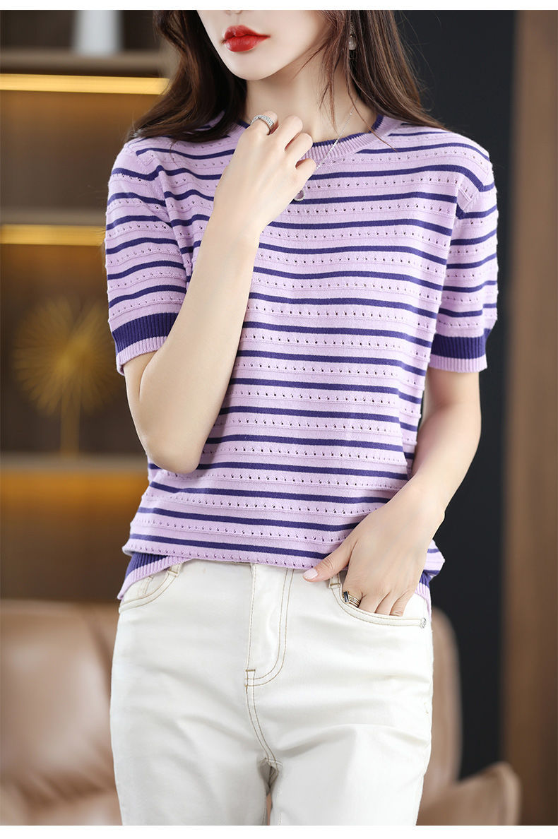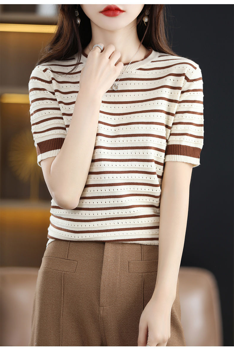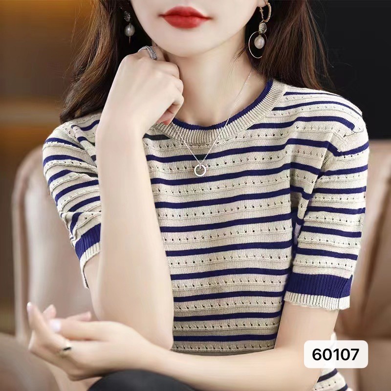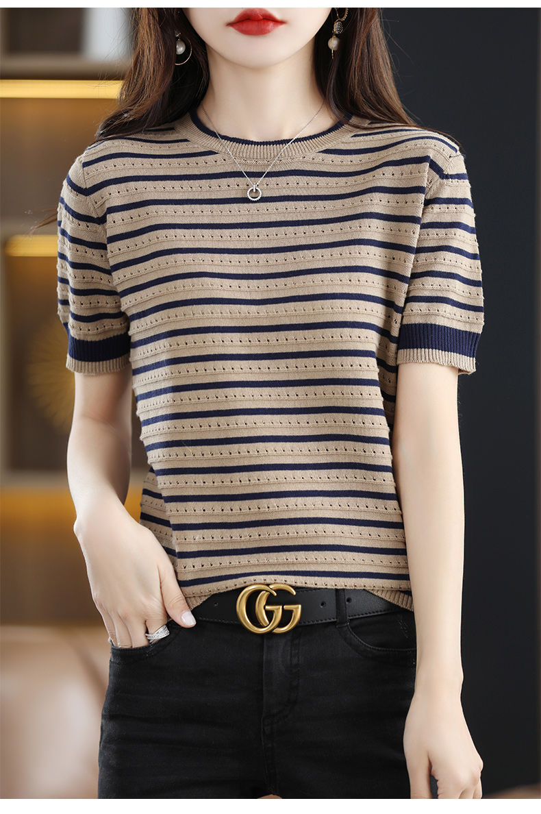 패셔너블한 인터넷 연예인 패션 반팔 티셔츠 여성 2023 여름 얇은 스웨터 새로운 라운드 넥 스트라이프 반팔스토어 가기