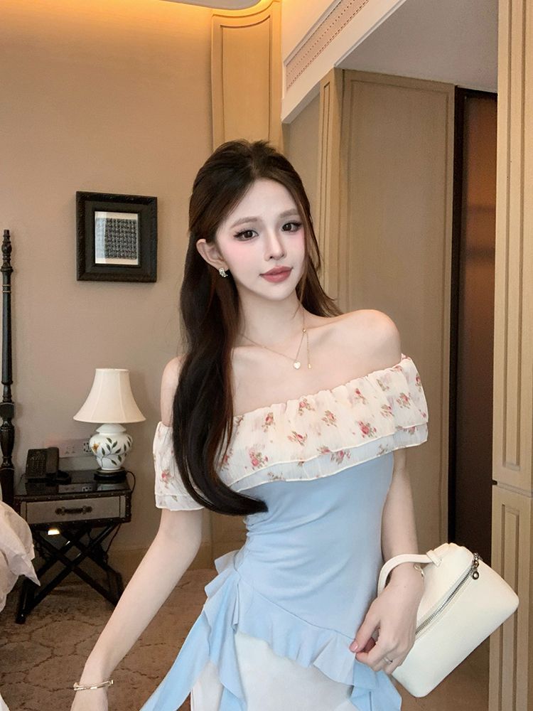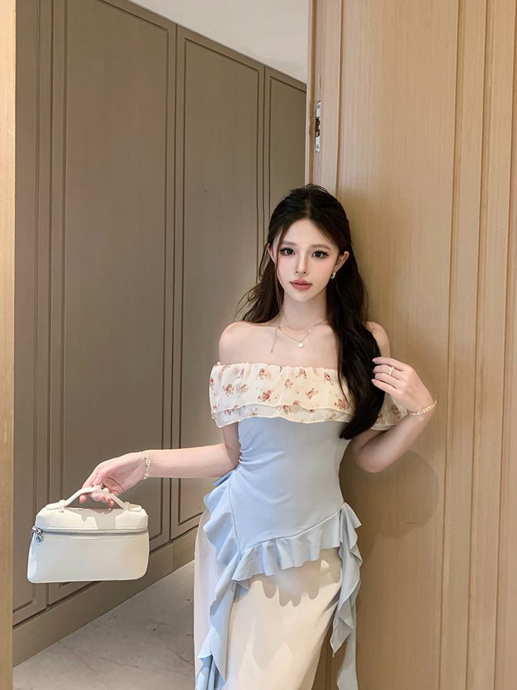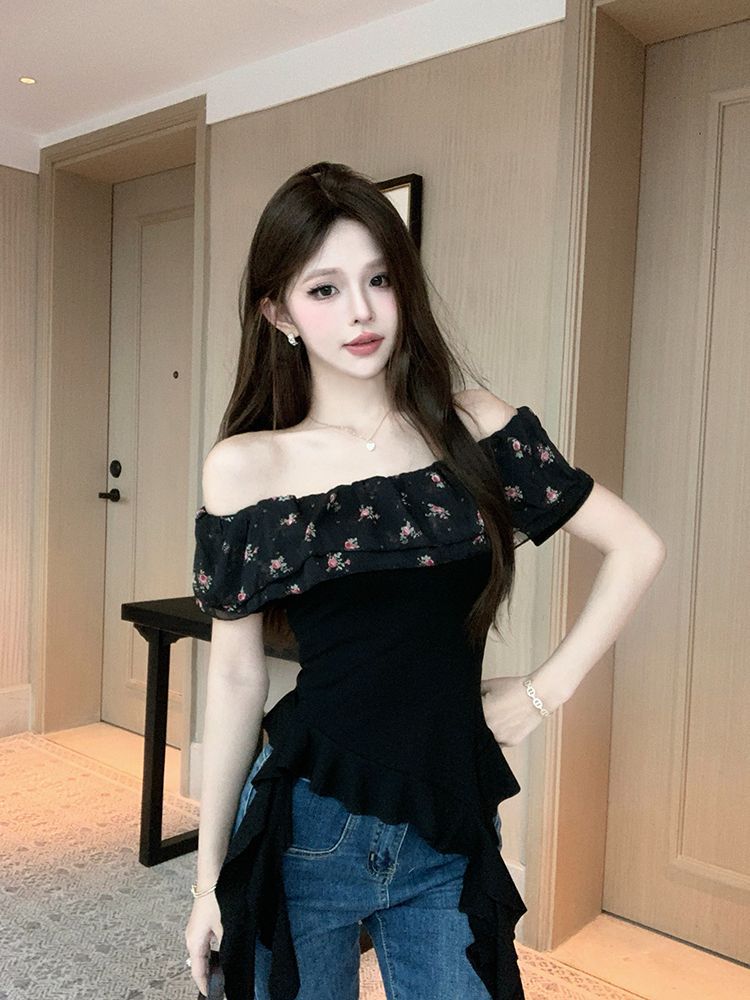 프랑스 스타일 러플 숄더 탑 여성 여름 디자인 불규칙한 핫 걸 슬림 핏 짧은 세련된 반팔 티셔츠