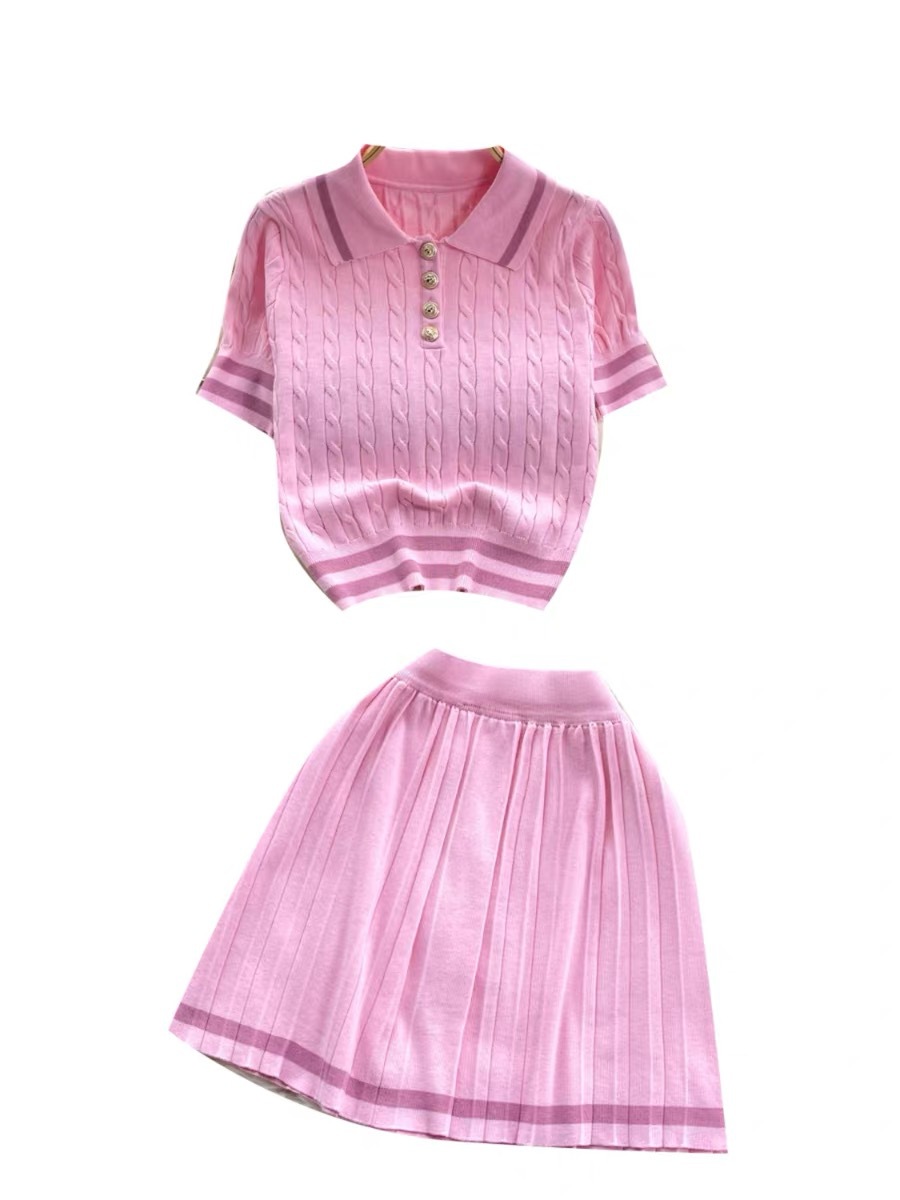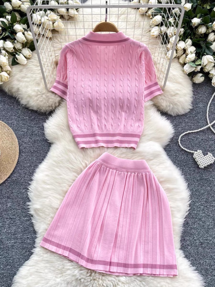 여름 새로운 올 매치 스웨터 투피스 세트 여자 레트로 콘트라스트 반팔 탑 하이 웨이스트 플리츠 스커트스토어 가기