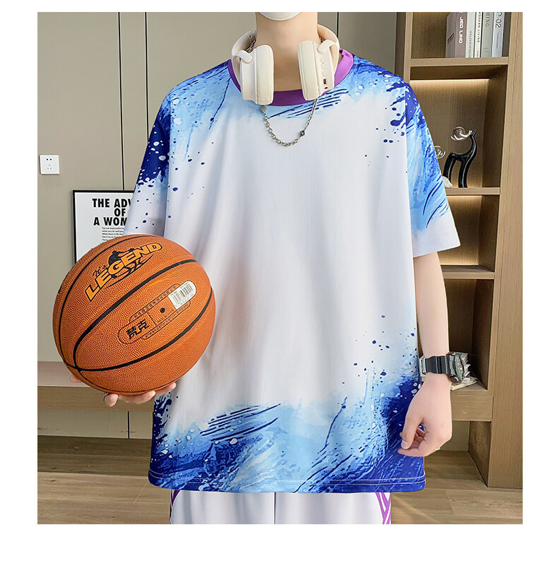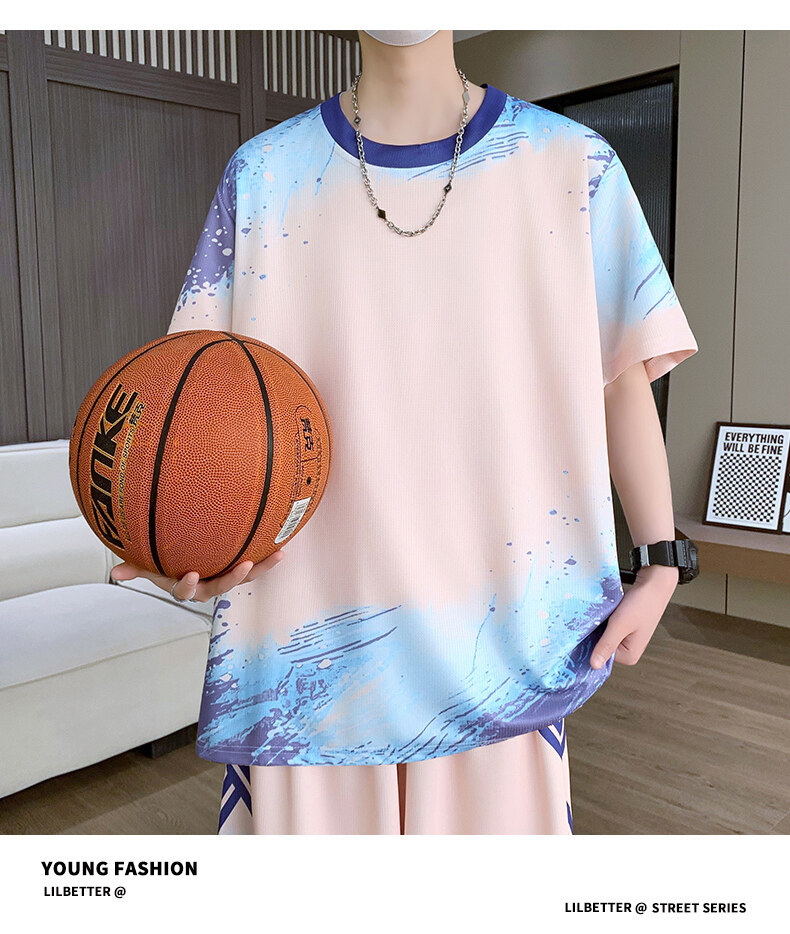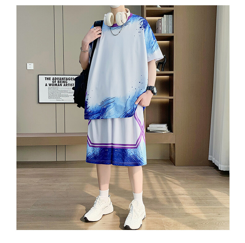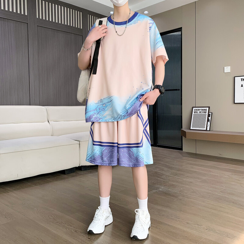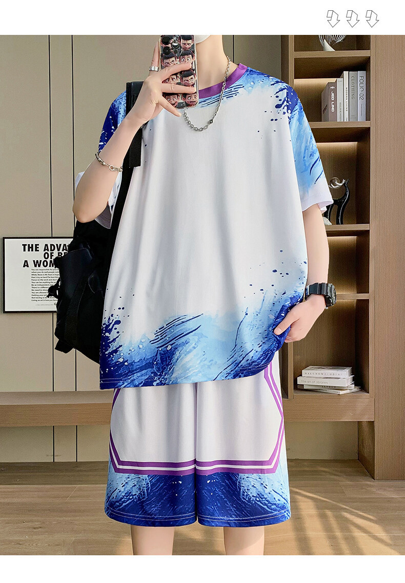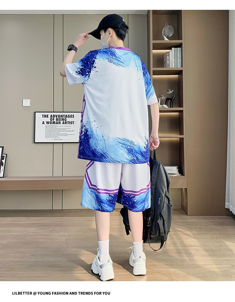 여름 반소매 스포츠 세트 십대 남성 느슨한 빠른 건조 옷 절반 길이 바지 대비 컬러 투피스 학생 농구 옷스토어 가기